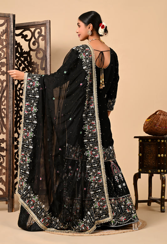 Graceful Dark Black Sharara Set with Excellent Work and Embroidery