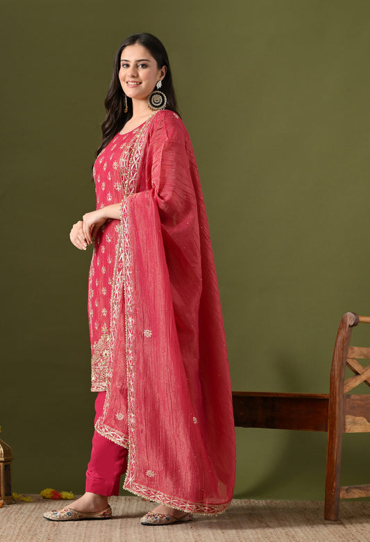 Hot Pink Crepe & Banarasi Silk Thread–Zardozi Kurta Set
