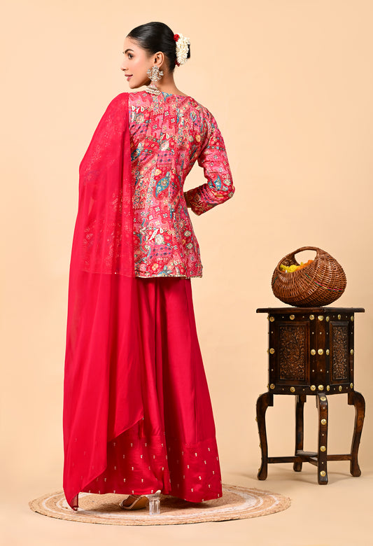 Reddish Pink Sharara Set with Peplum on Kurta and Thread Work