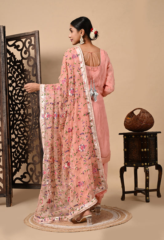 Dark Peach Kurta Set with Exceptional Parsi Thread and Crystal Work