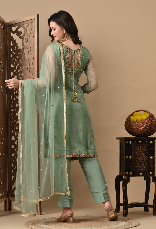 Subtle Light green Kurta Set with Beautiful Zardozi, Thread, and Sequin Work