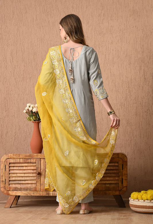 Stunning Light Grey Kurta Set with Beautiful Zardozi, Thread, Sequin, and Applique Work