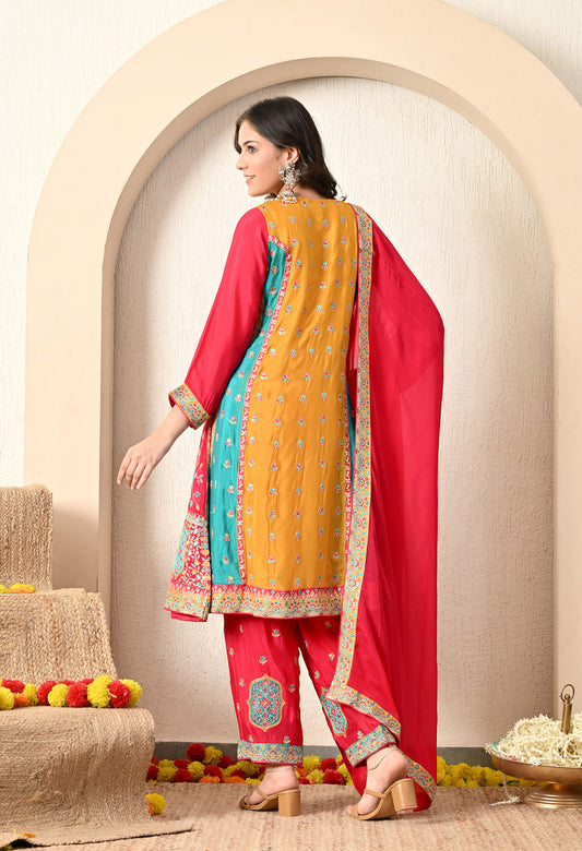 Golden Yellow Kurta Set with Zardozi, Thread, Pearl and Mirror Work