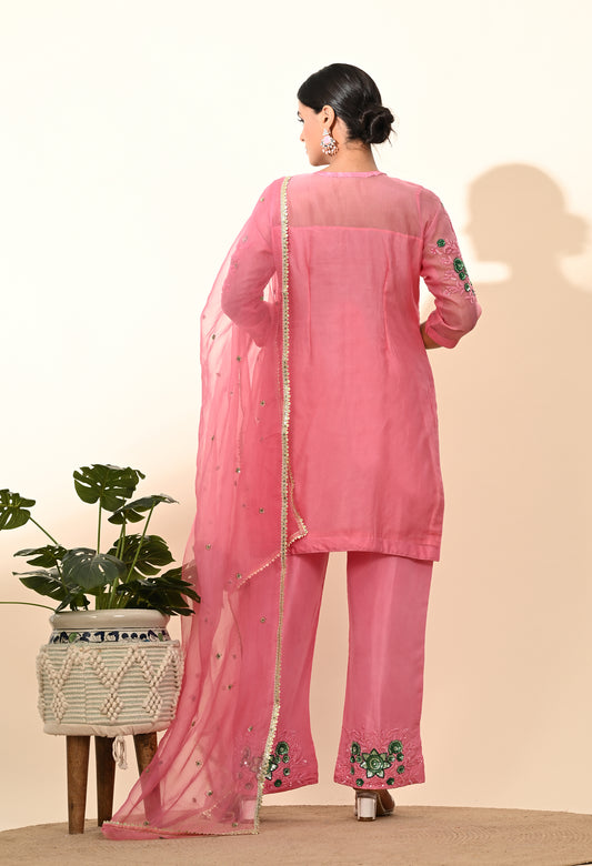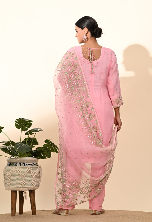 Elegant Onion Pink Organza Kurta Set with Sequin and Thread Embroidery
