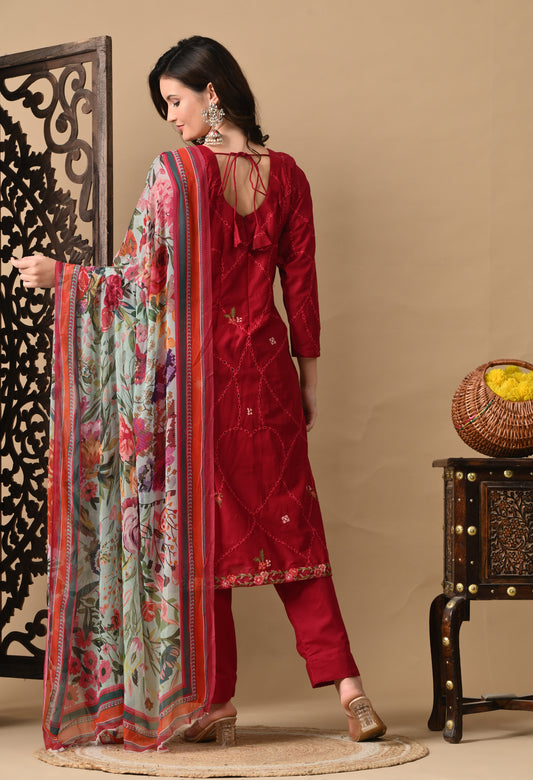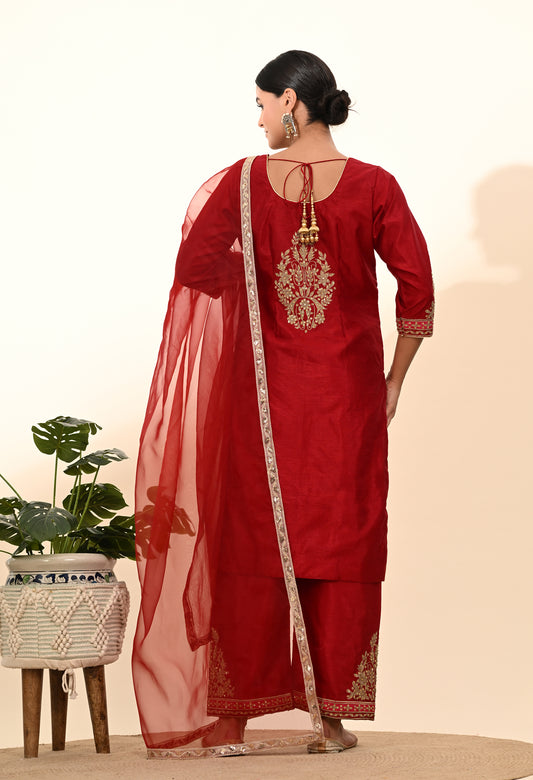 Deep Maroon Silk Kurta Set with Thread and Sequin Embroidery
