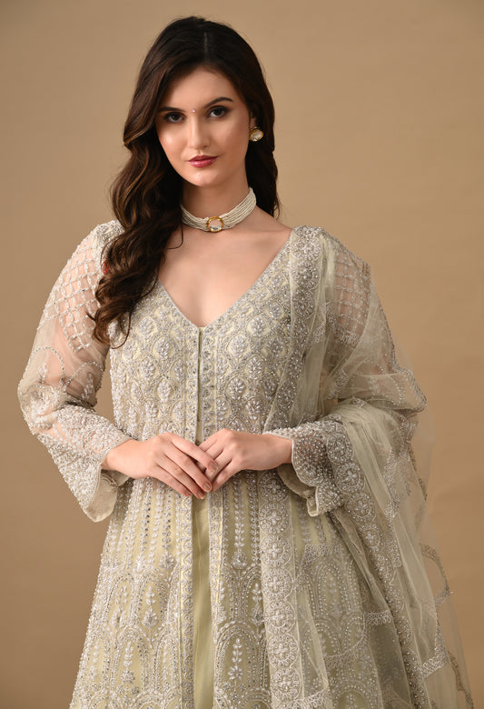 Greenish Cream Kurta Set with Zardozi, Thread, Sequin and Cutdana Work