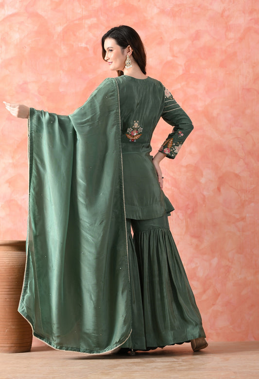 Green Thread Work Tissue Crepe Gharara Set