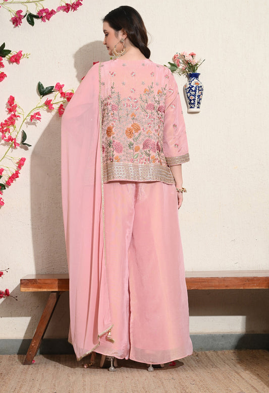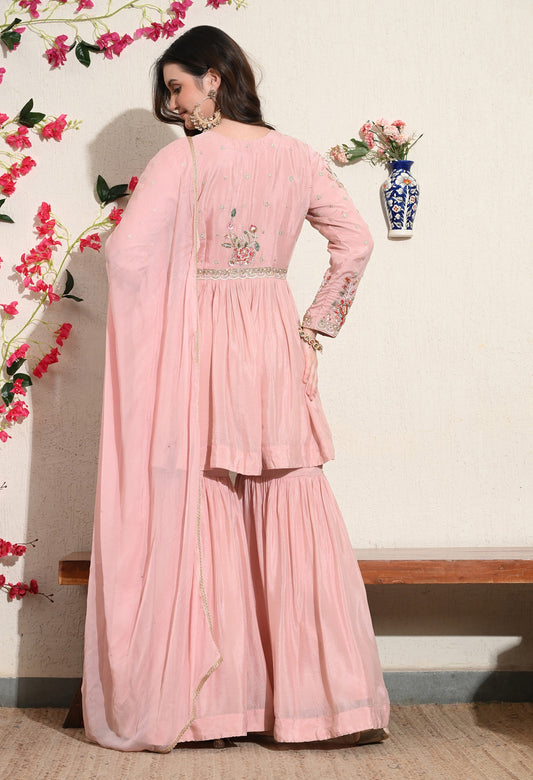 Peach Pink Chinon Sharara Set with Thread & Zardozi Work