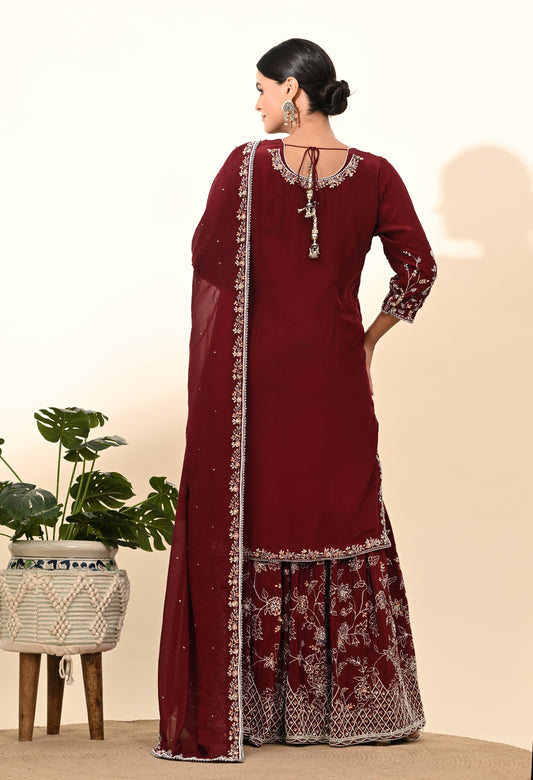 Rich Maroon Crepe Gharara Set with Thread and Sequin Embroidery