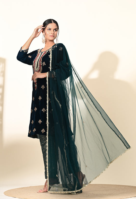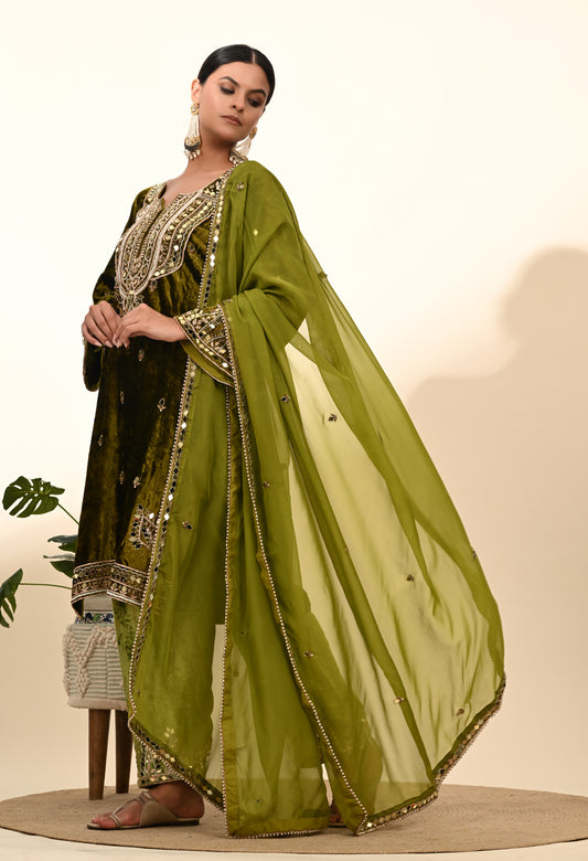 Elegant Mehndi Green Velvet Kurta Set Featuring Zardozi Embroidery