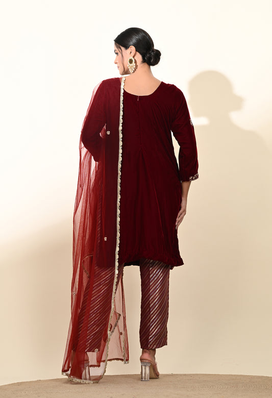Elegant Pink Wine Velvet Kurta Set with Zardozi, Gota Patti, and Pearl Embroidery