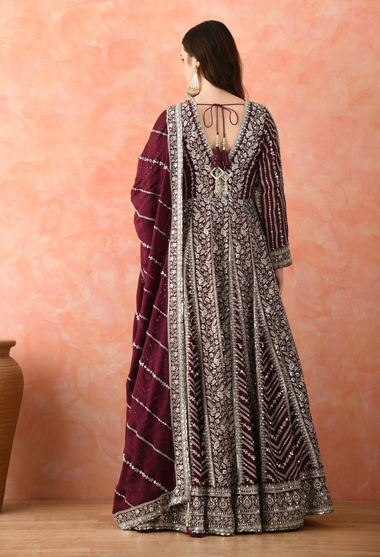 Dark Wine Anarkali with Zardozi and Sequin Work