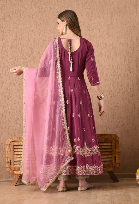 Ravishing Pinkish Wine Anarkali Set with Zardozi and Sequin Work