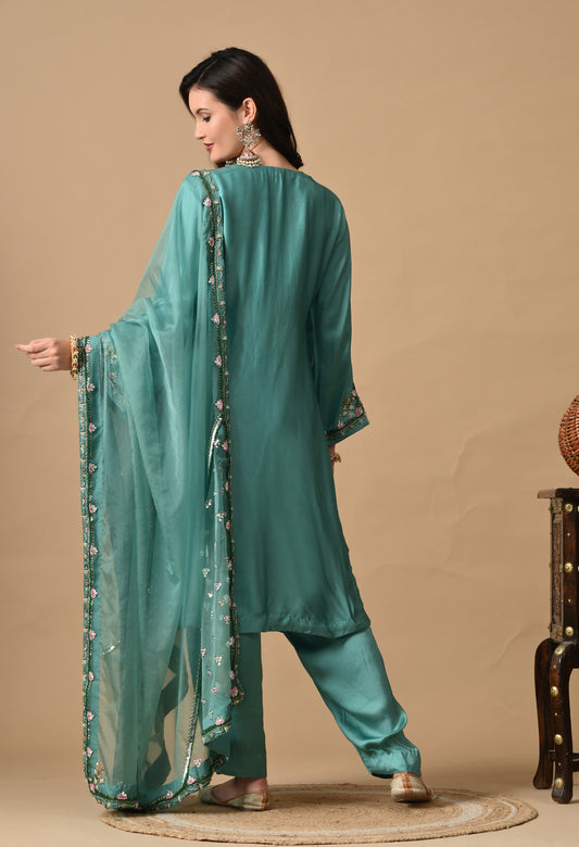 Green Satin Silk Kurta Set with Zardozi and Pearls