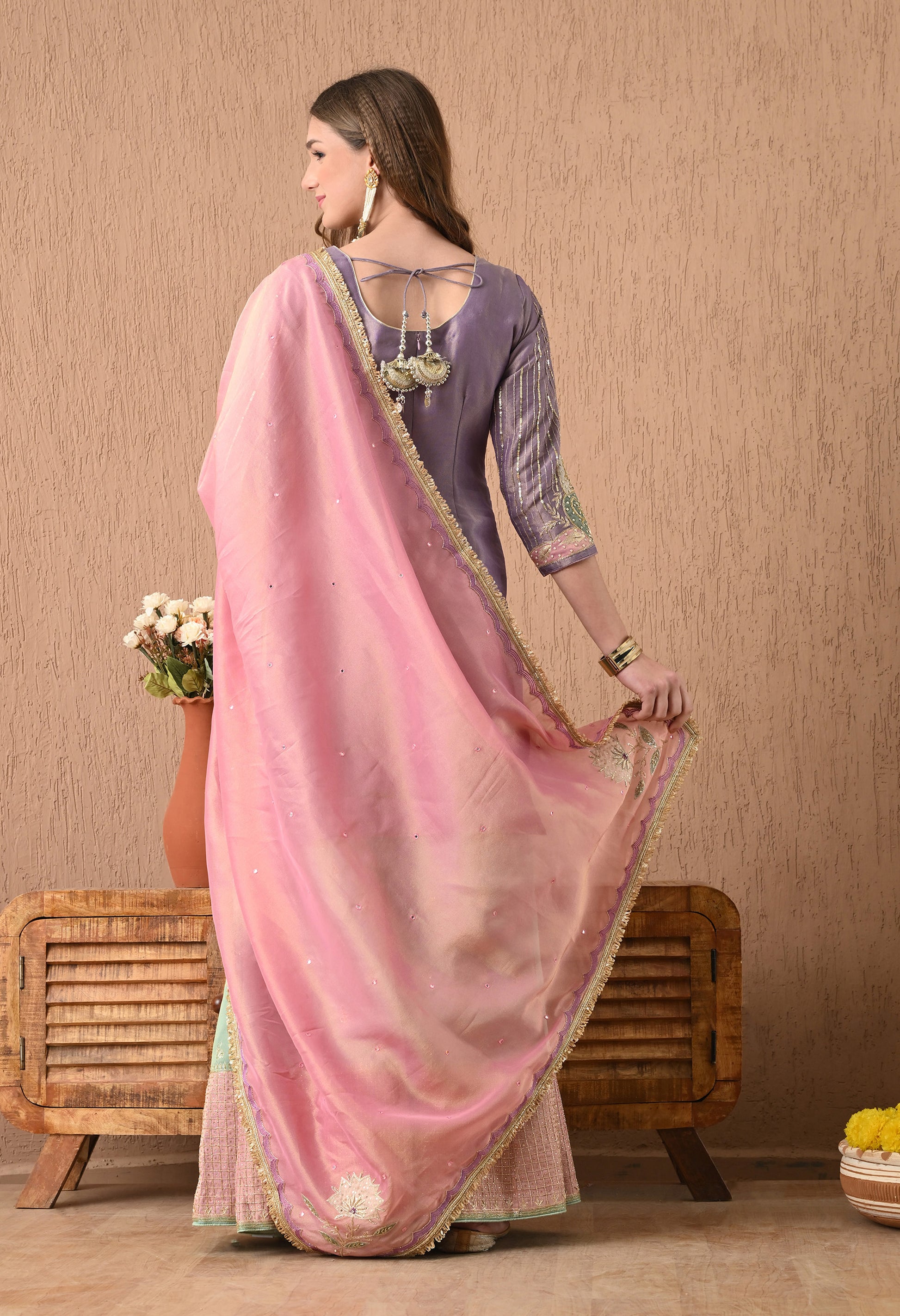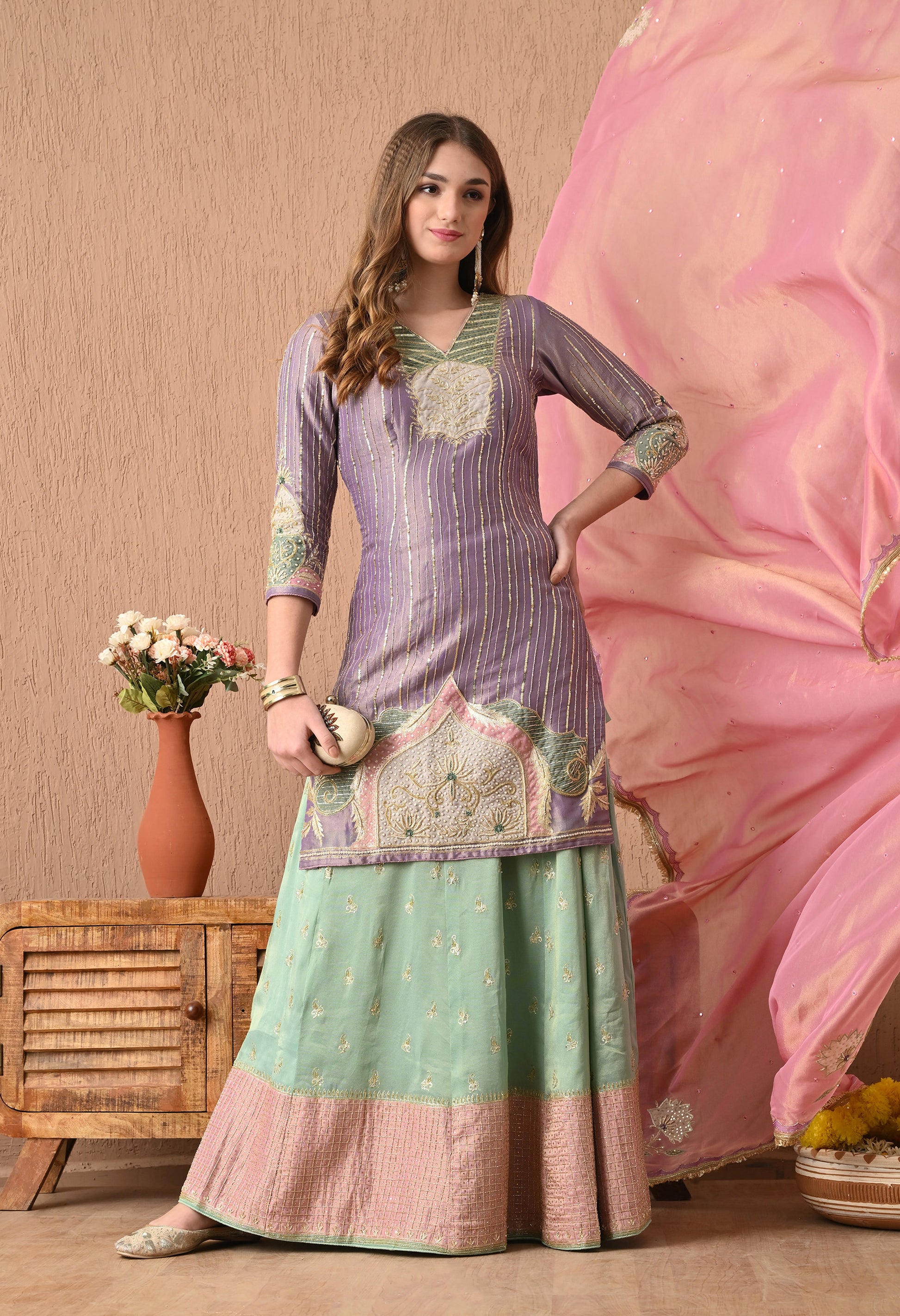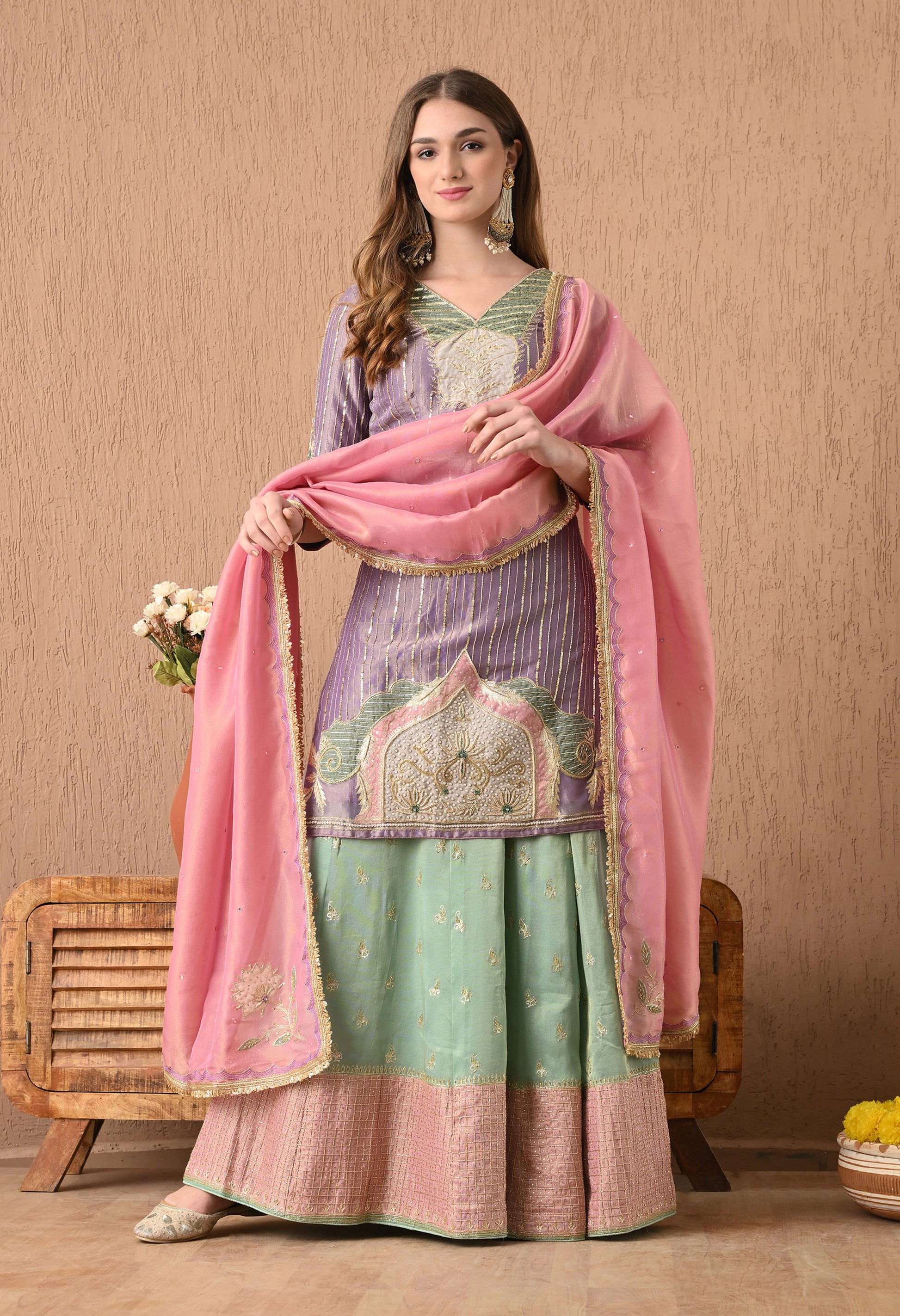 Indulge in timeless beauty with our purple Lehnga Set, boasting a delicately embroidered tissue kurti, a featherlight tissue dupatta, and a beautifully sculpted tissue lehnga. Adorned with zardozi, sequin, and applique embellishments, it's a vision of refined luxury. Own your elegance!