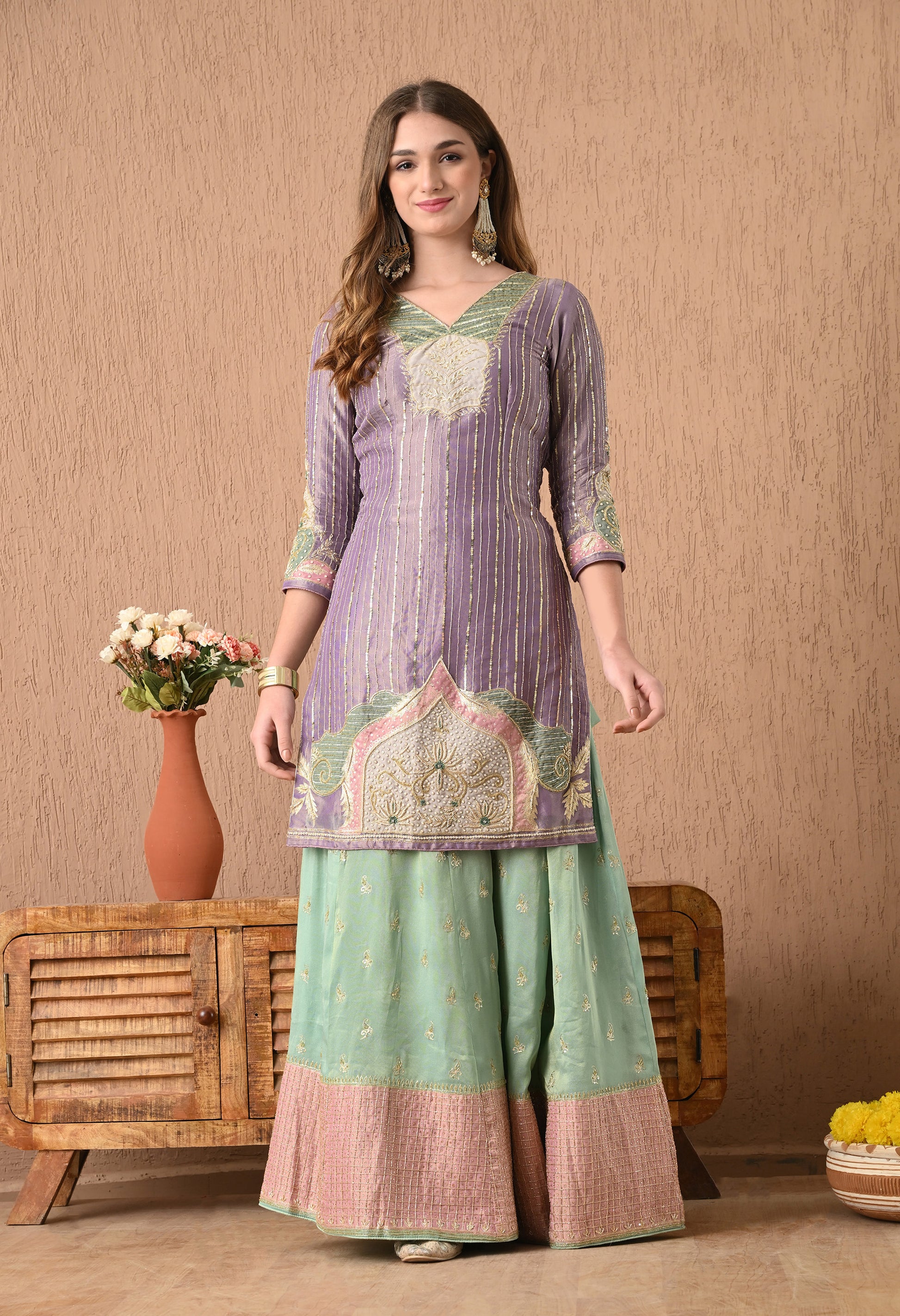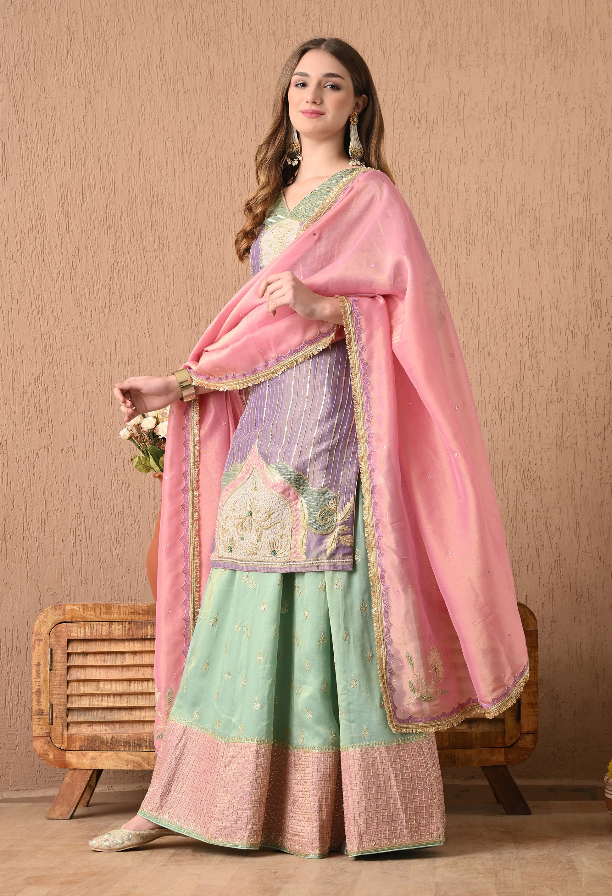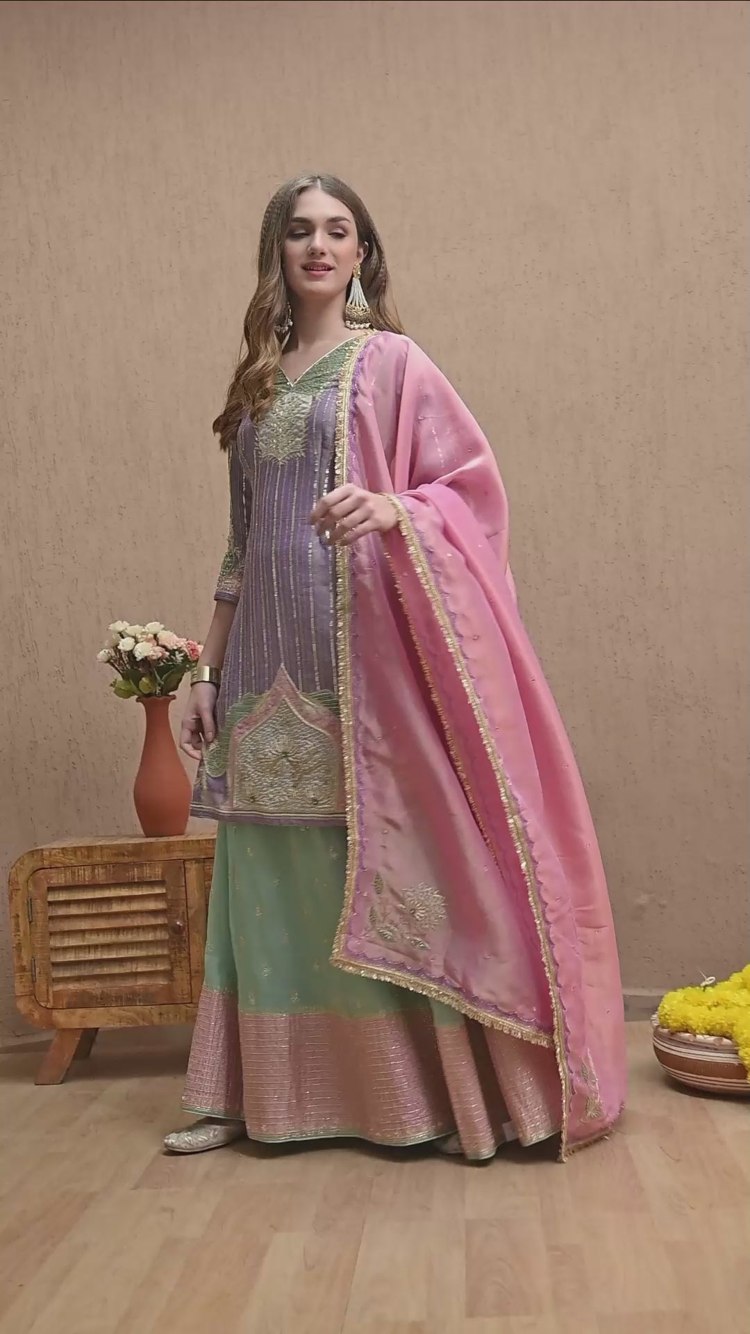 Indulge in timeless beauty with our purple Lehnga Set, boasting a delicately embroidered tissue kurti, a featherlight tissue dupatta, and a beautifully sculpted tissue lehnga. Adorned with zardozi, sequin, and applique embellishments, it's a vision of refined luxury. Own your elegance!