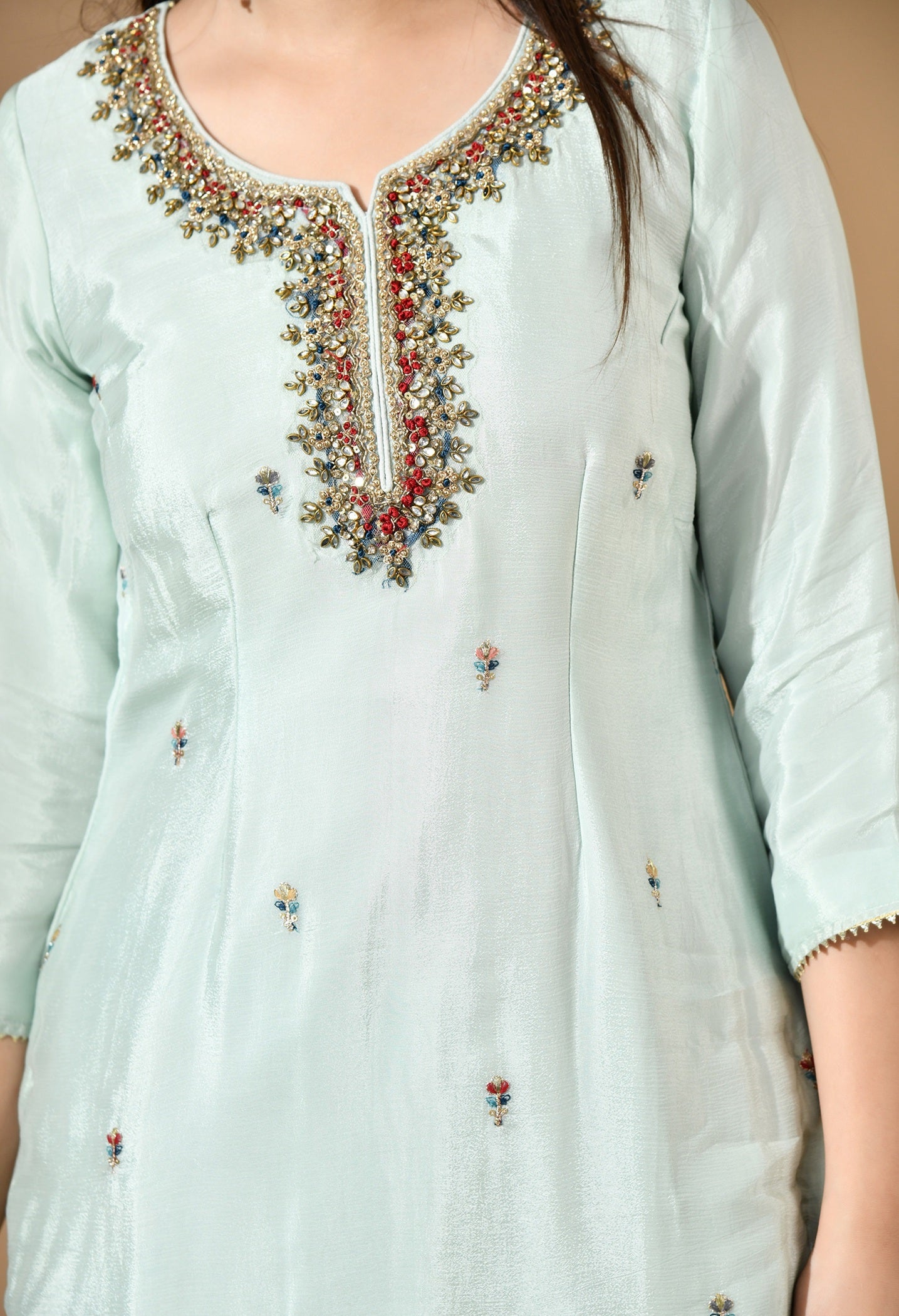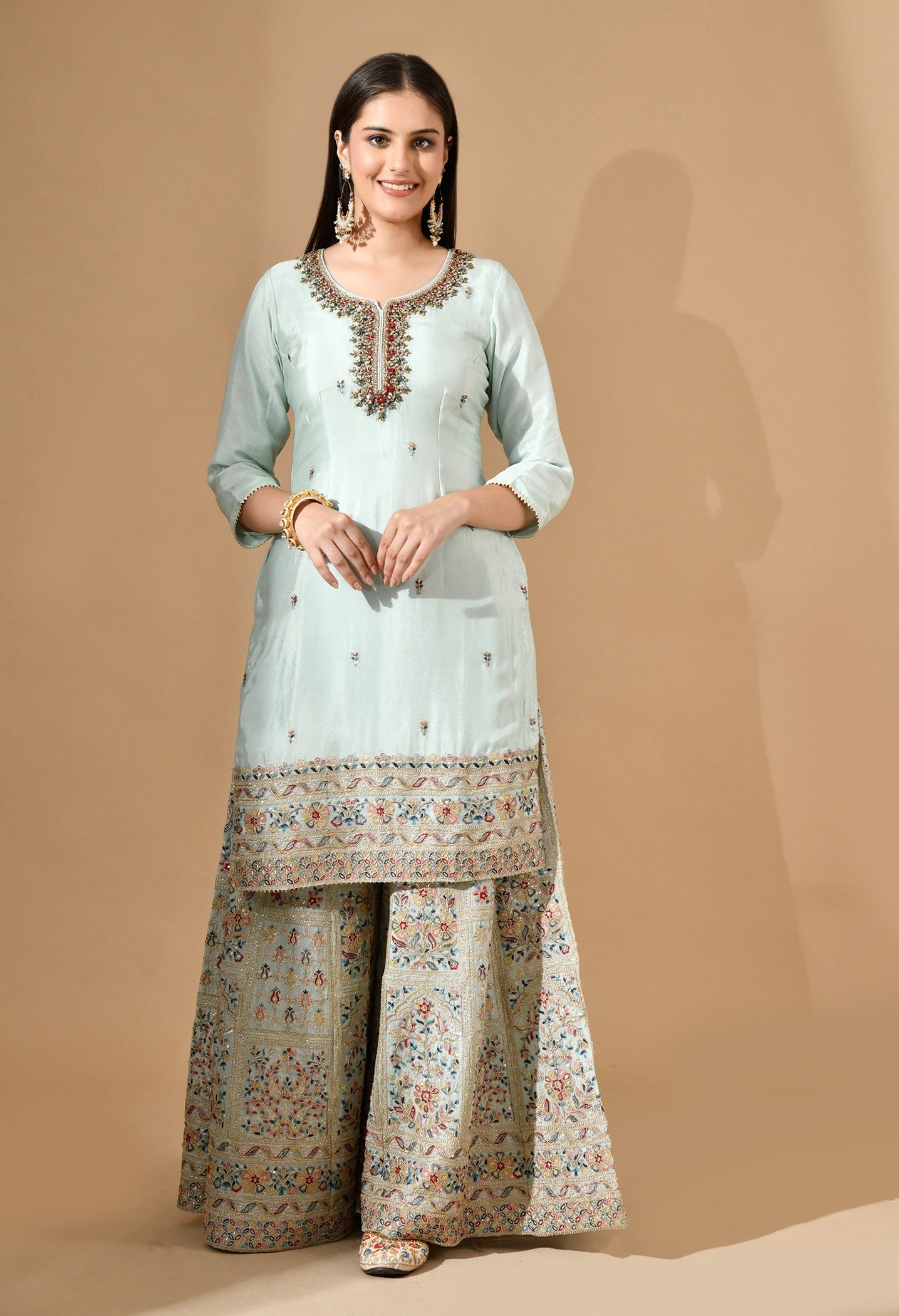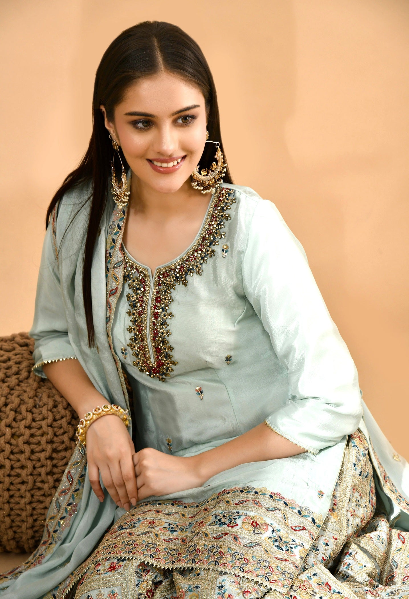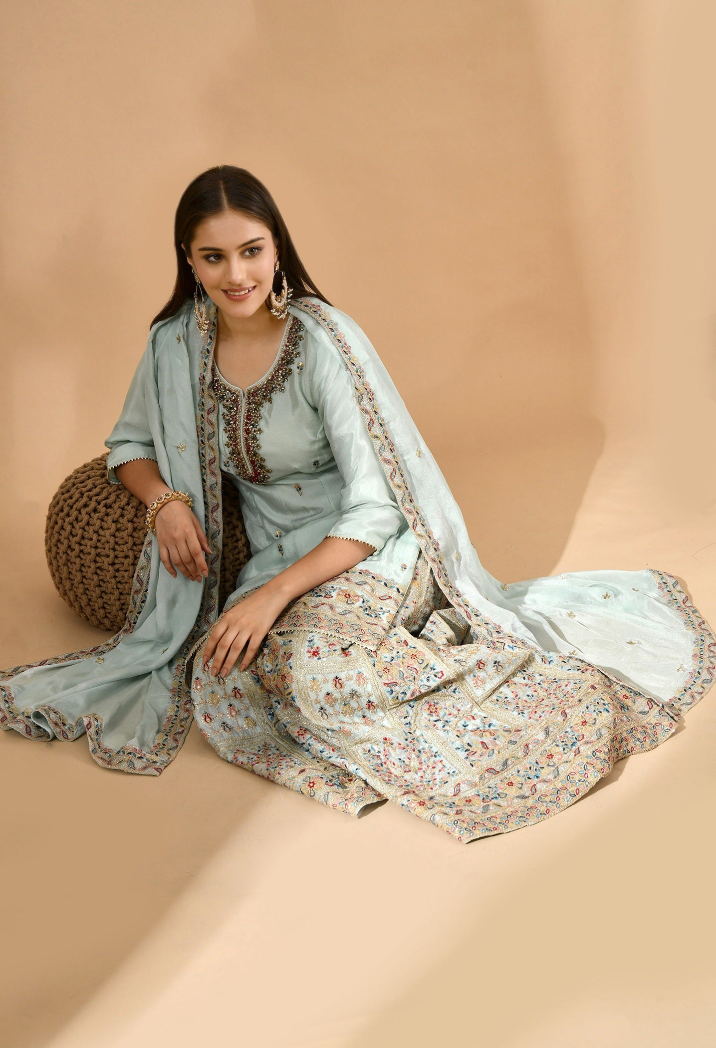 - This aqua blue Chinon sharara set is designed to shimmer softly with every step.