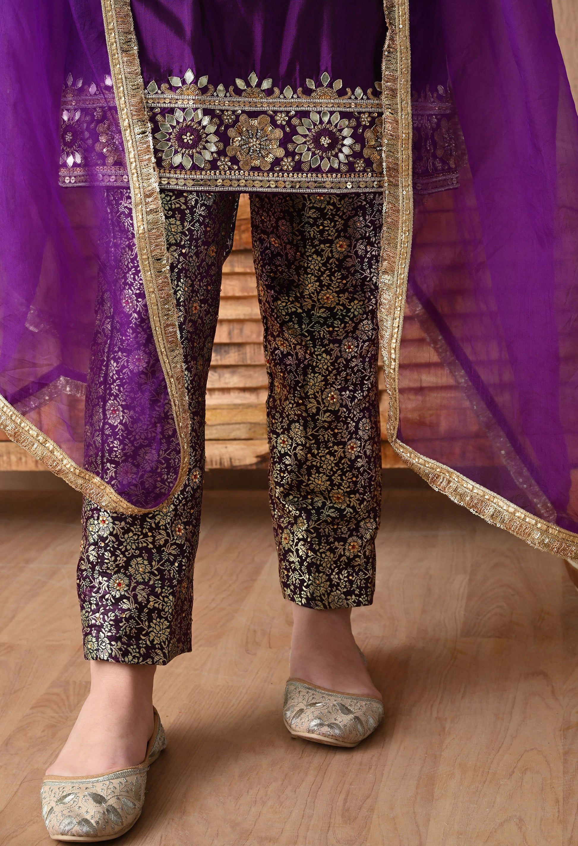 Exude grace in our purple Kurta Set, featuring a flowing organza dupatta, a meticulously embroidered silk kurta, and a beautifully tailored banarsi bottom. Adorned with exquisite gota patti, zardozi, and sequin work, this ensemble is a statement of timeless sophistication. Shine effortlessly!