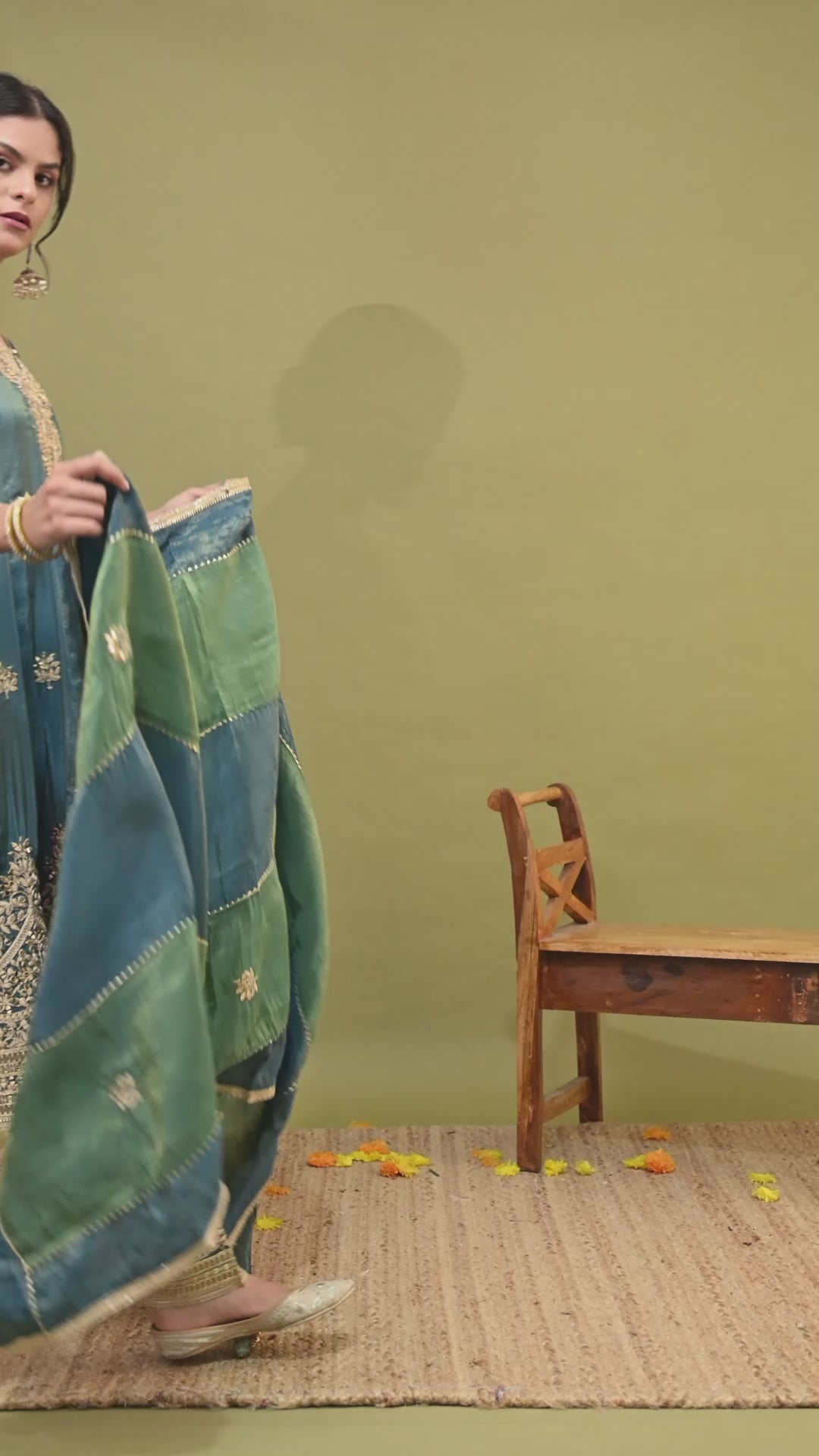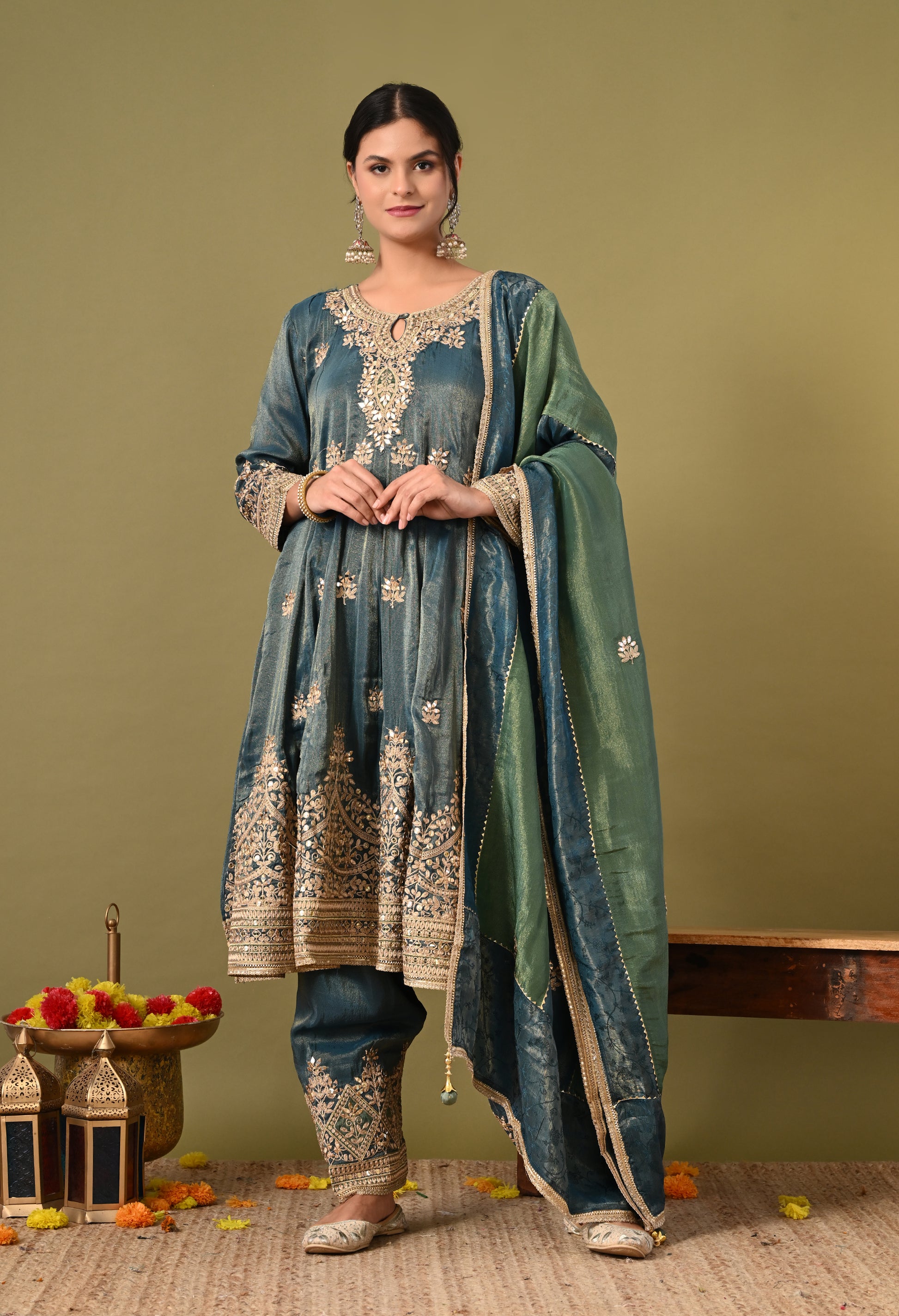 Drape yourself in sophistication with our vibrant greyish blue Kurta Set, designed with a featherlight tissue crepe contrast dupatta, an elaborately detailed tissue crepe frock kurta, and a coordinated tissue crepe straight salwar. The artistic embroidery work of zardozi, mirror, and crystal touches make it a masterpiece. Shine with confidence!