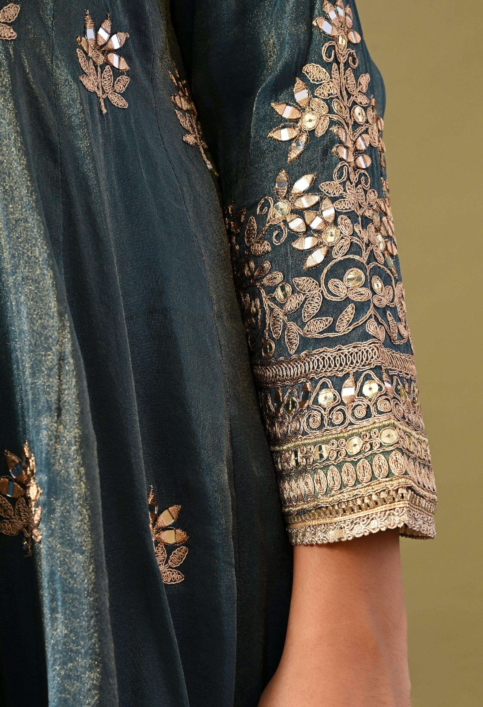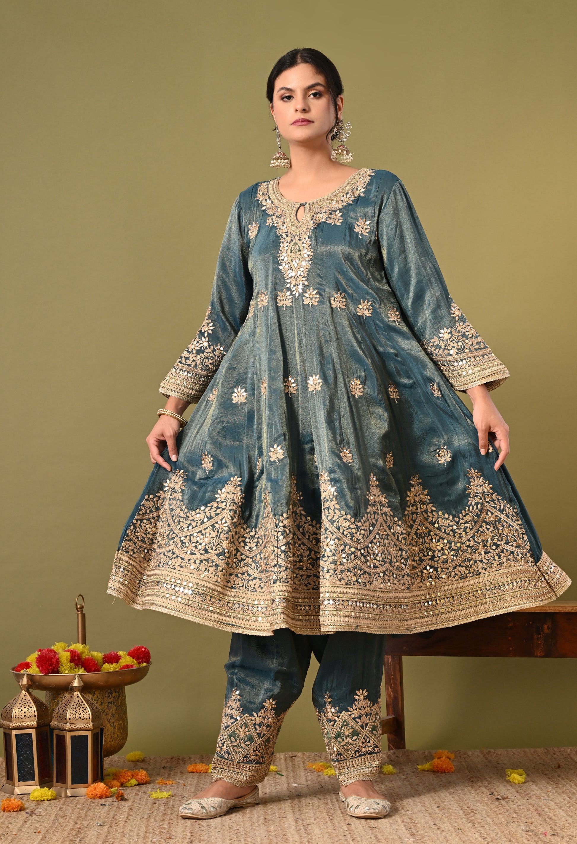 Beautiful Greyish Blue Kurta Set with Zardozi, Mirror, and Crystal Work