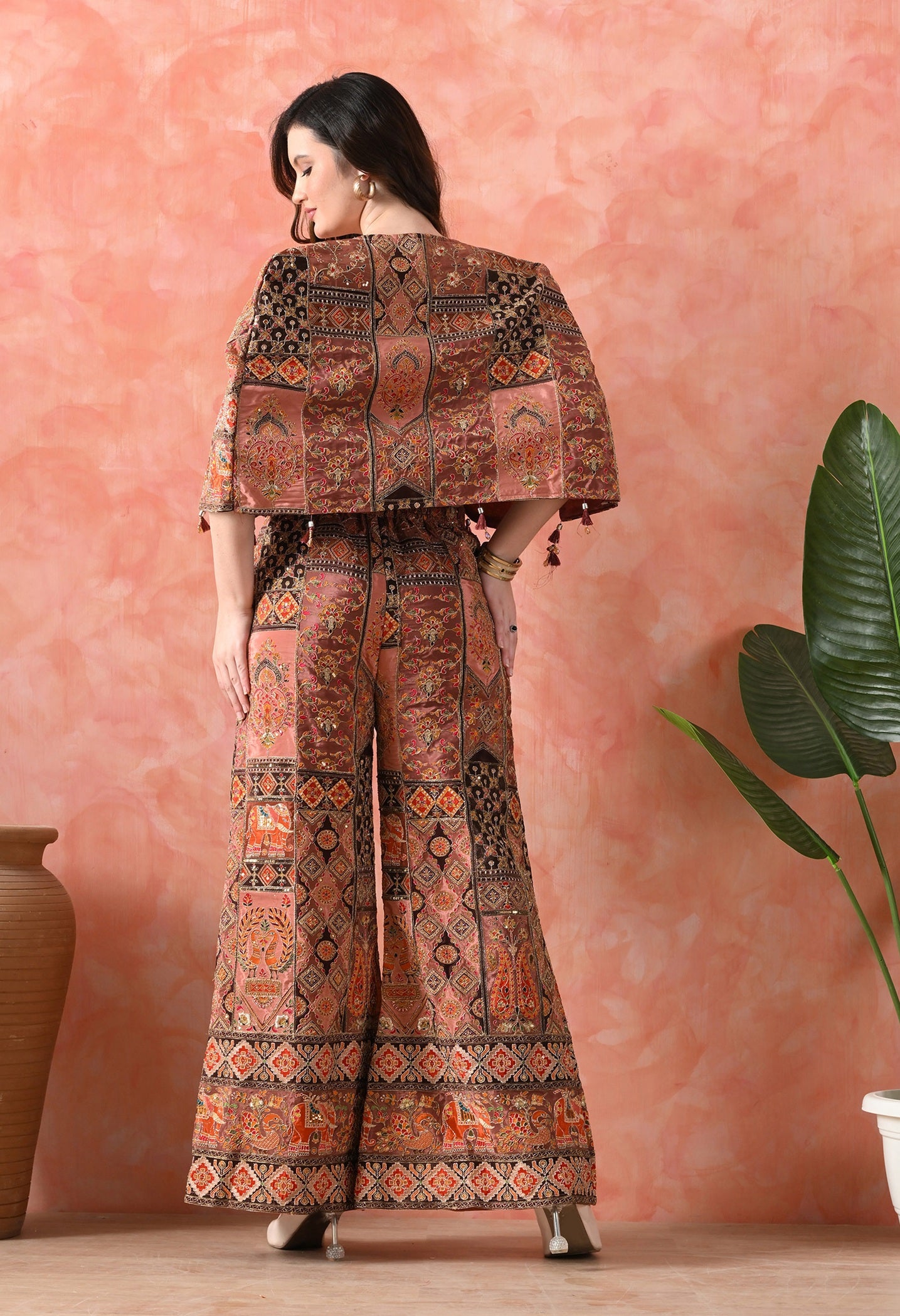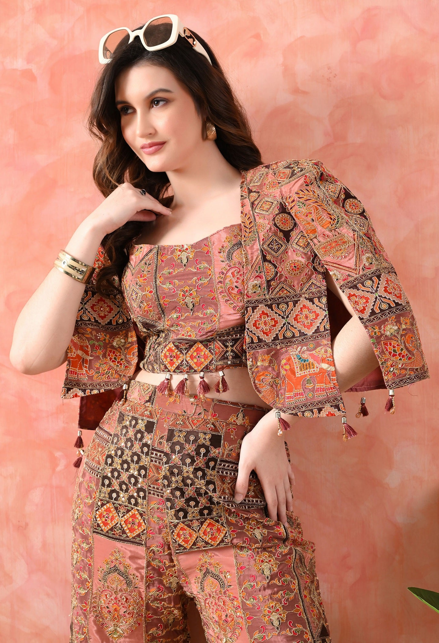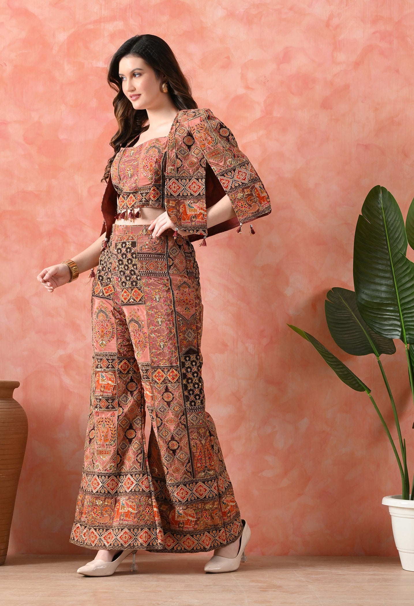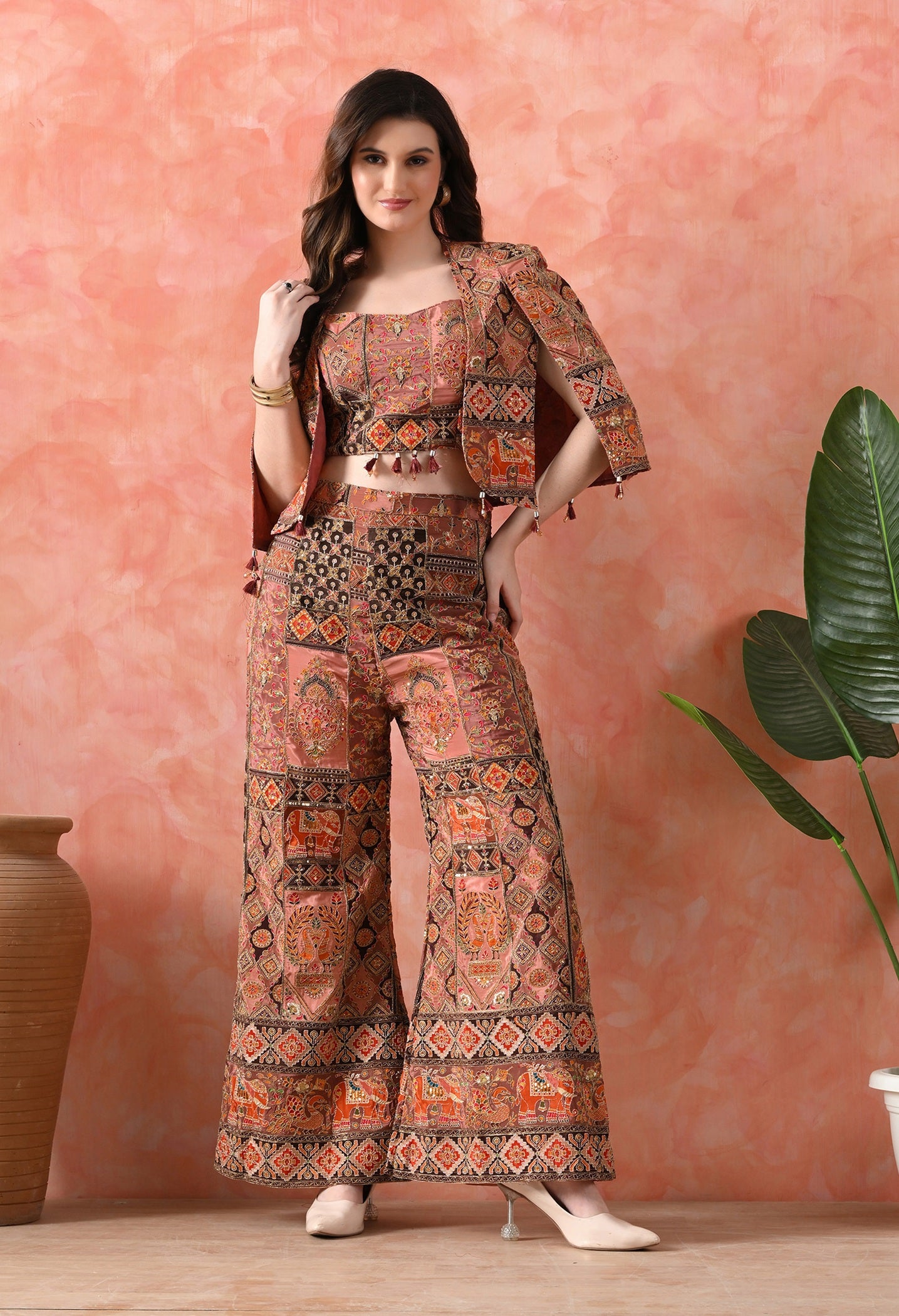 A graceful beige Indo-Western set with crepe blouse, jacket, and umbrella-cut pants. Embellished with hand zardozi and sequin embroidery.