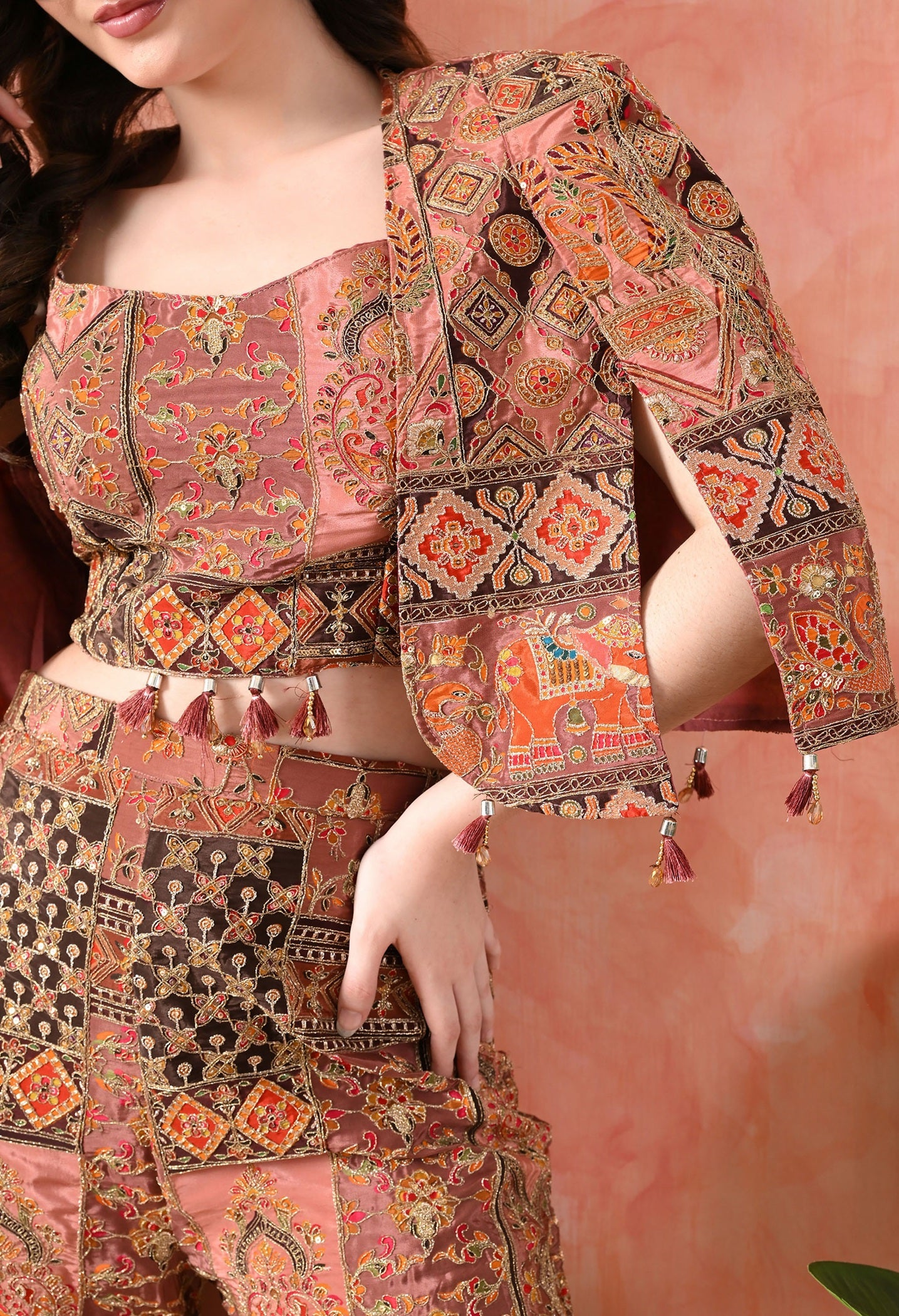 This beige Indo-Western set is an elegant pick for cocktail nights, receptions, or festive events. The crepe fabric offers a soft and fluid silhouette, while the handcrafted zardozi and sequin detailing adds richness. The umbrella-cut pant gives a flattering fall, and the structured jacket pulls the whole look together. -