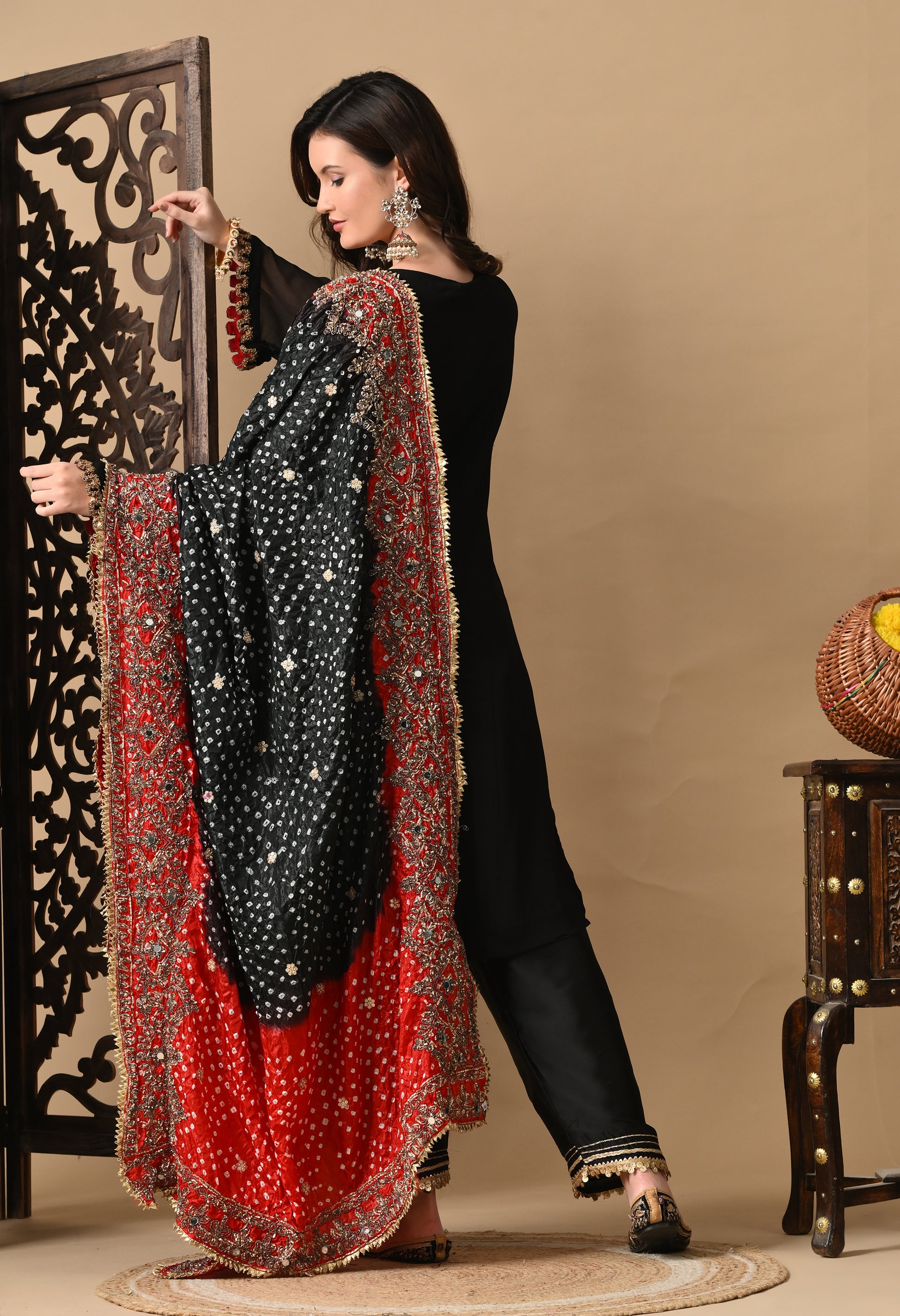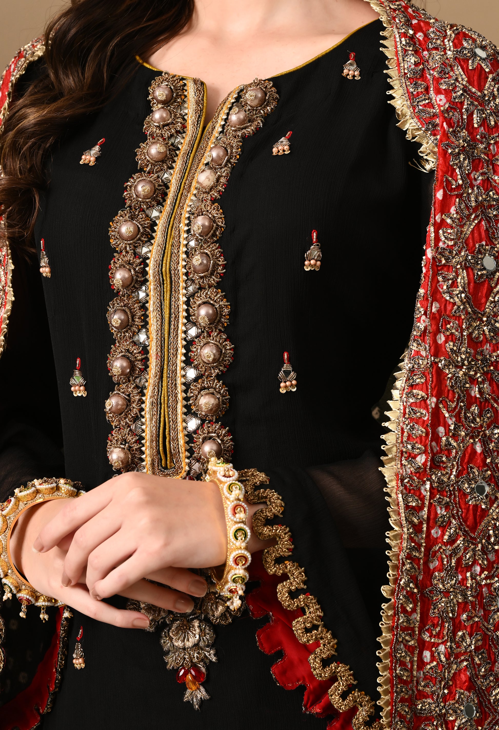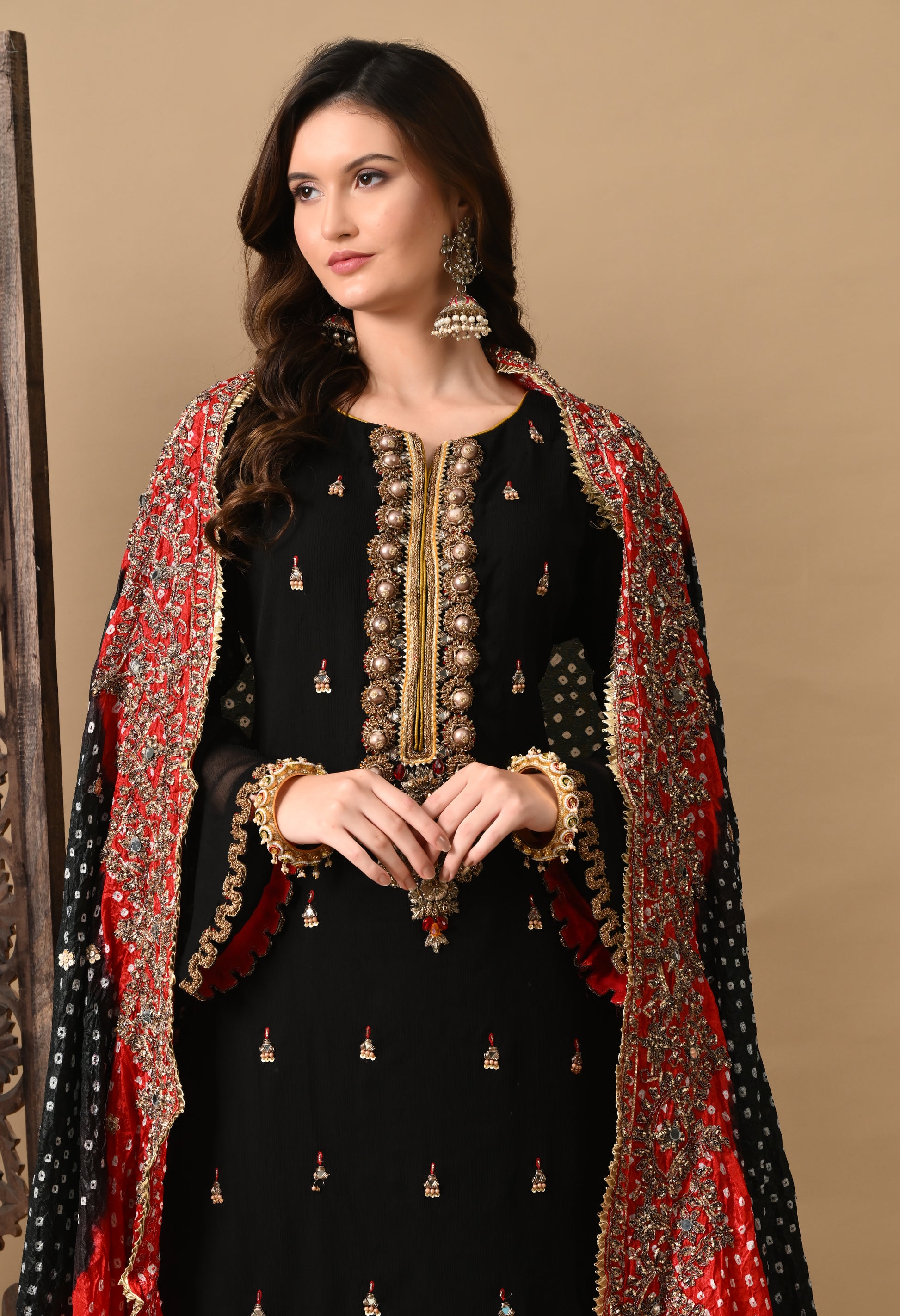 Timeless elegance in this three-piece black chiffon Kurta Set. Hand-embellished with traditional gota, mirror, and dabka work on the flowing kurta, it’s paired with a silk dupatta and straight pants for a luxurious finish. Relaxed fit, customizable, dry-clean only. Perfect for festive celebrations.