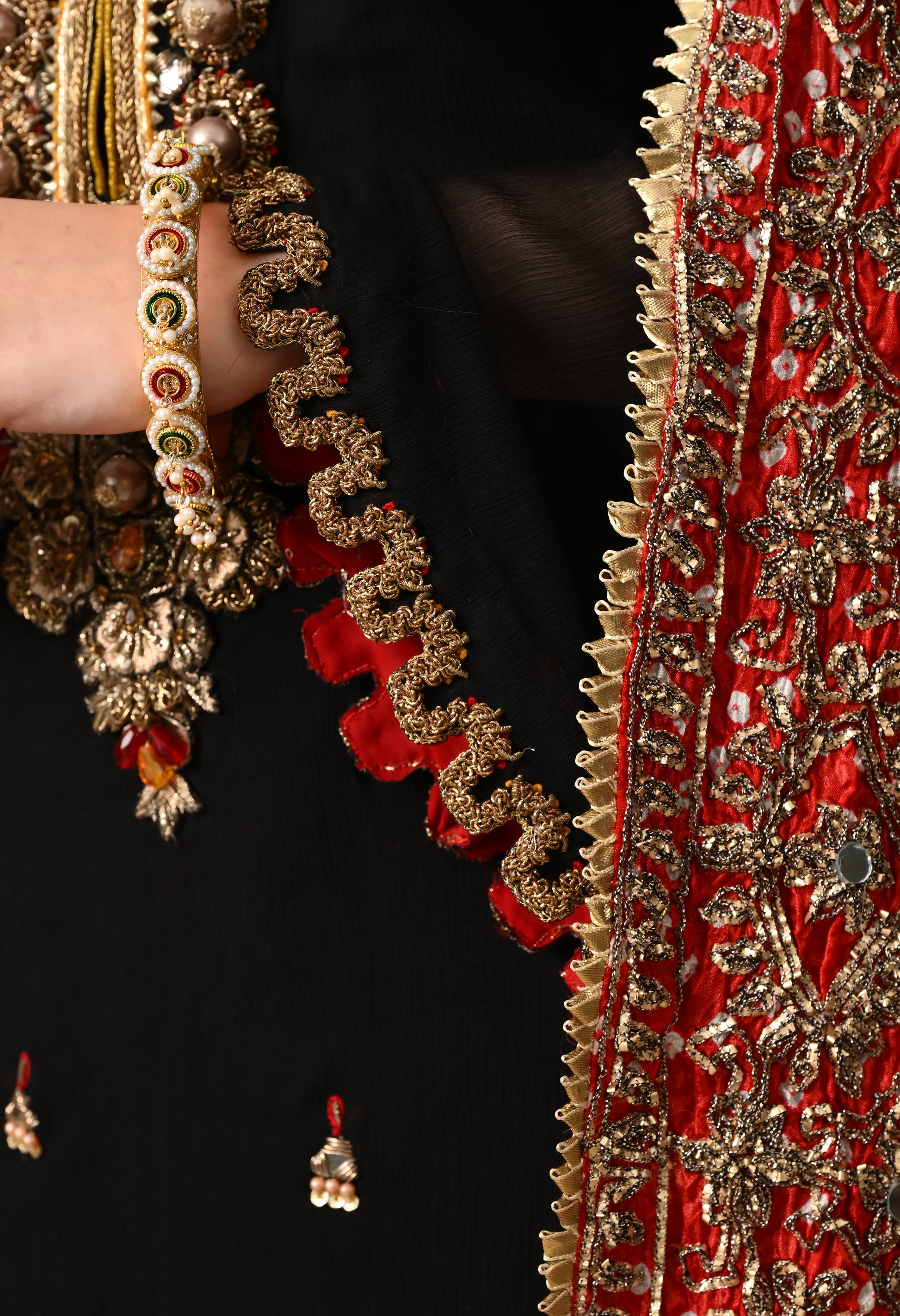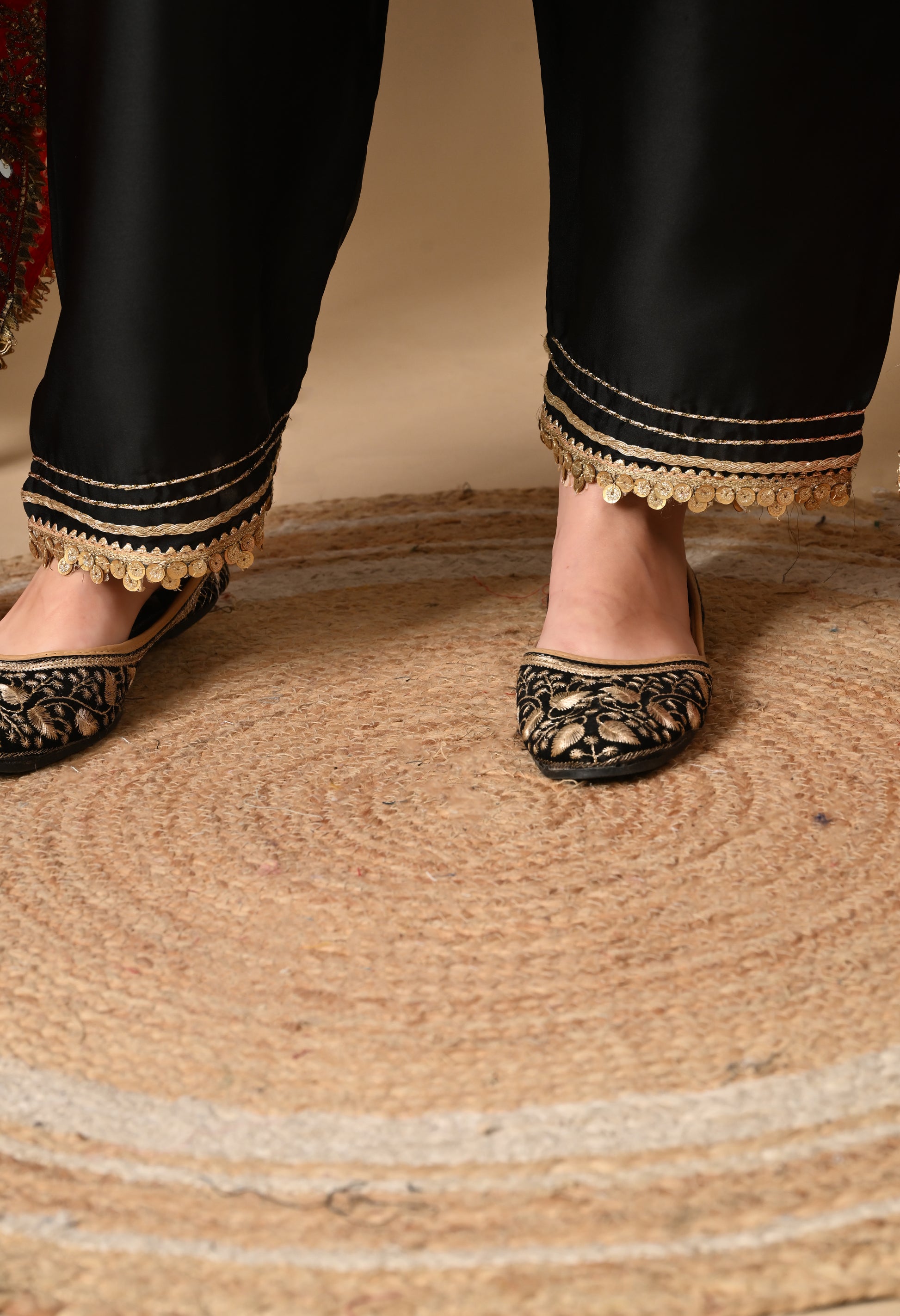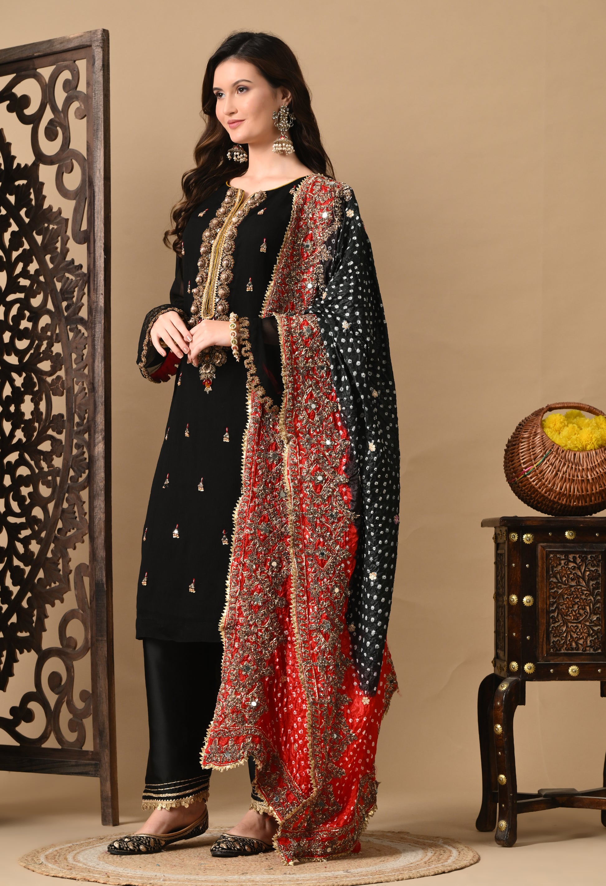 Timeless elegance in this three-piece black chiffon Kurta Set. Hand-embellished with traditional gota, mirror, and dabka work on the flowing kurta, it’s paired with a silk dupatta and straight pants for a luxurious finish. Relaxed fit, customizable, dry-clean only. Perfect for festive celebrations.