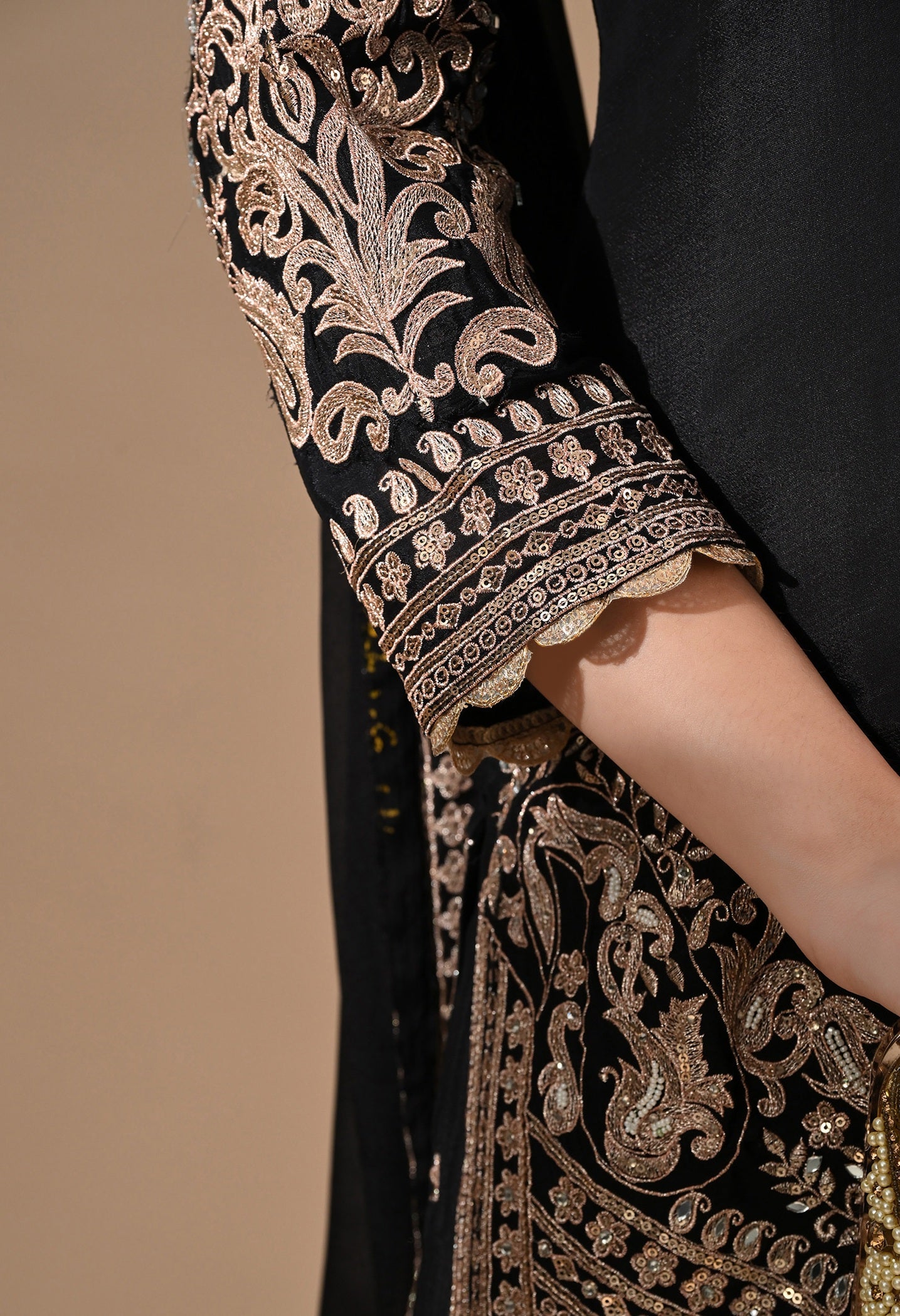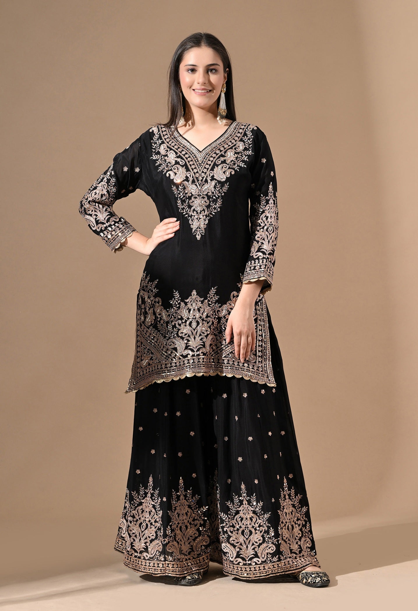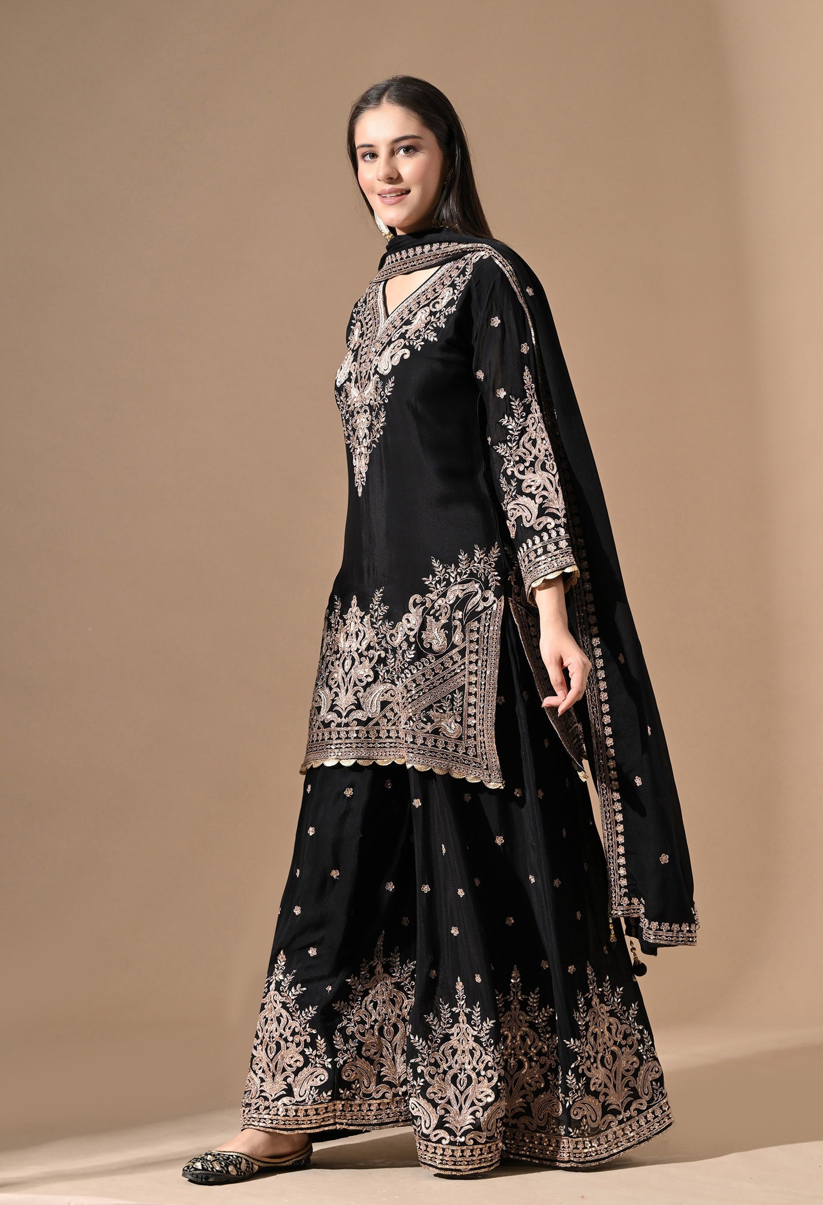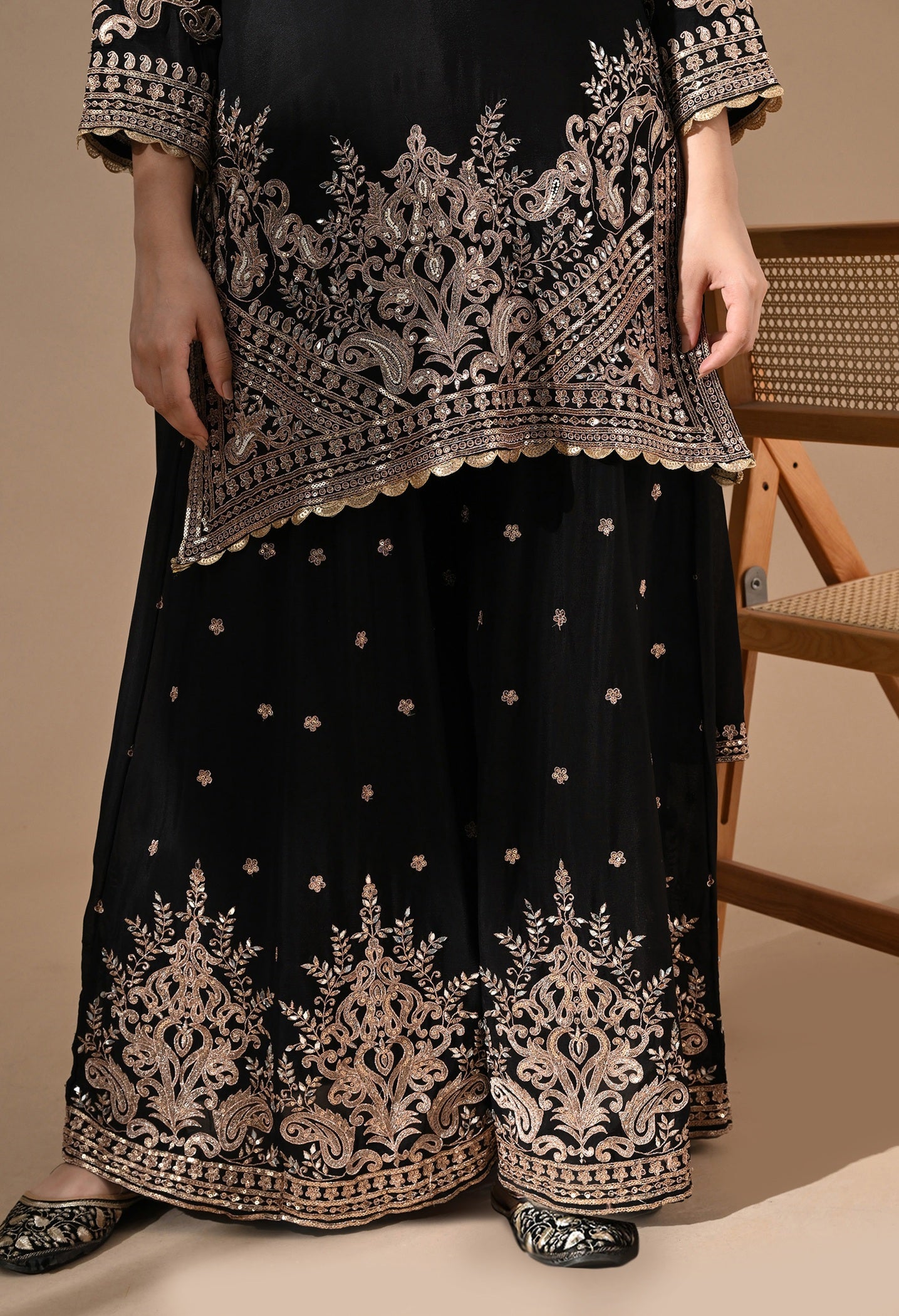 - This all-black Chinon sharara set is a dazzling celebration of traditional artistry.
