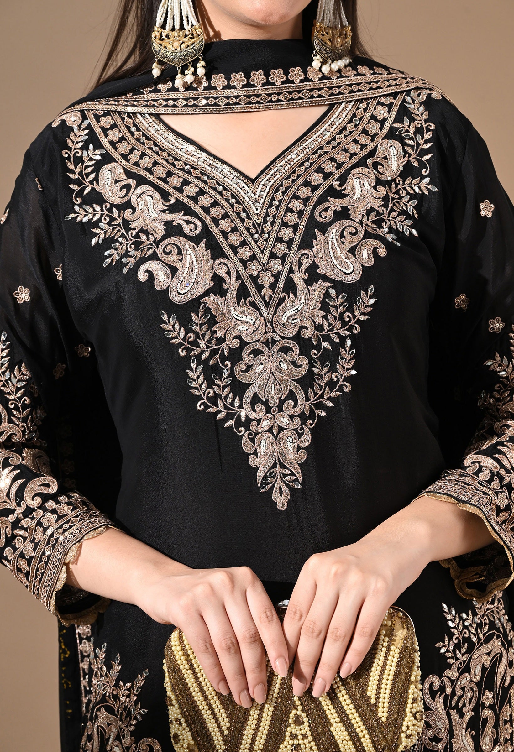 Black Chinon Sharara Set with Zardozi & Mirror Work