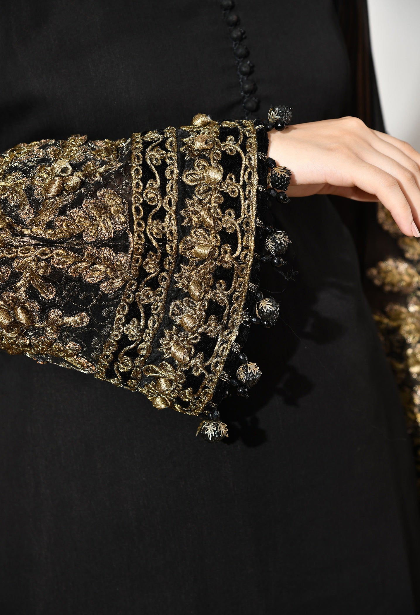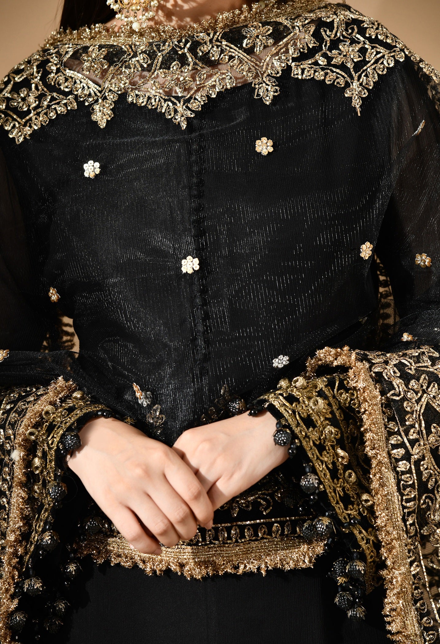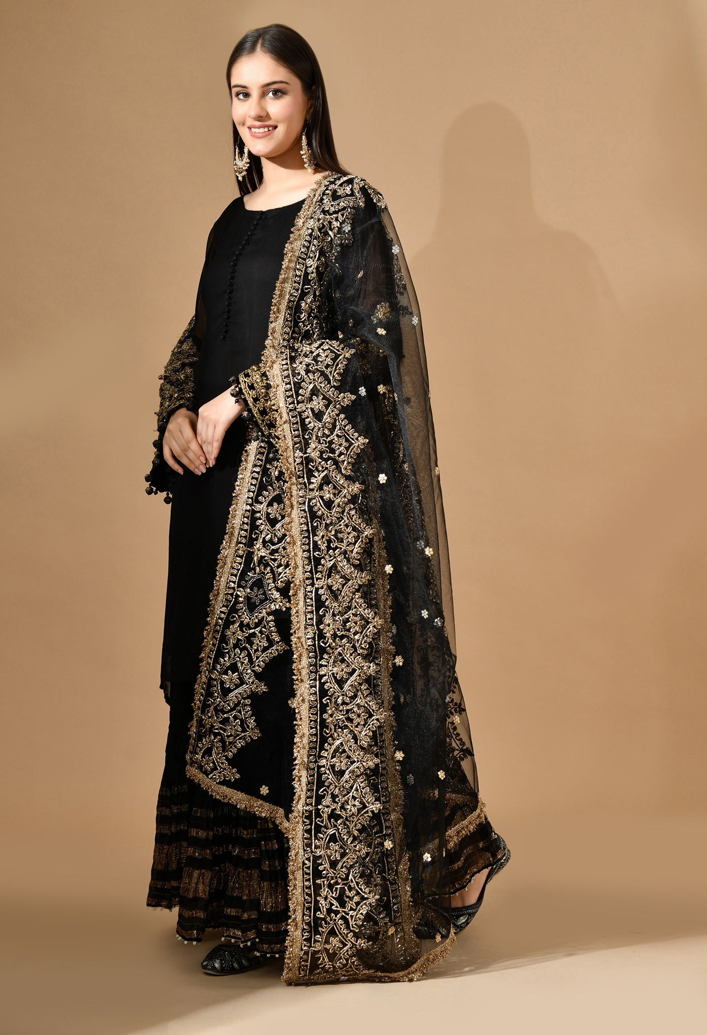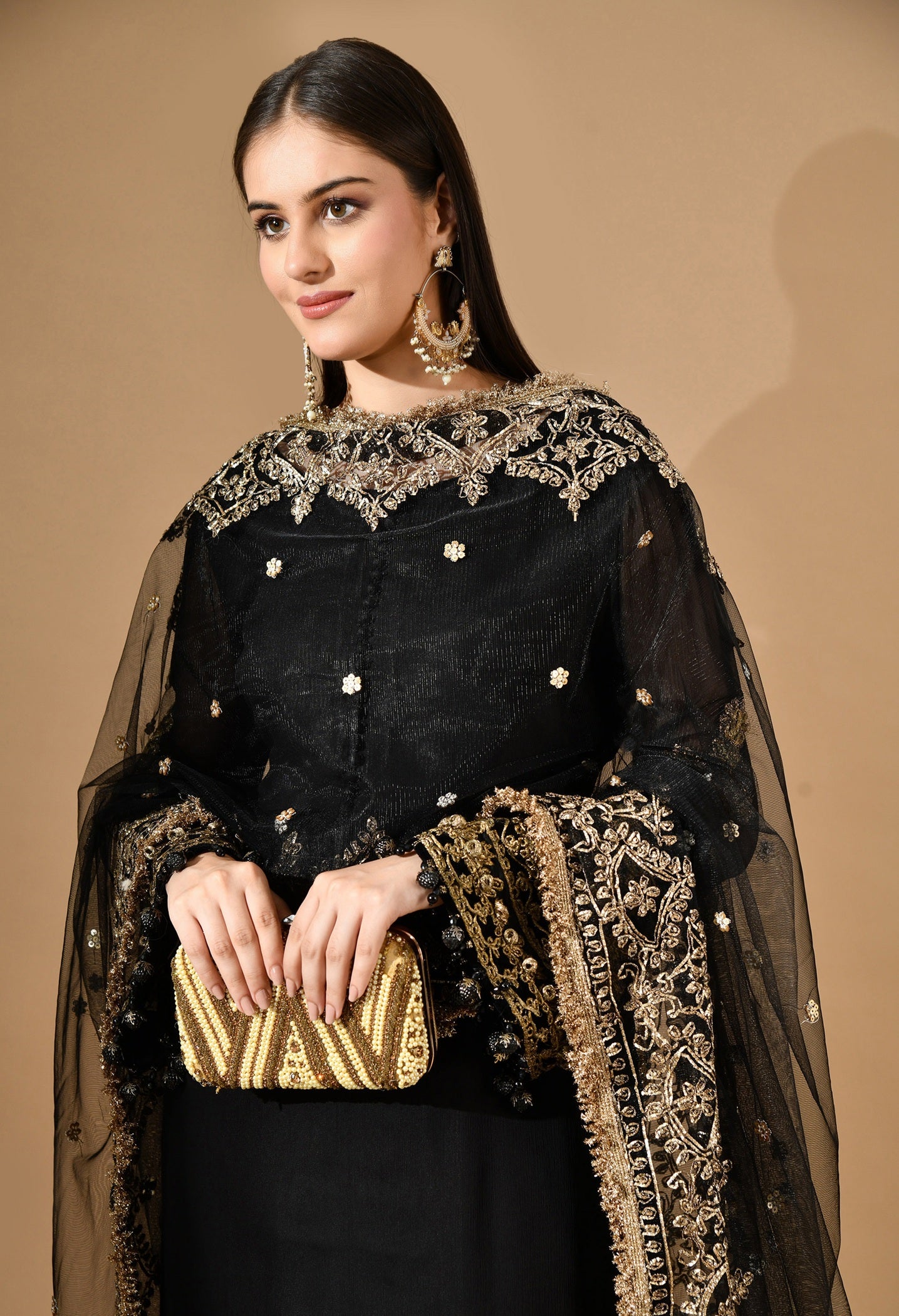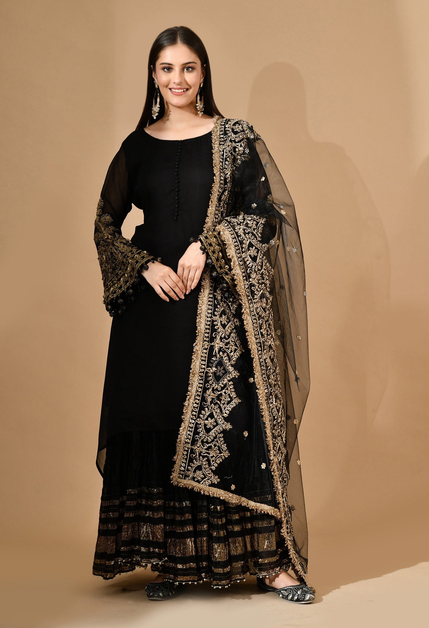 - Intricate gotta and zardozi embroidery lends a regal finish to this black sharara set.