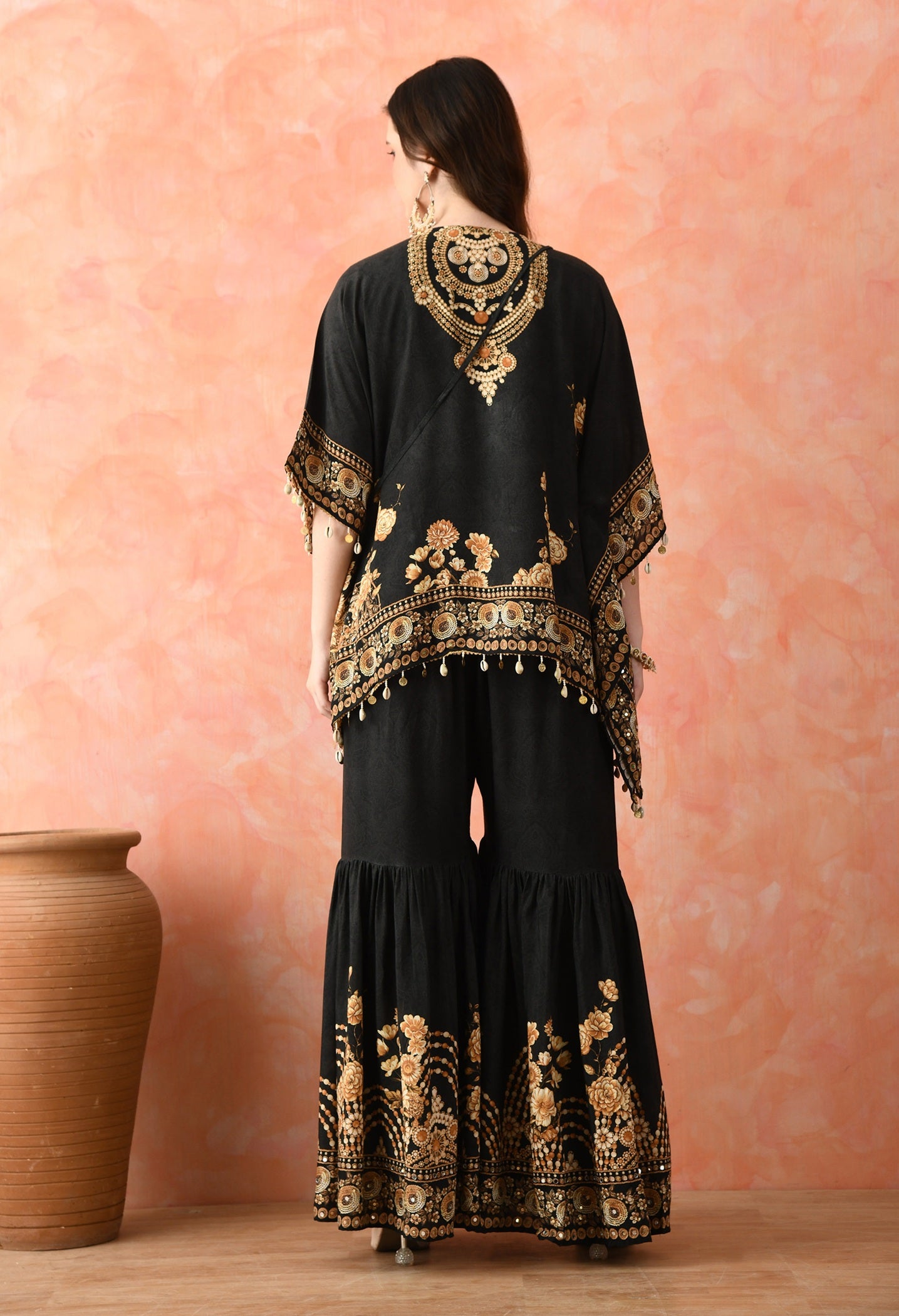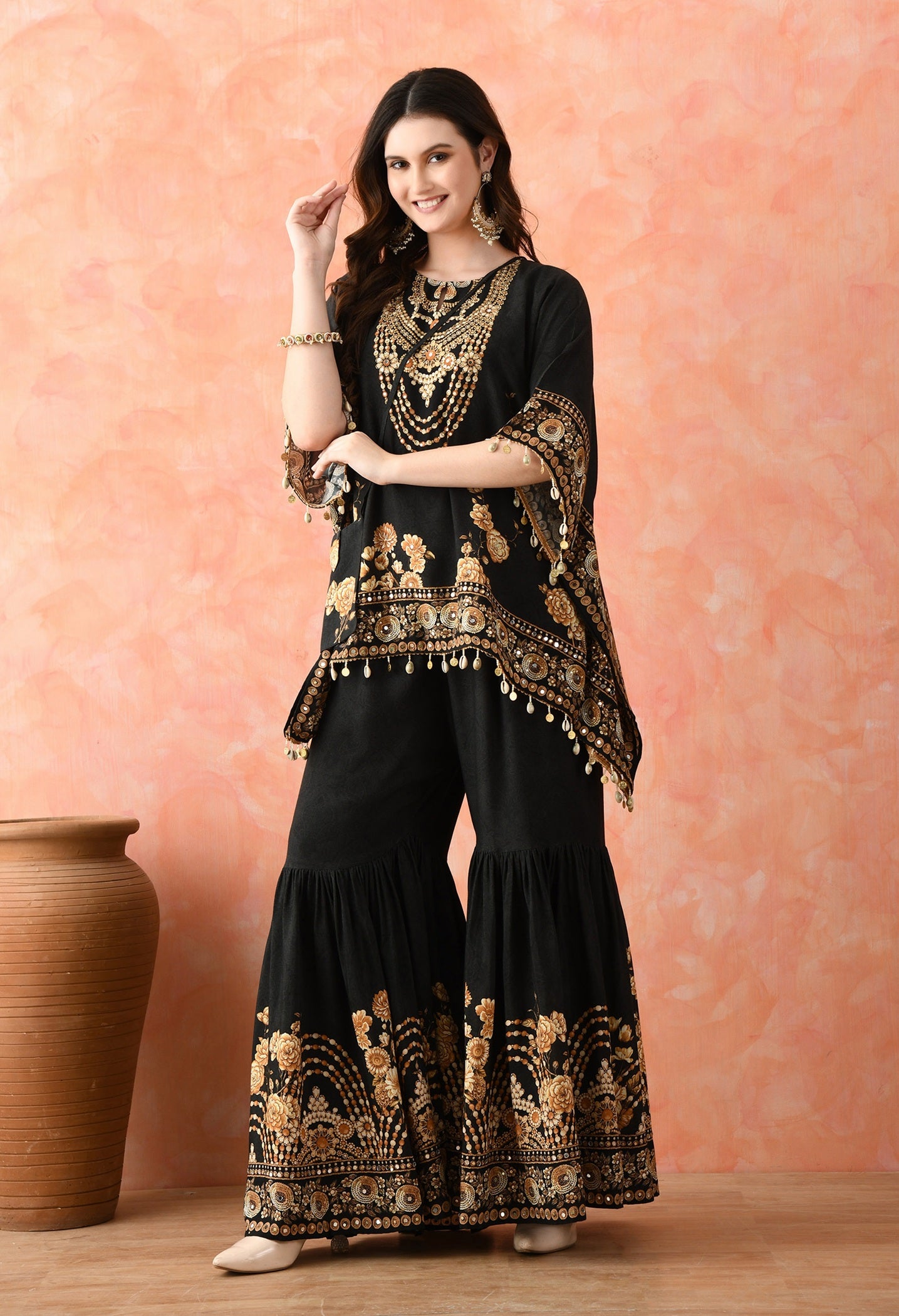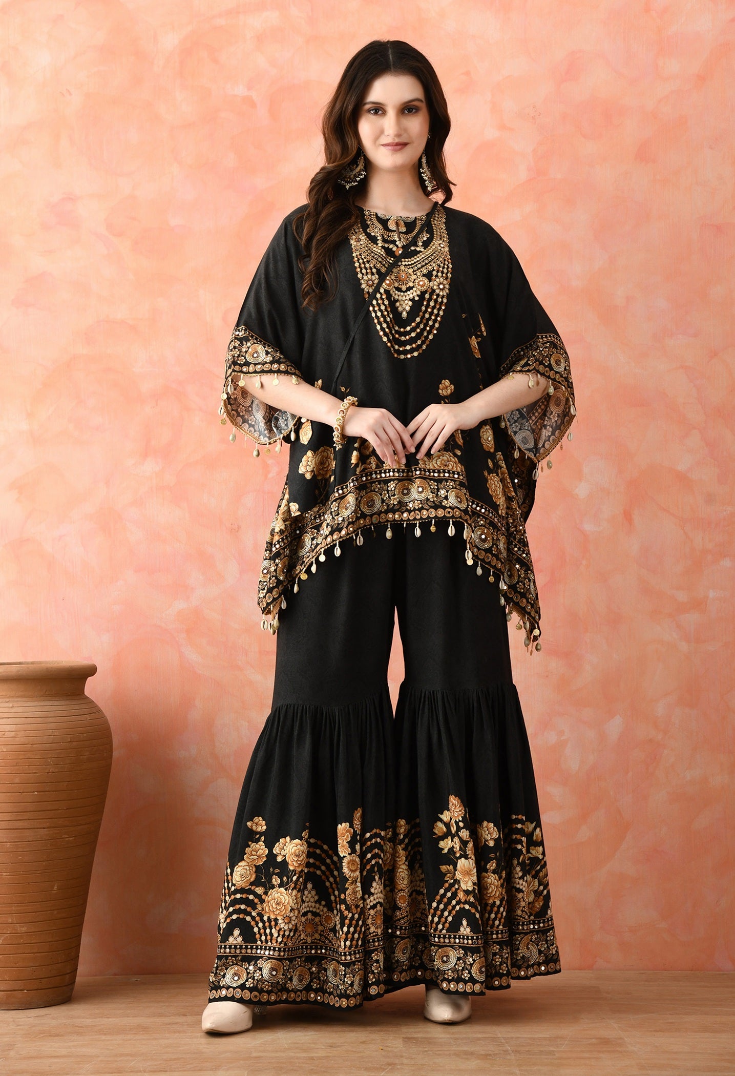A bold black sharara set with cotton silk kaftaan and flared gharara. Mirror, crystal, and sequin detailing make it perfect for night-time festive looks.