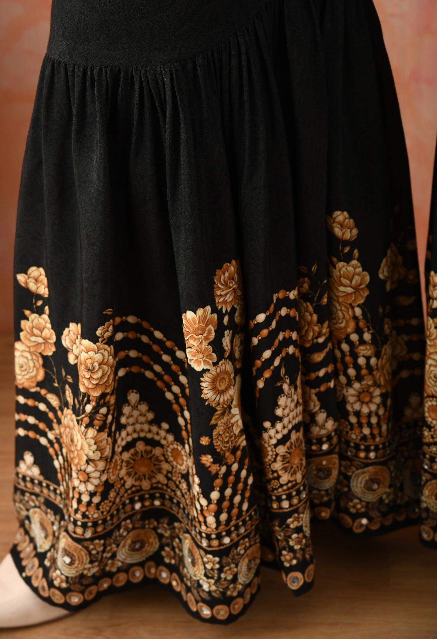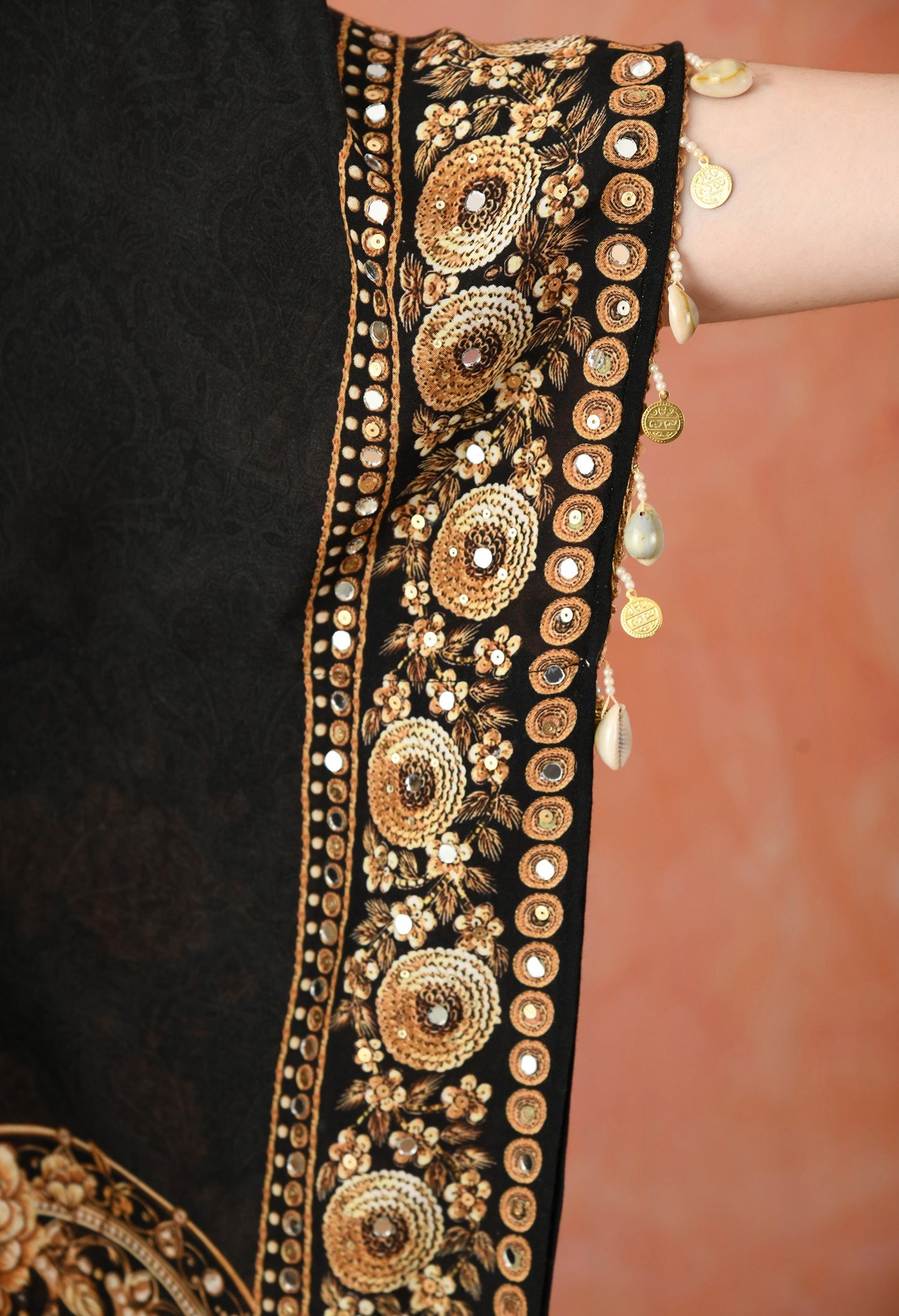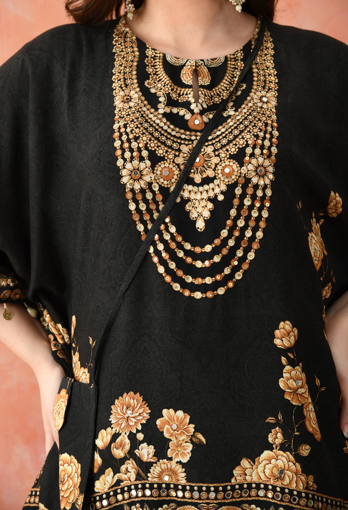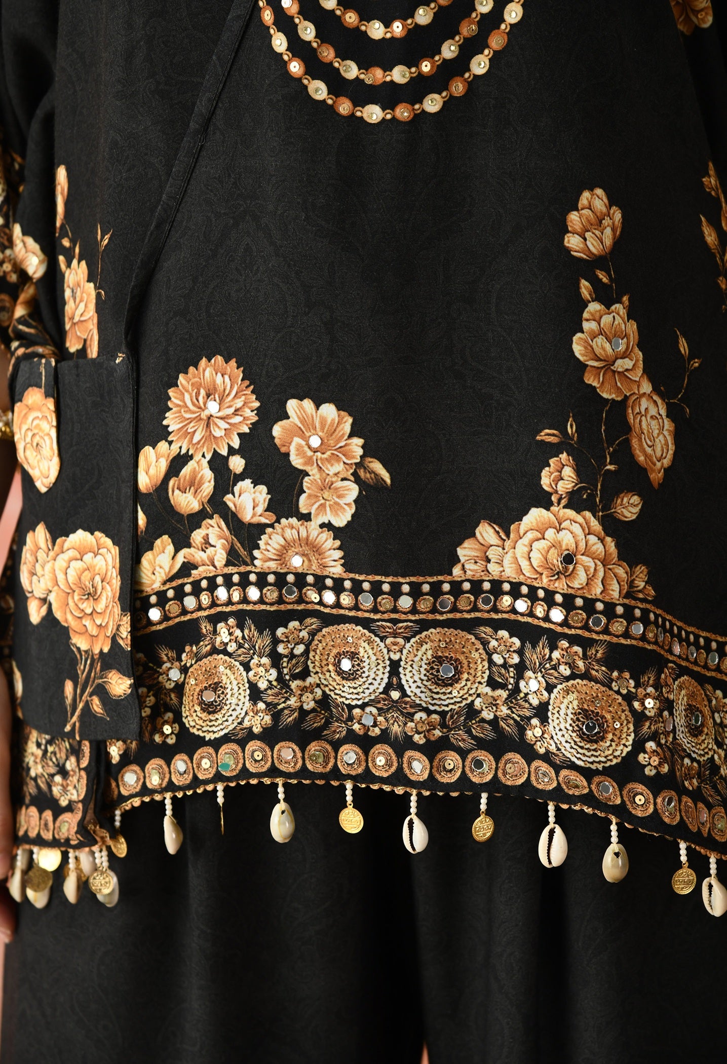 A bold black sharara set with cotton silk kaftaan and flared gharara. Mirror, crystal, and sequin detailing make it perfect for night-time festive looks.