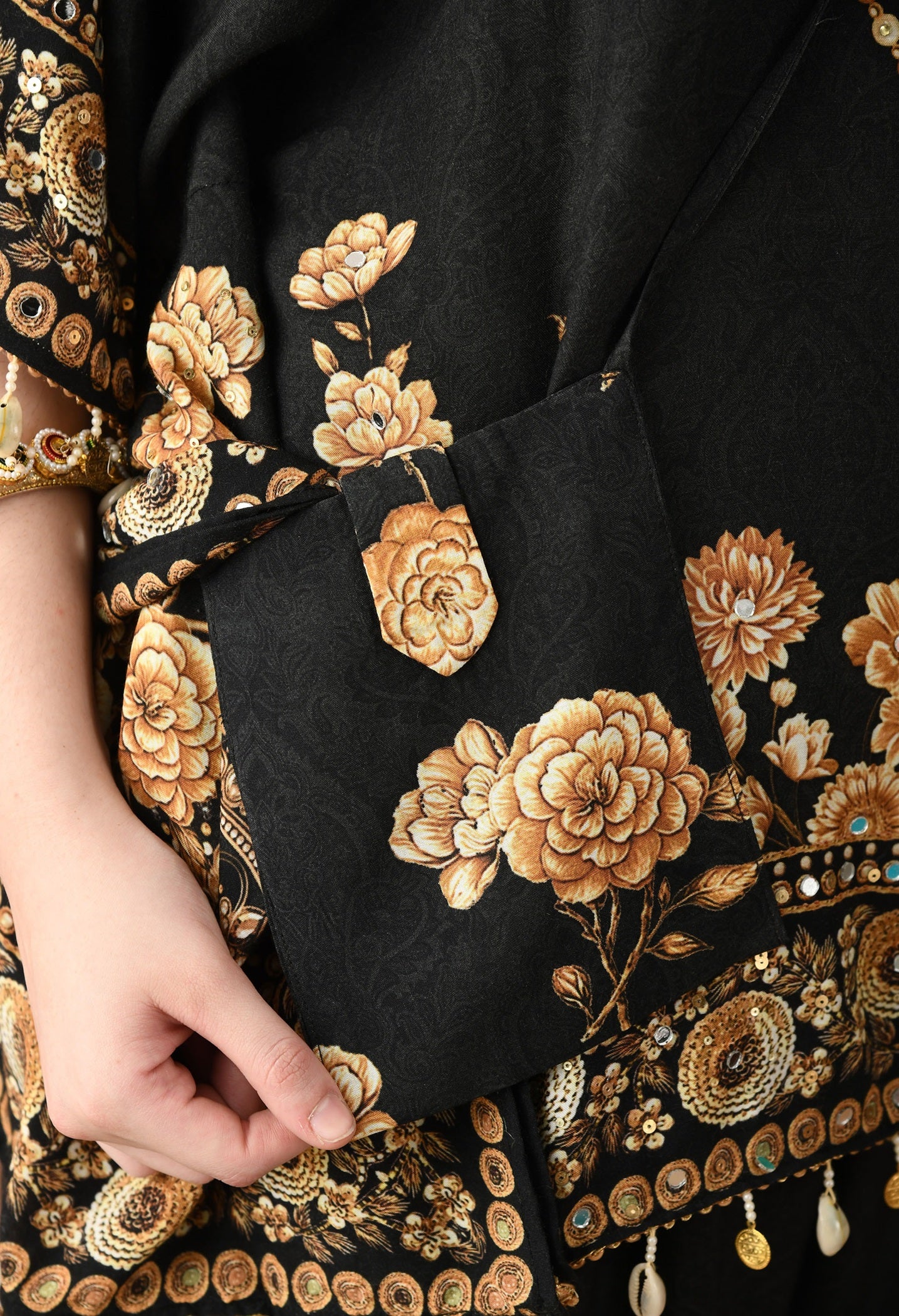 This black kaftaan sharara set is your go-to choice for elegant festive evenings. The soft cotton silk fabric drapes beautifully, while the mirror, crystal, and sequin work bring sparkle and grace. The relaxed silhouette with a flared gharara gives a flattering shape and makes it easy to wear for long celebrations. -