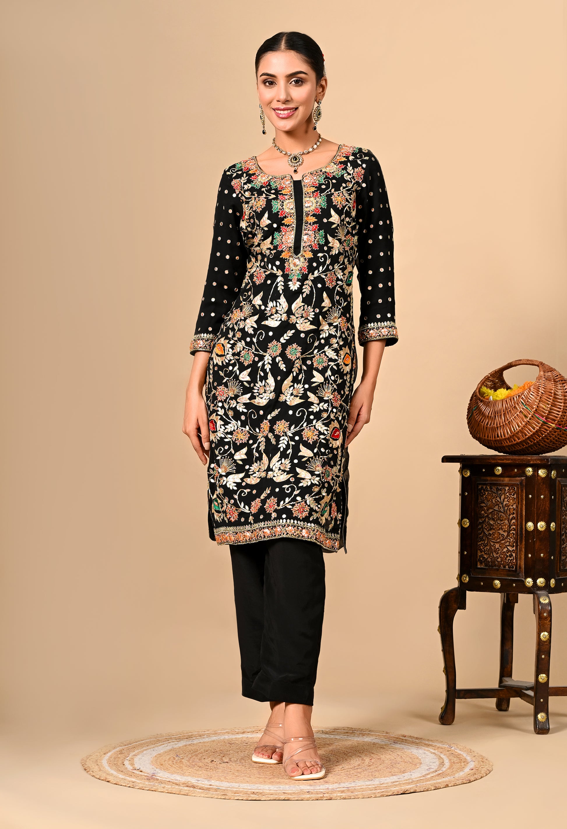 Unleash your inner radiance with our black Kurta Set, adorned with a flowing georgette dupatta, an intricately embroidered georgette kurta, and a sleek crepe bottom. The exquisite gota patti, dabka, thread, and zardozi detailing reflects its age-old beauty.