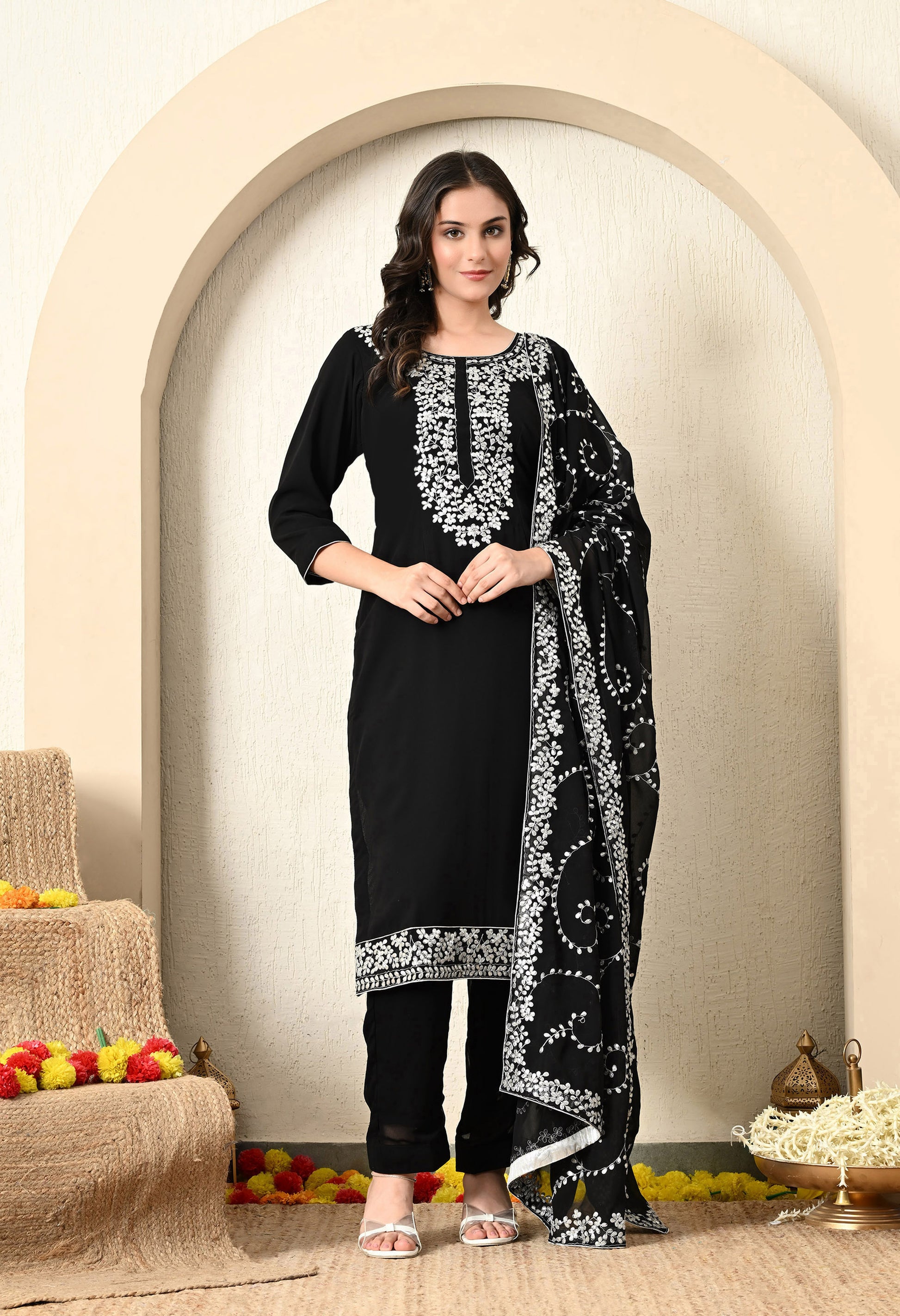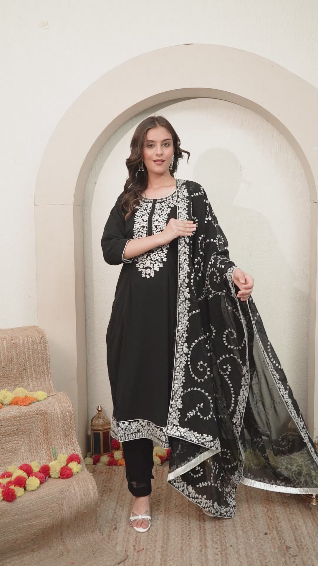 Unveil your inner elegance with this black kurta set, designed with a georgette kurta, a straight pant, and a coordinating georgette dupatta. With detailed Gota Patti work, including full jaal embroidery on the dupatta, this outfit adds a refined touch to any occasion.
