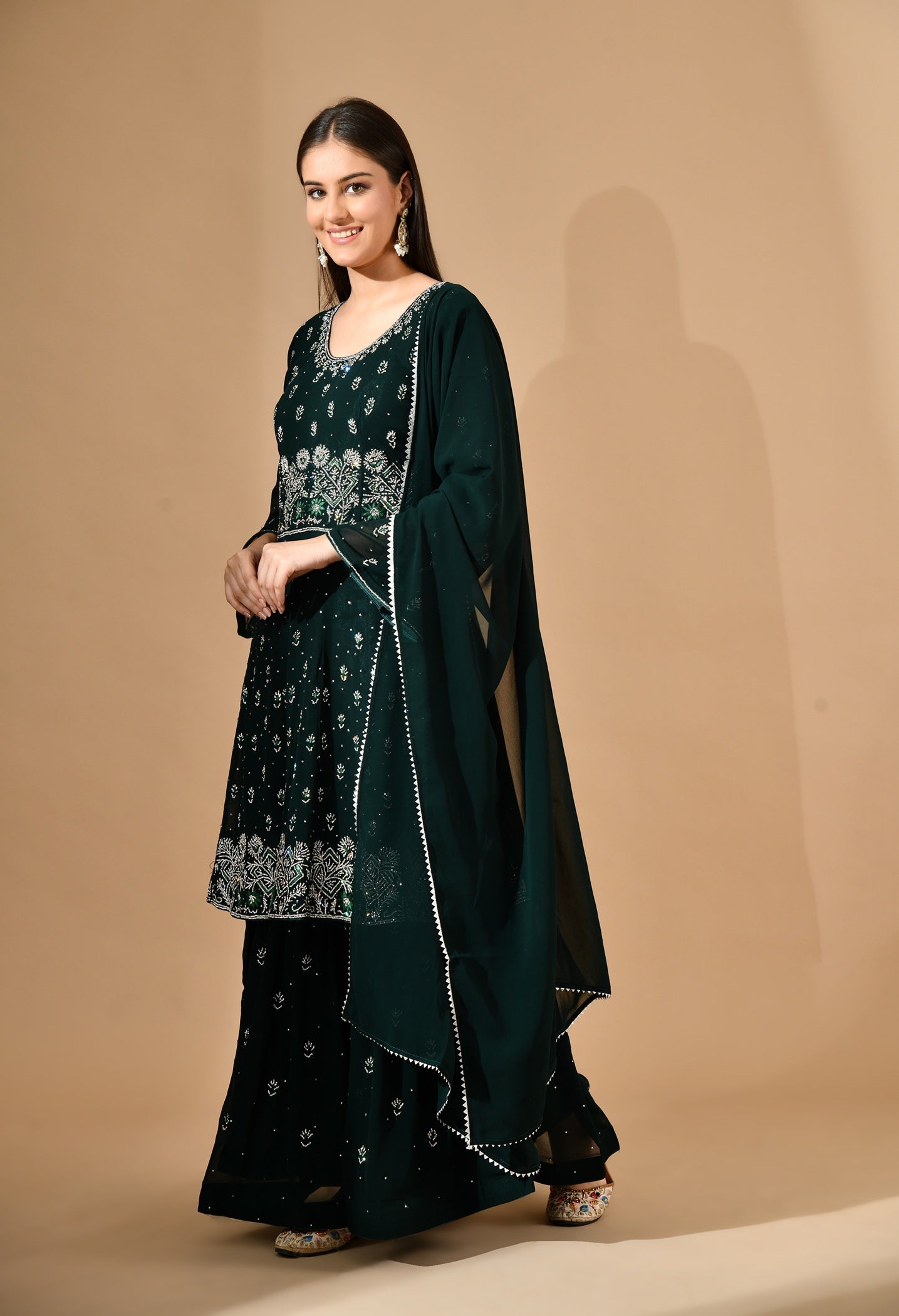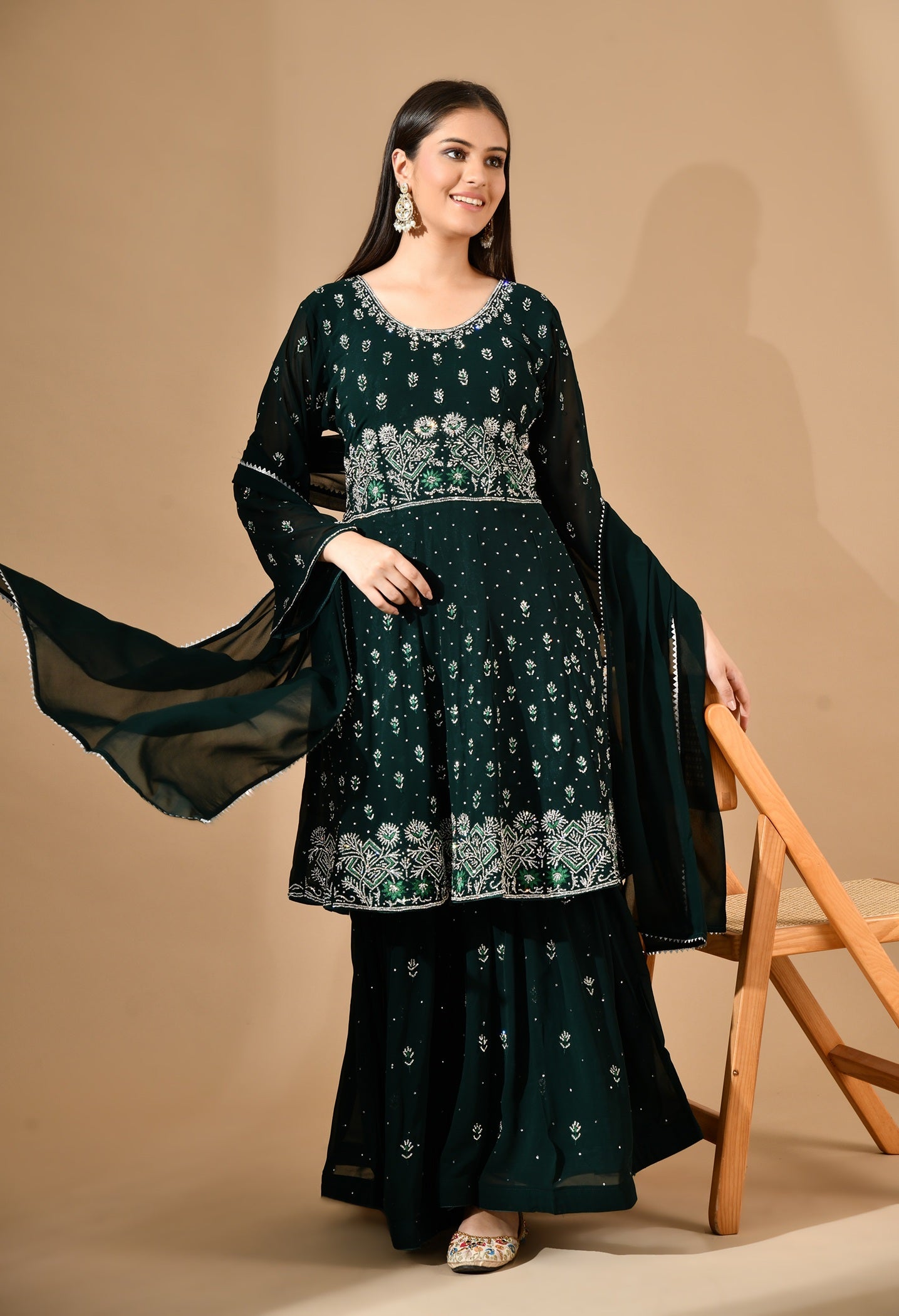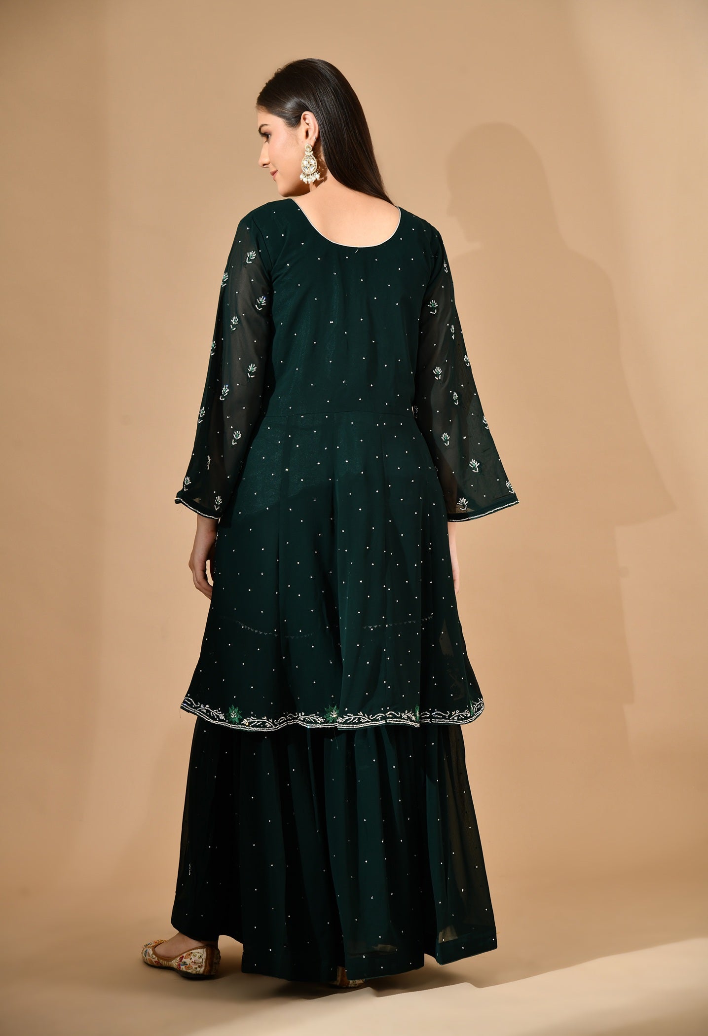 - This bottle green georgette sharara set is an effortless blend of tradition and glamour.