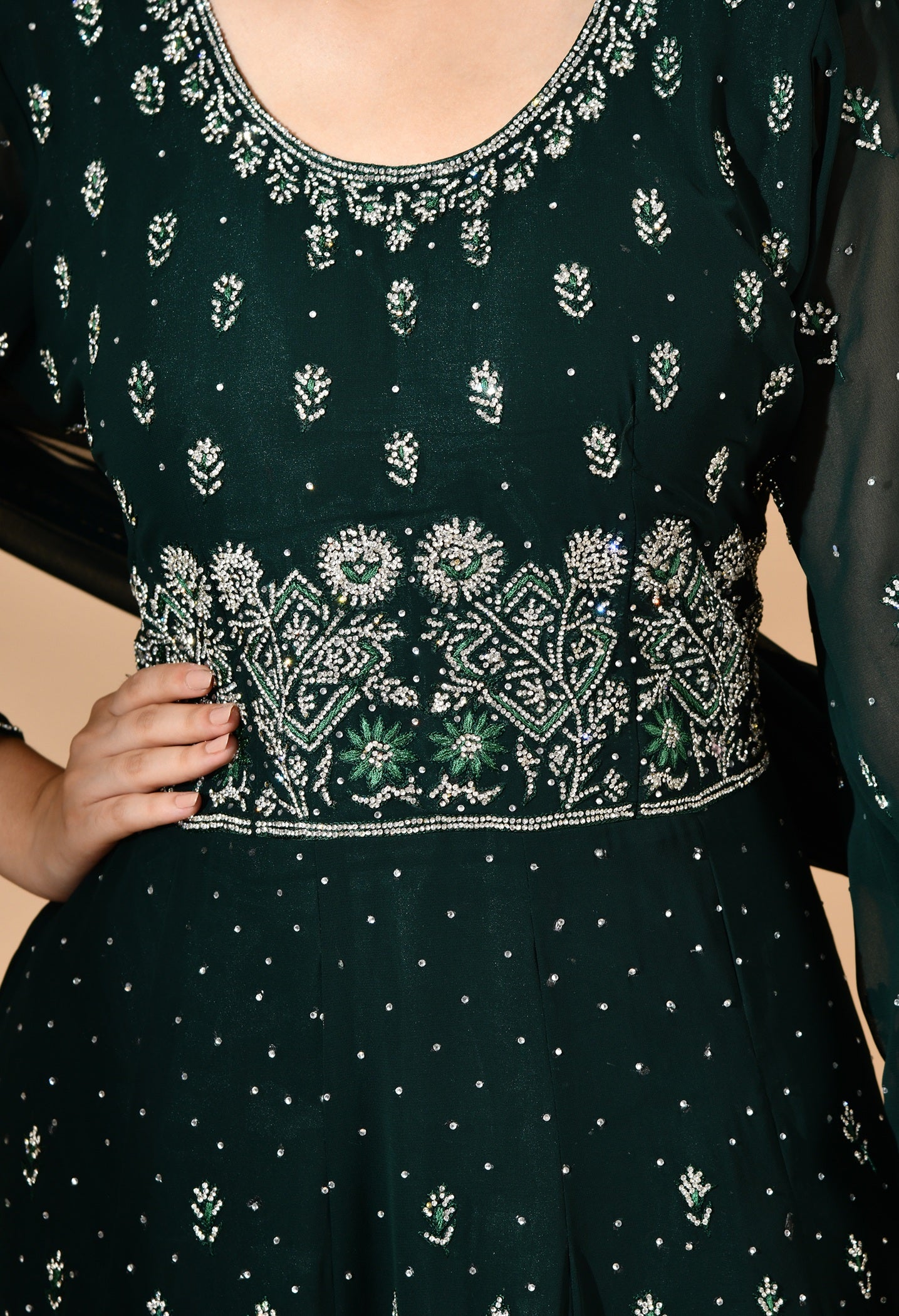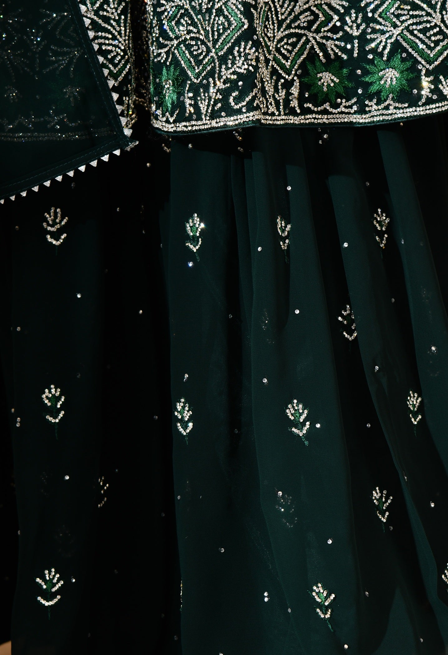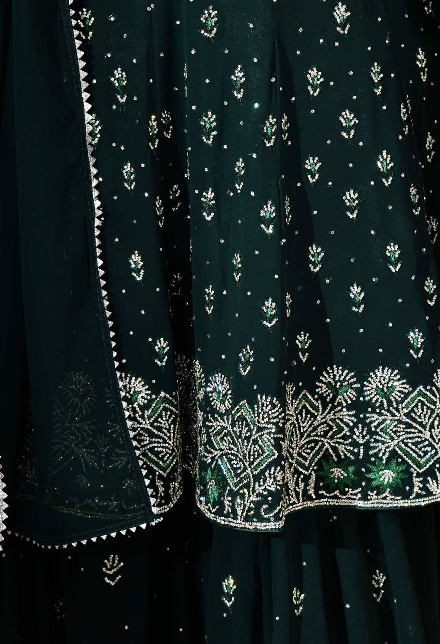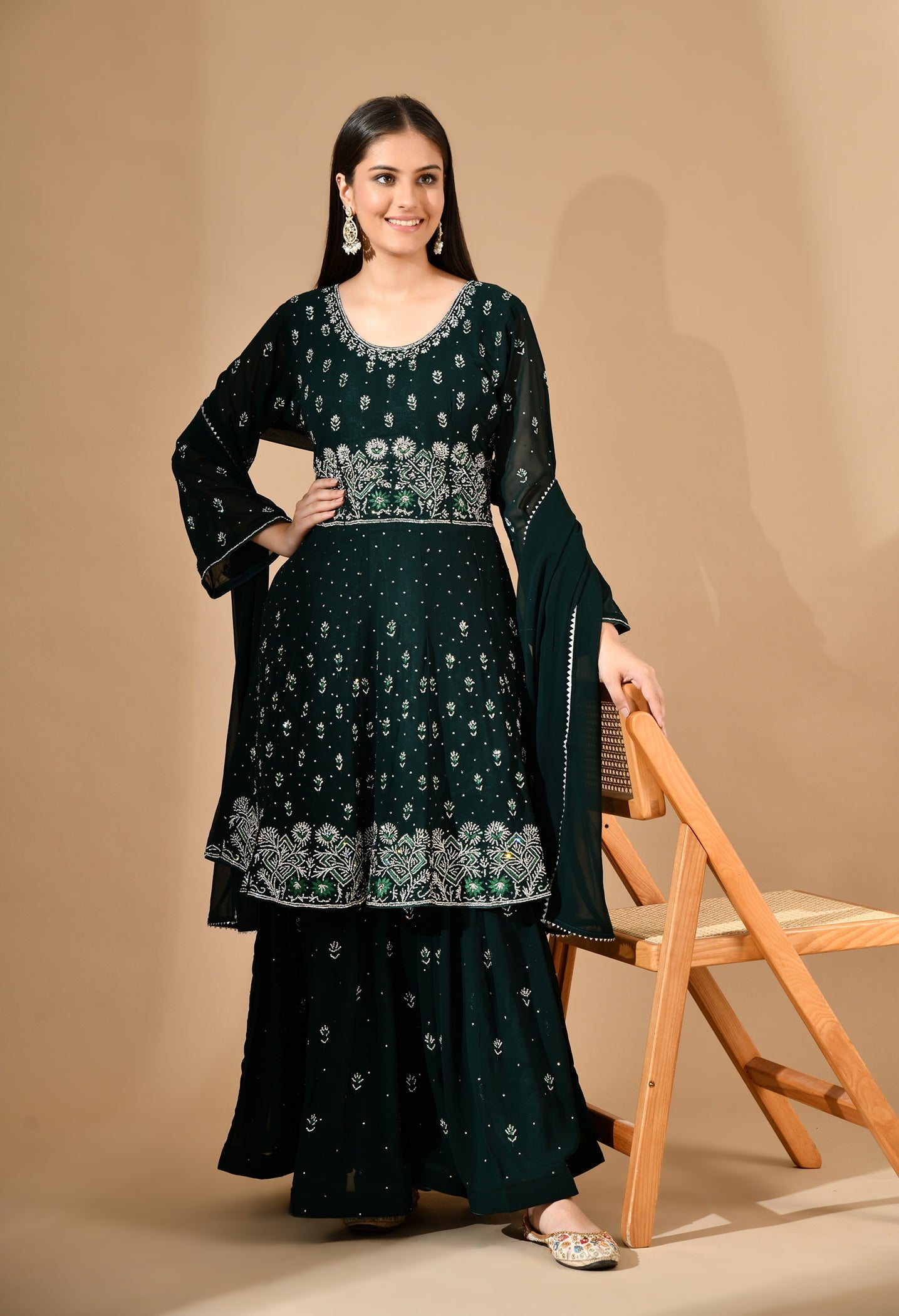 - This bottle green georgette sharara set is an effortless blend of tradition and glamour.