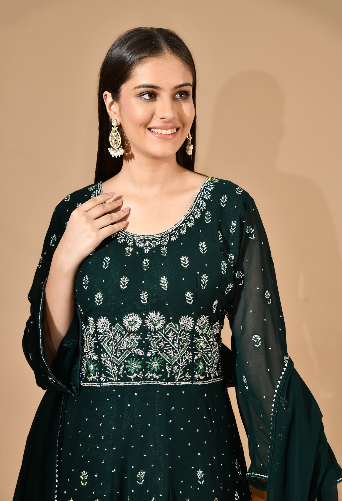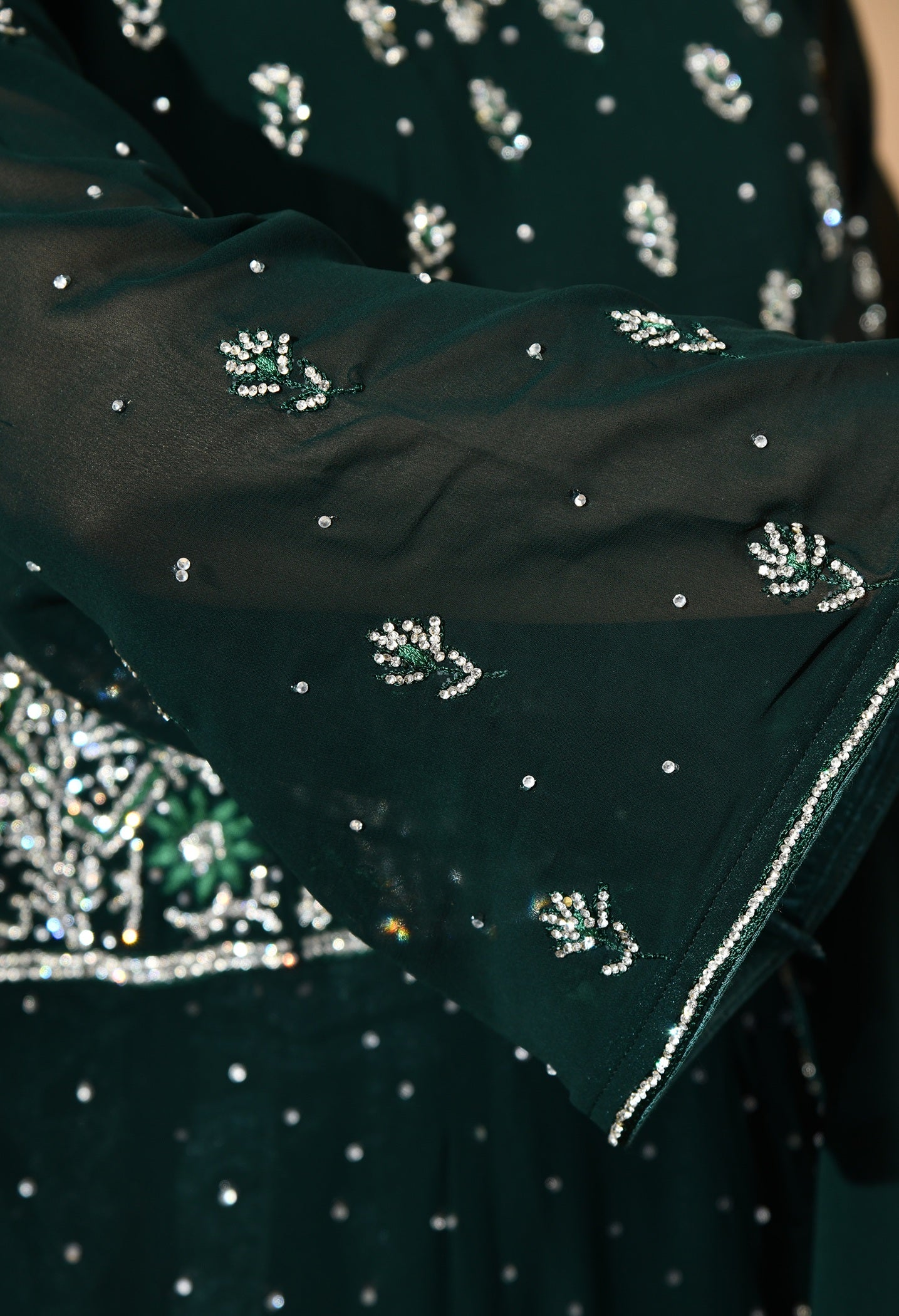 - Embellished with delicate crystal and thread embroidery, it’s flowy, festive, and perfect for occasions that call for understated sparkle and refined elegance.