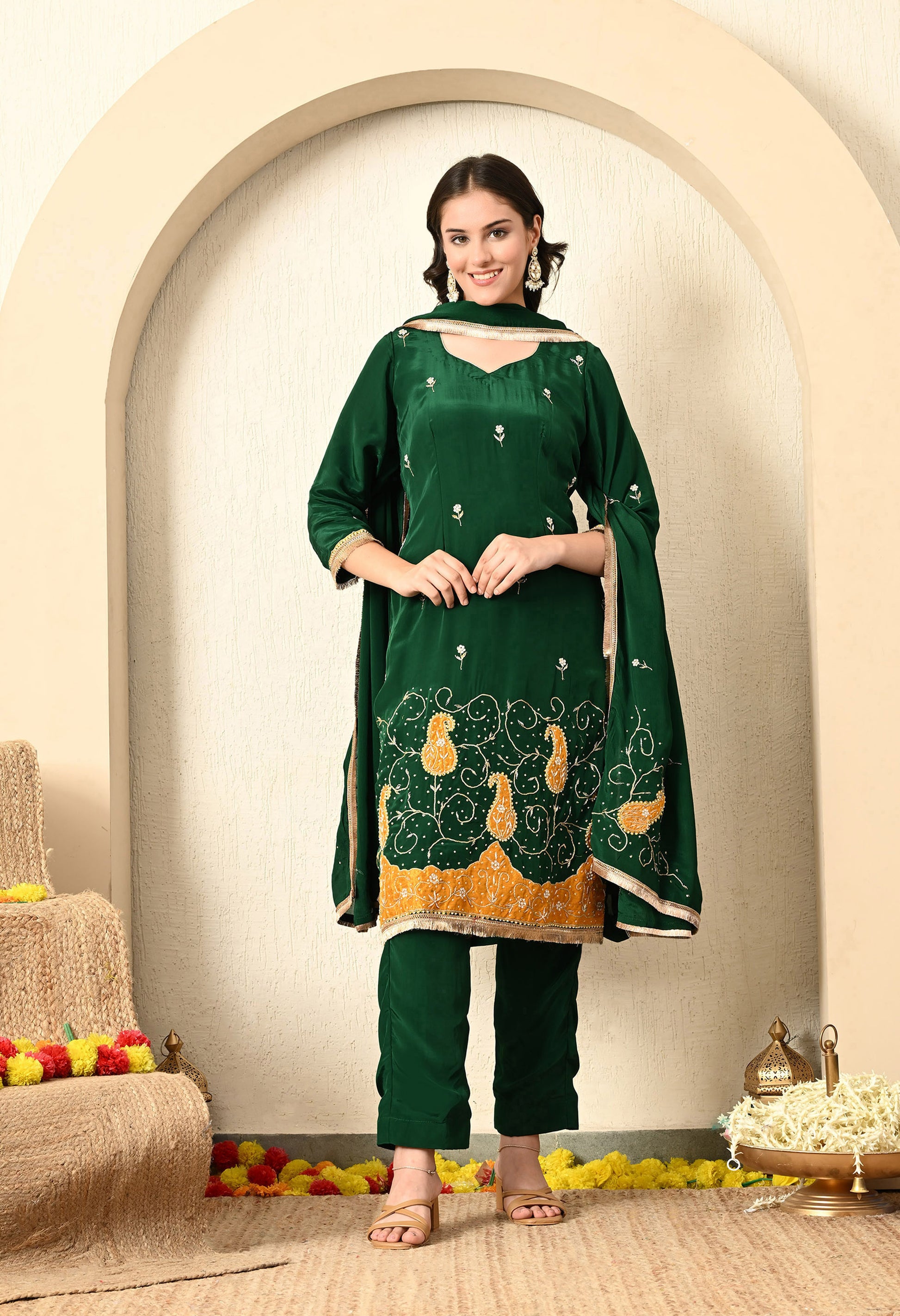 Experience timeless elegance with our bottle green kurta set. A crepe kurta and straight pants paired with a breezy chinon dupatta are beautifully embellished with Zardozi, Applique, and Sequence, while intricate embroidery adds a touch of royalty to the look.