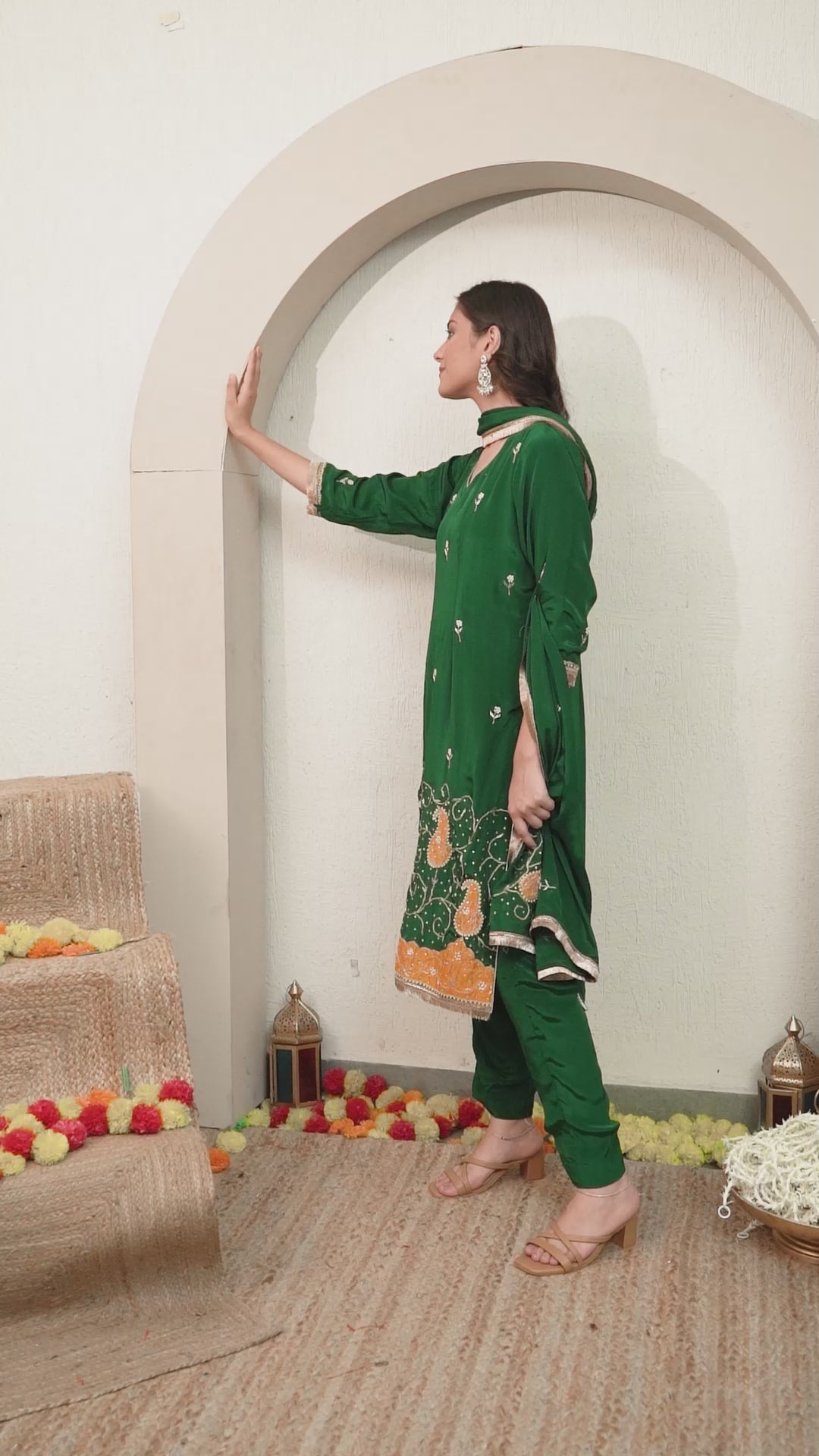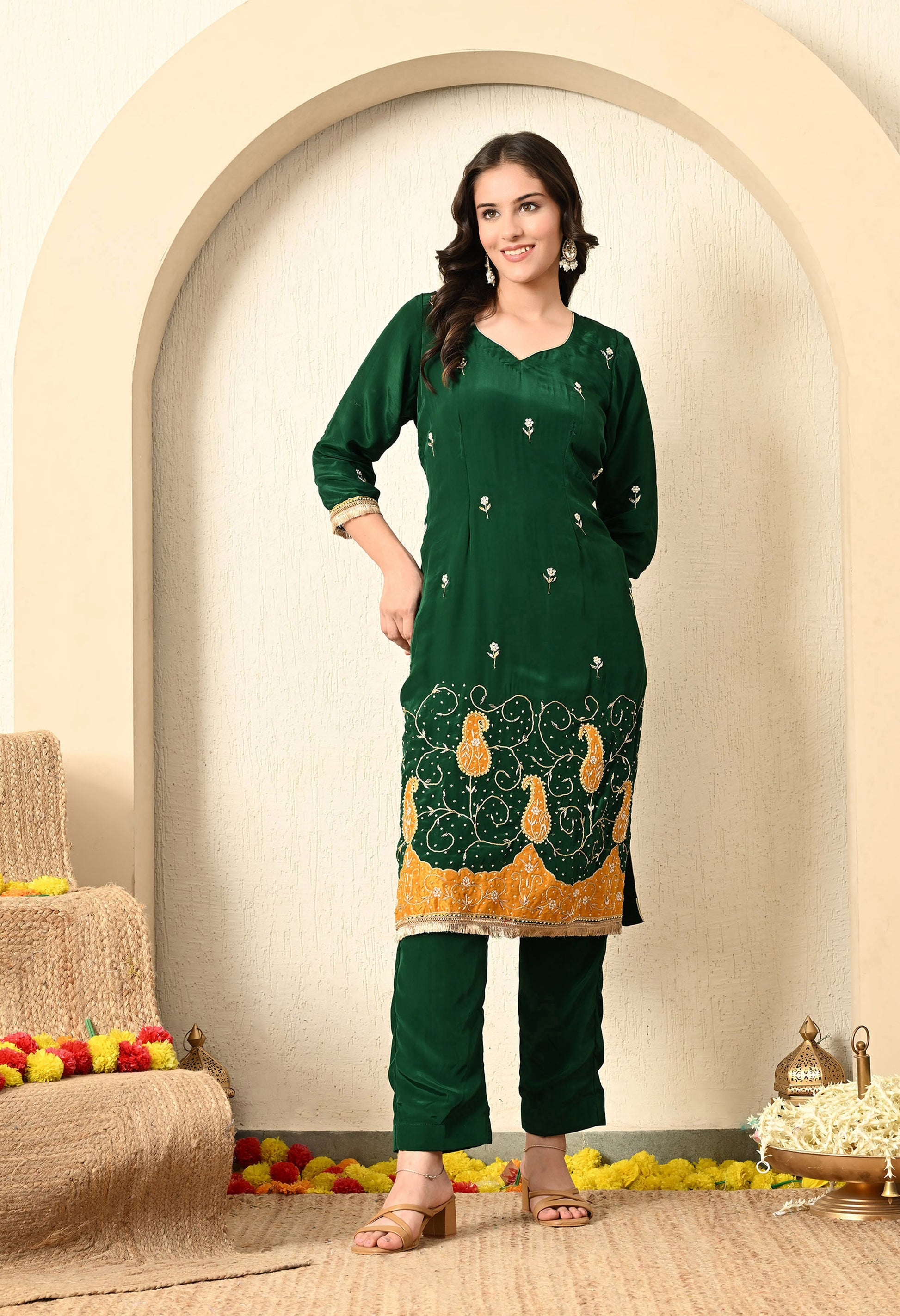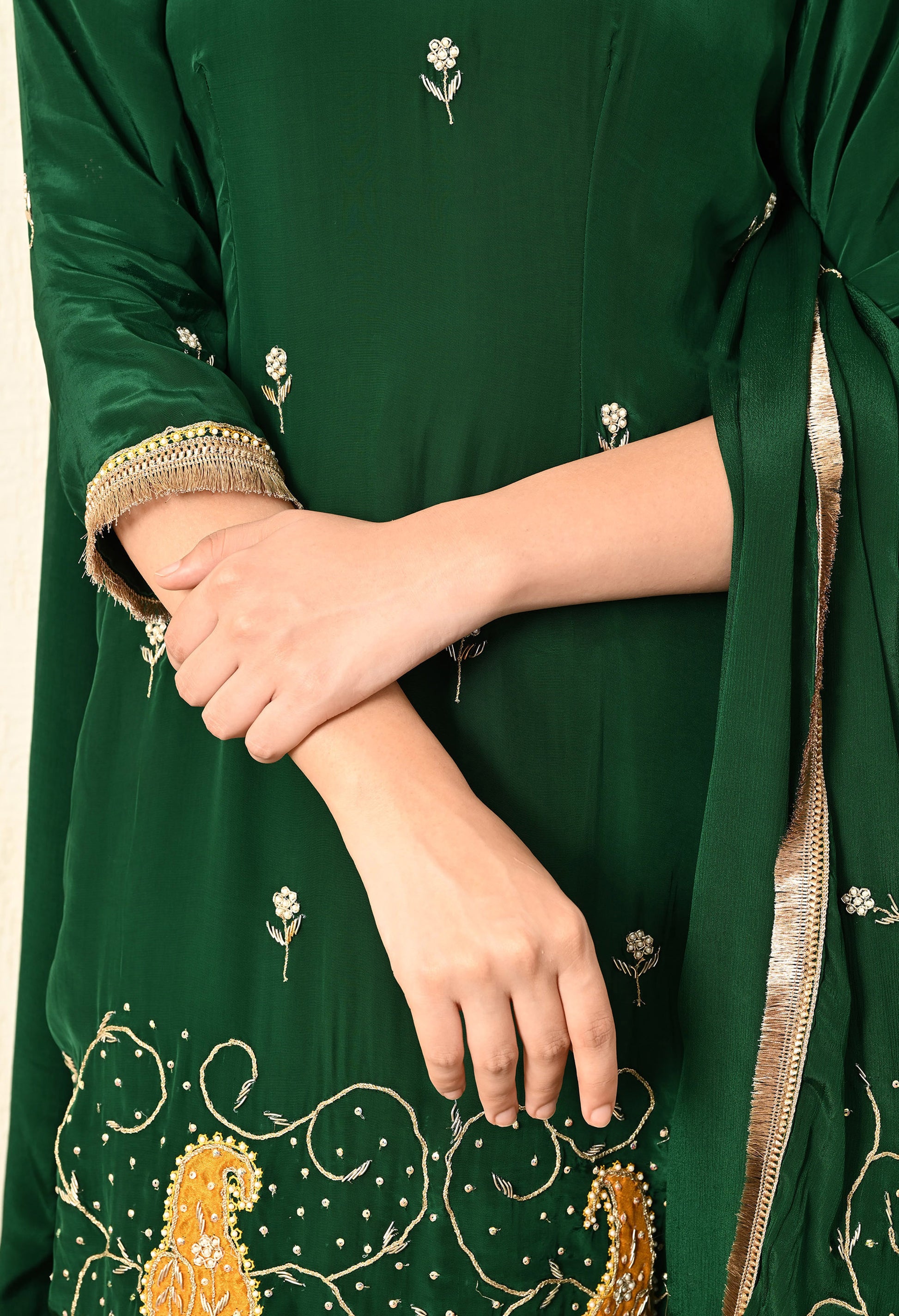 Bottle Green Kurta Set with Zardozi, Applique, and Sequence Work