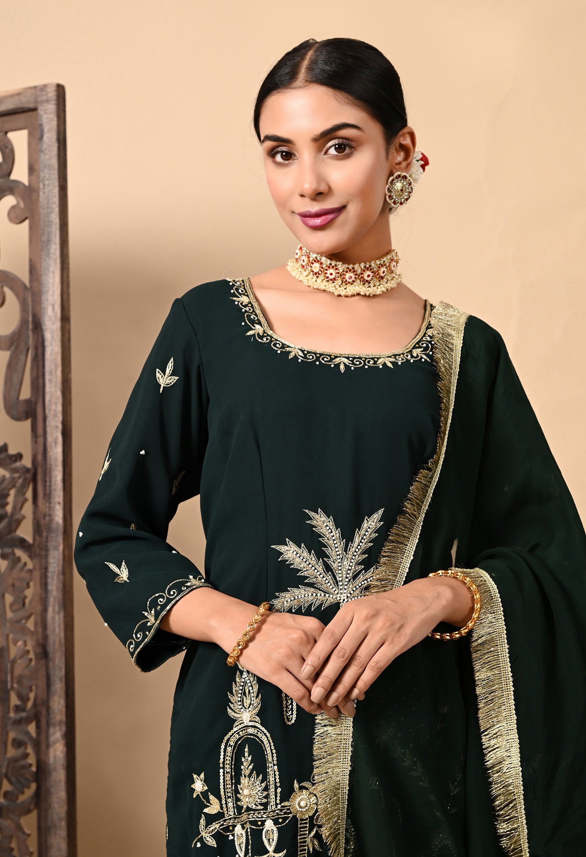 Bottle Green Kurta Set with Zardozi, Dabka, Sequin, Thread, and Pearl Work