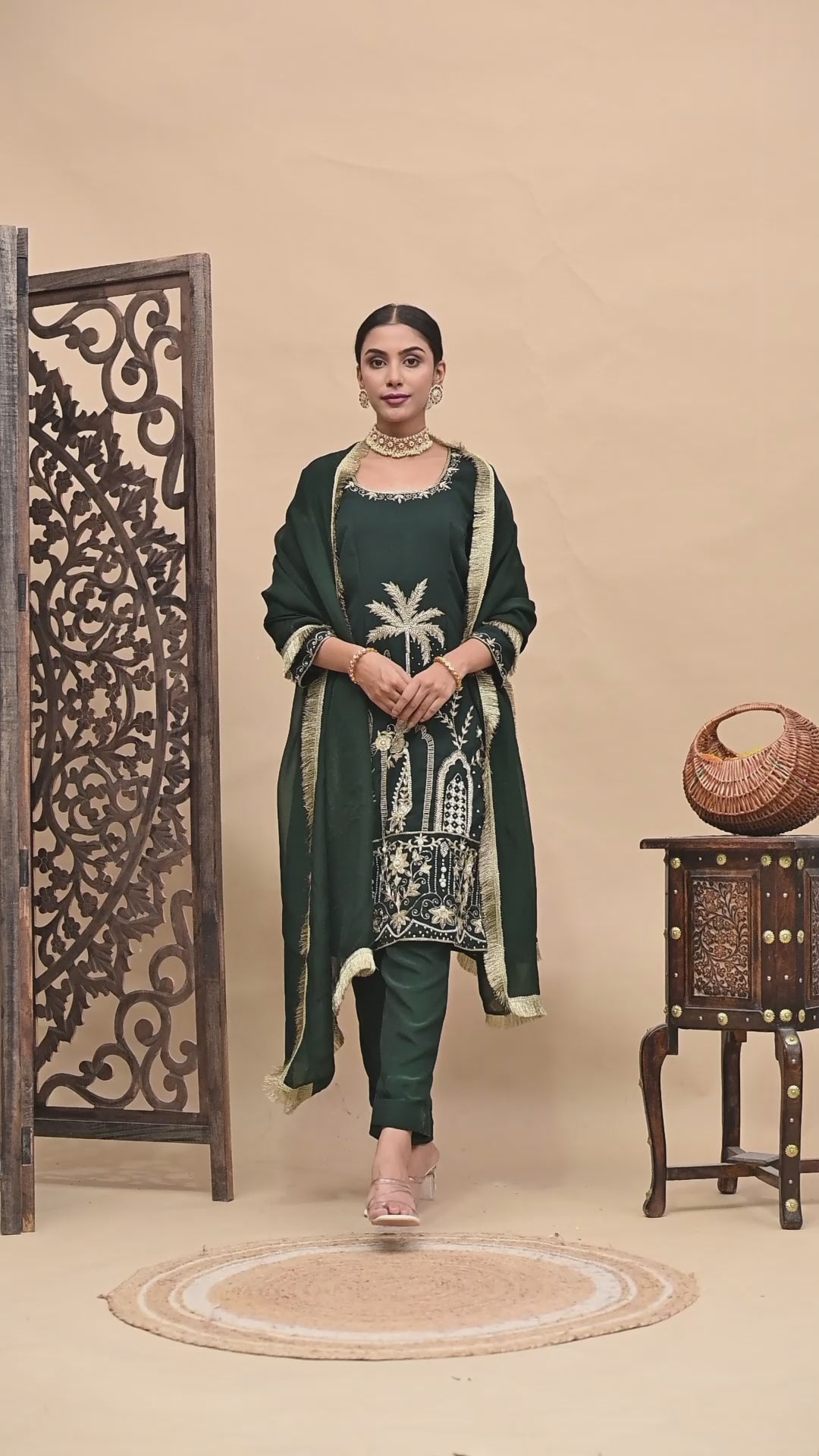 Celebrate in style with our luxurious bottle green Kurta Set, adorned with a sheer organza dupatta, an intricately embroidered georgette kurta, and a coordinating crepe bottom. The set’s delicate zardozi, dabka, sequin, thread, and pearl details highlight its ageless elegance.