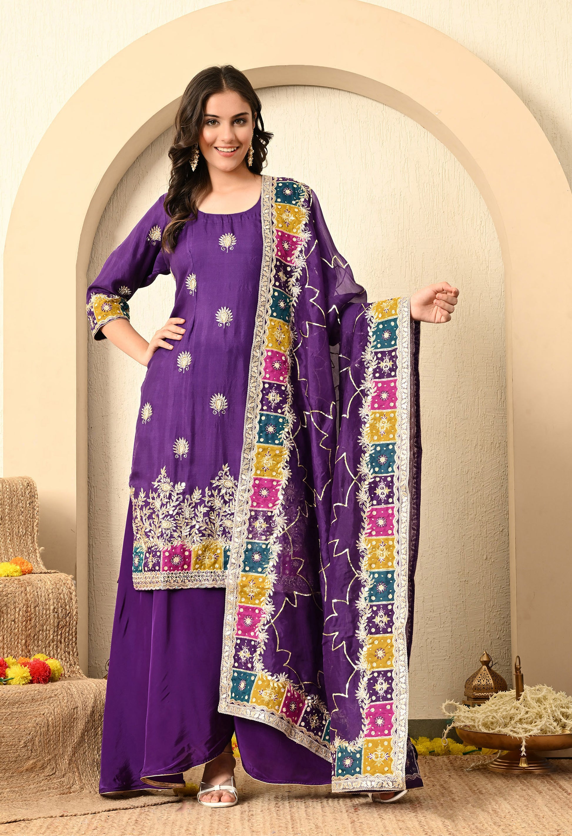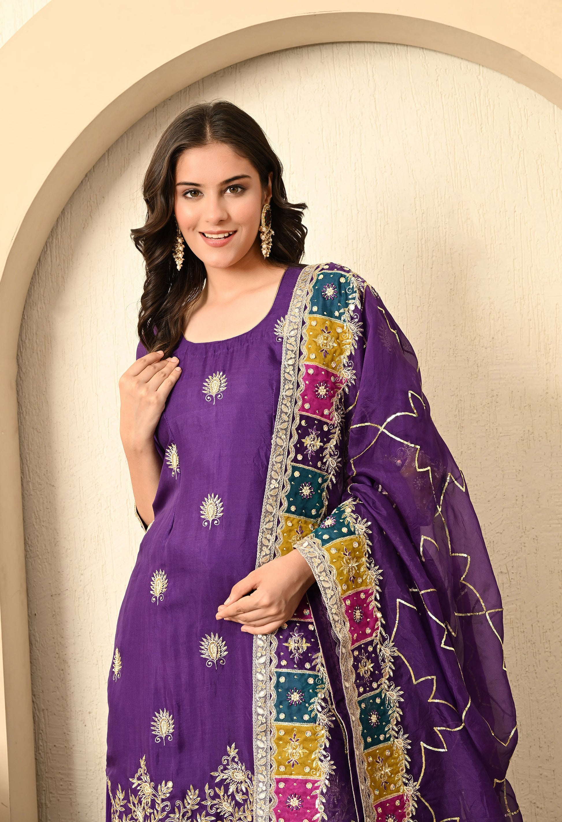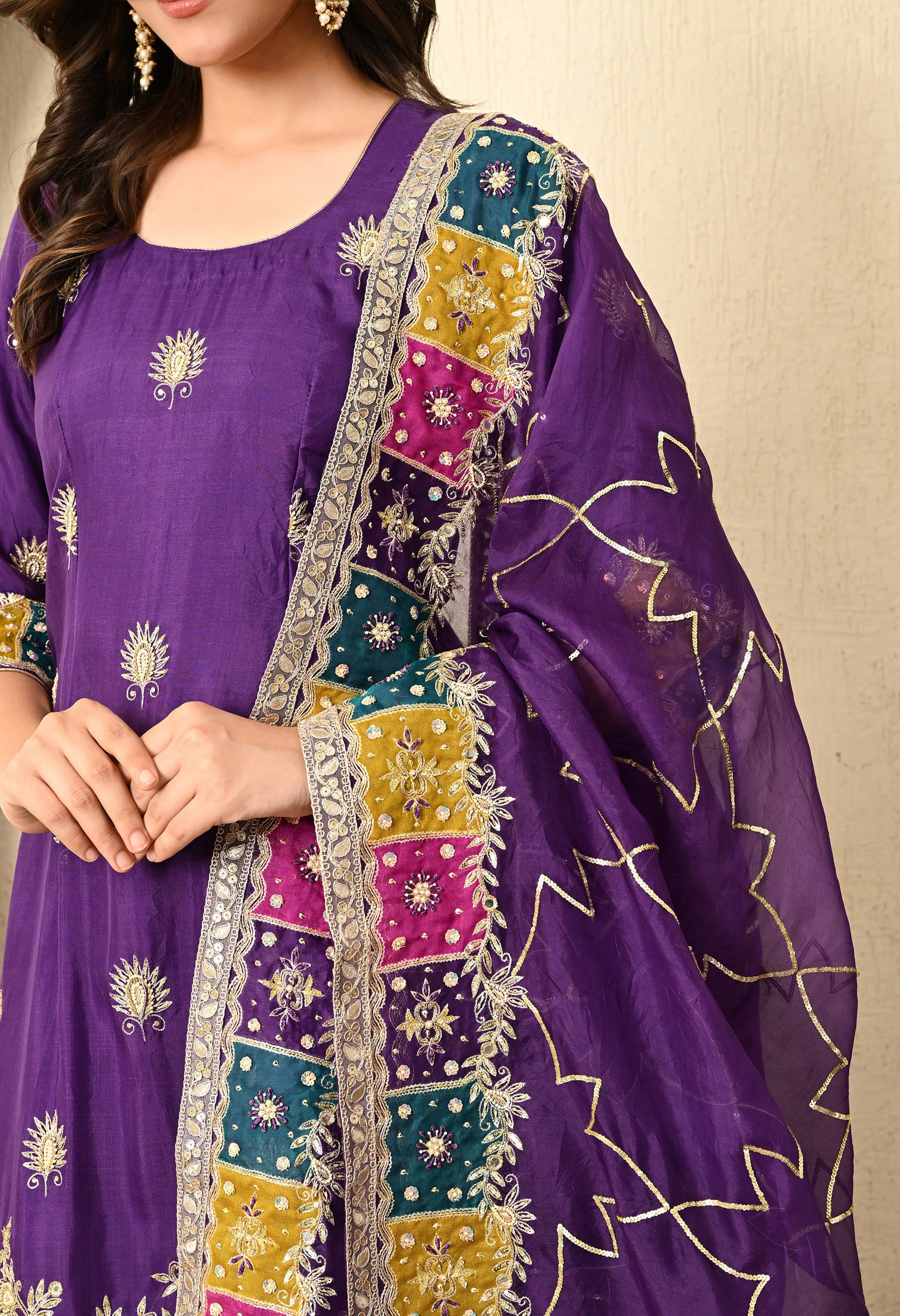 Elevate your wardrobe with our bright purple kurta set, featuring an organza kurta, crepe umbrella plazzo, and a delicate organza dupatta. Adorned with Zardozi, Sequence, Cutdana, and Naqshi, the ensemble exudes royal grace through its intricate embroidery.