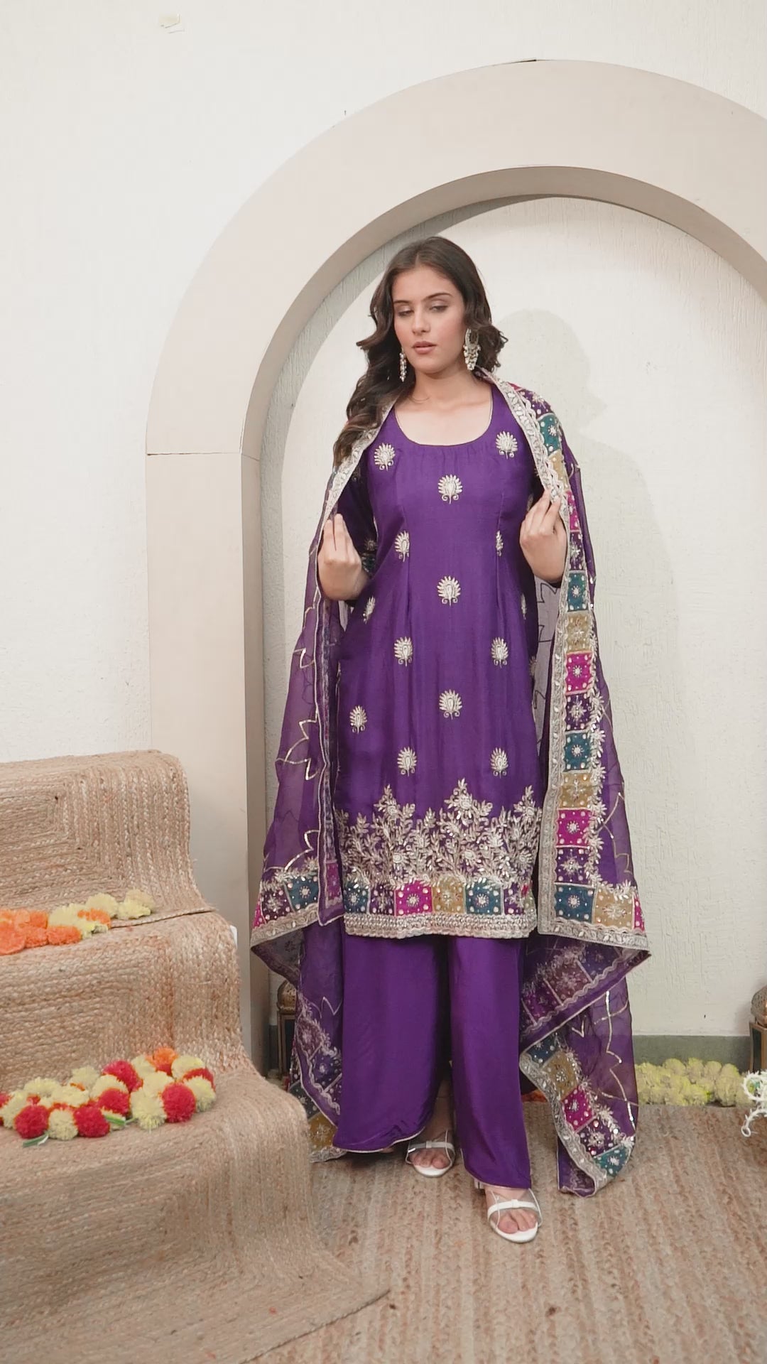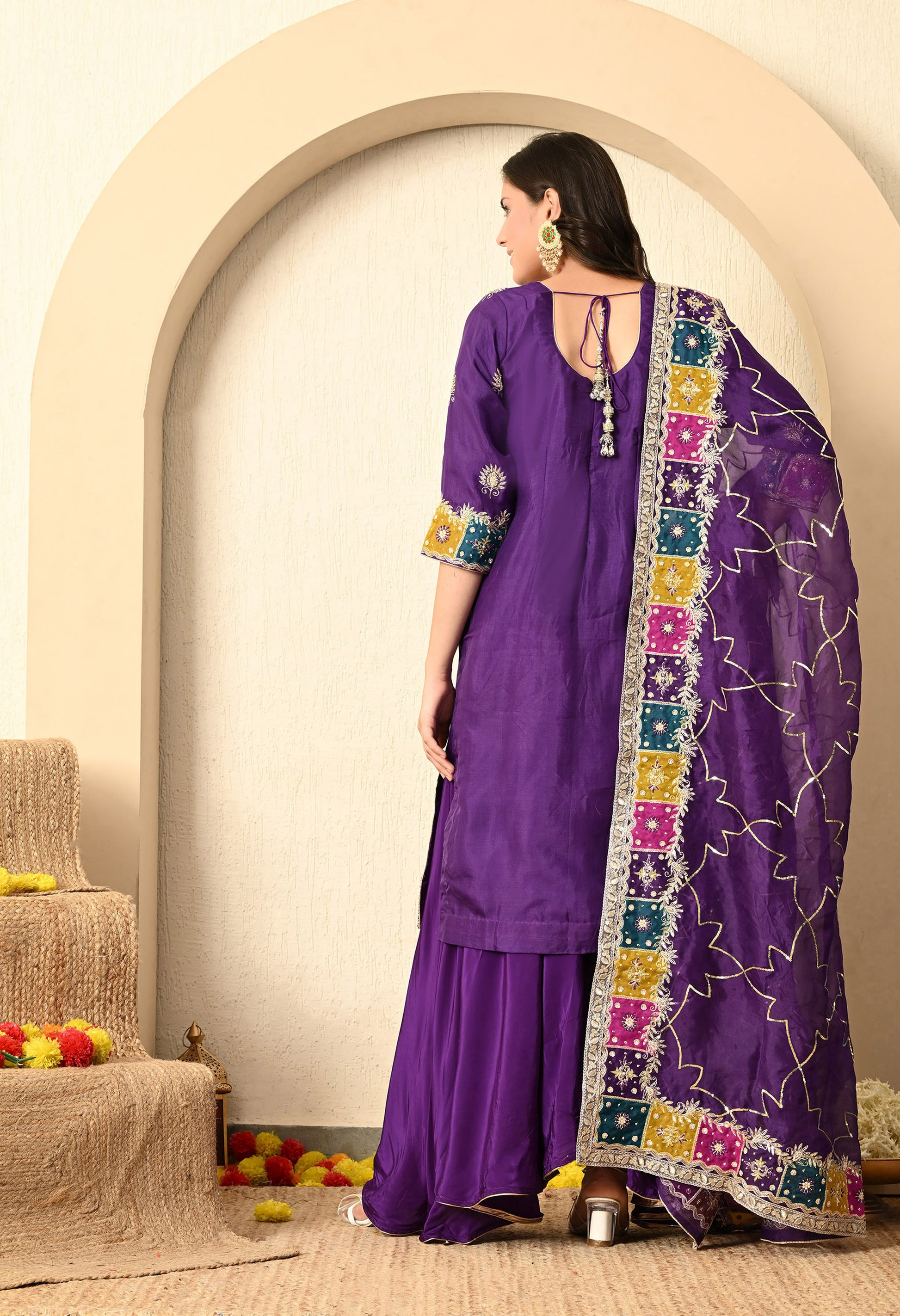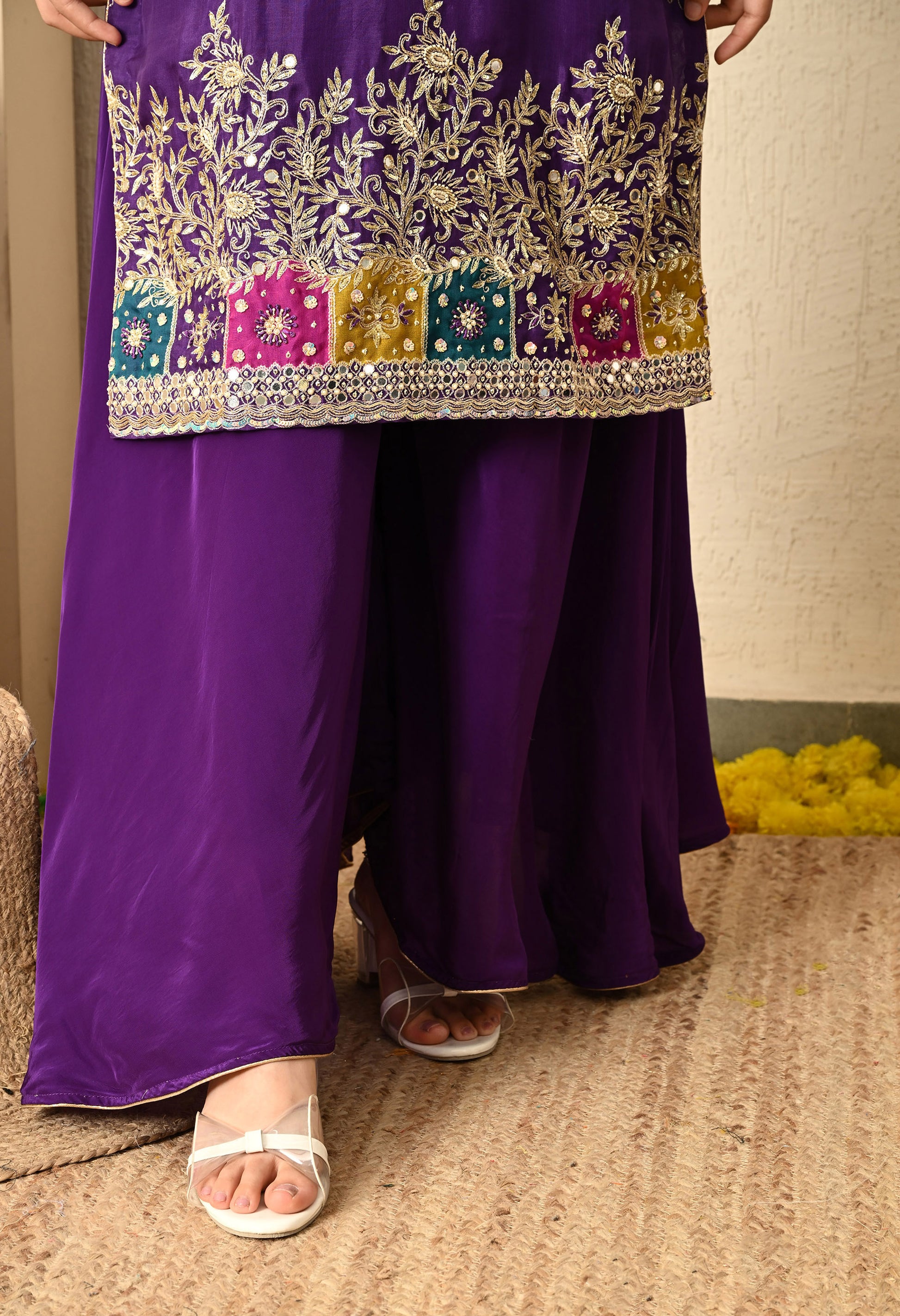 Elevate your wardrobe with our bright purple kurta set, featuring an organza kurta, crepe umbrella plazzo, and a delicate organza dupatta. Adorned with Zardozi, Sequence, Cutdana, and Naqshi, the ensemble exudes royal grace through its intricate embroidery.