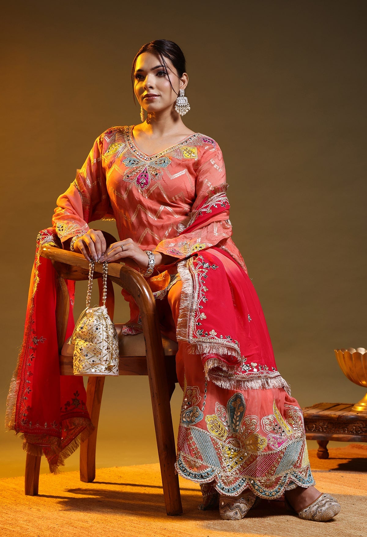 Carrot Peach Benarasi Silk & Organza Gotta–Applique–Zardozi–Mirror Sharara Set
