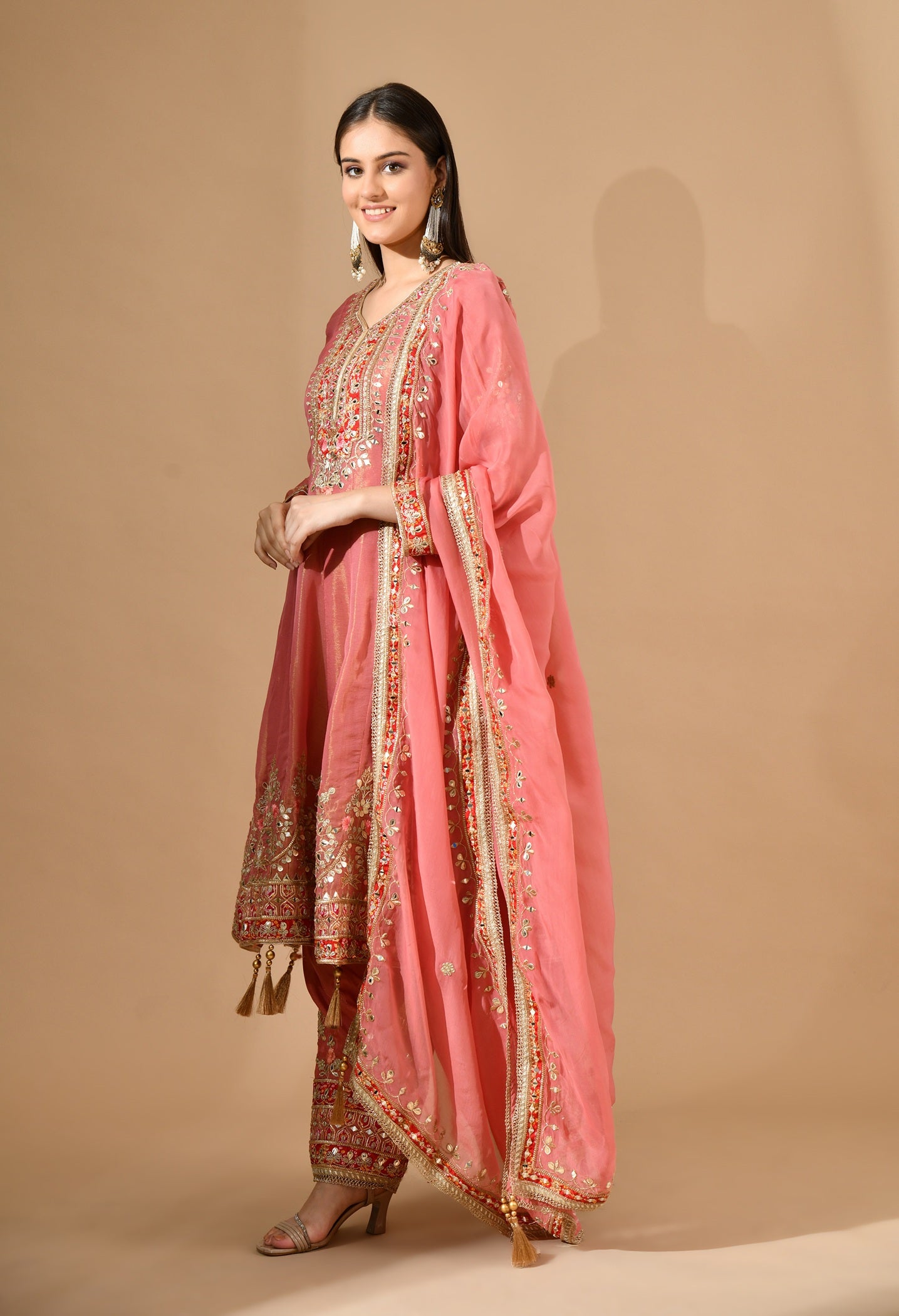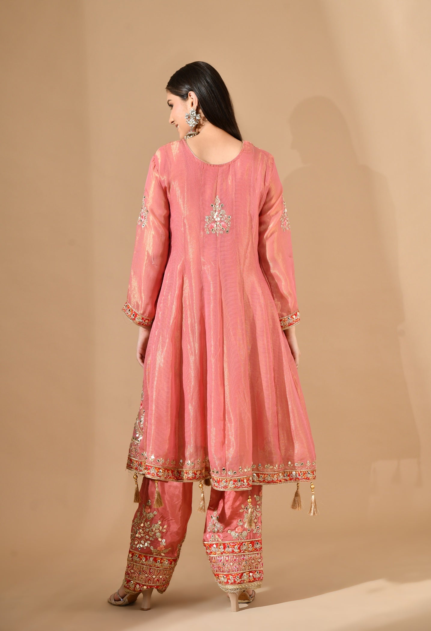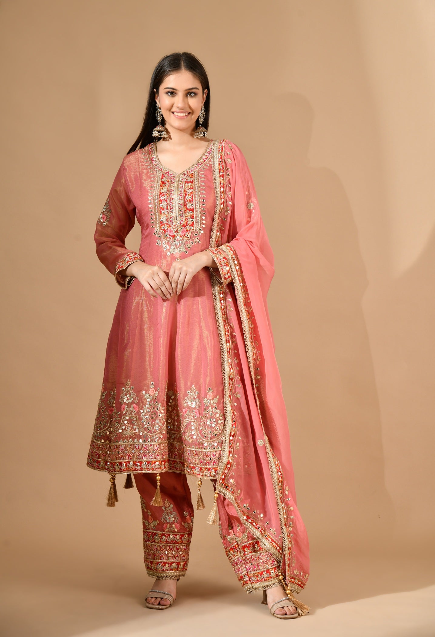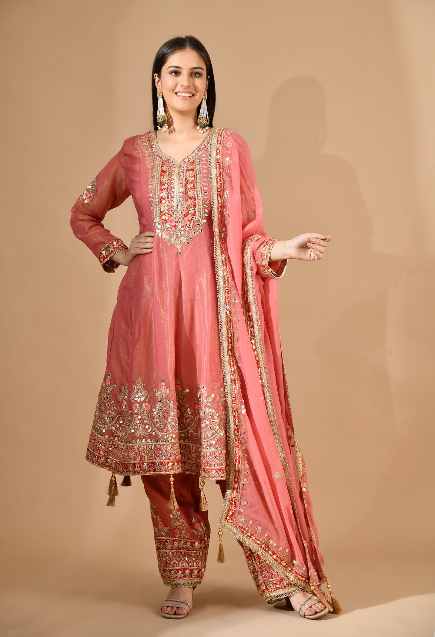 Carrot Pink Kurta Set with Gotta, Zari & Appliqué Work