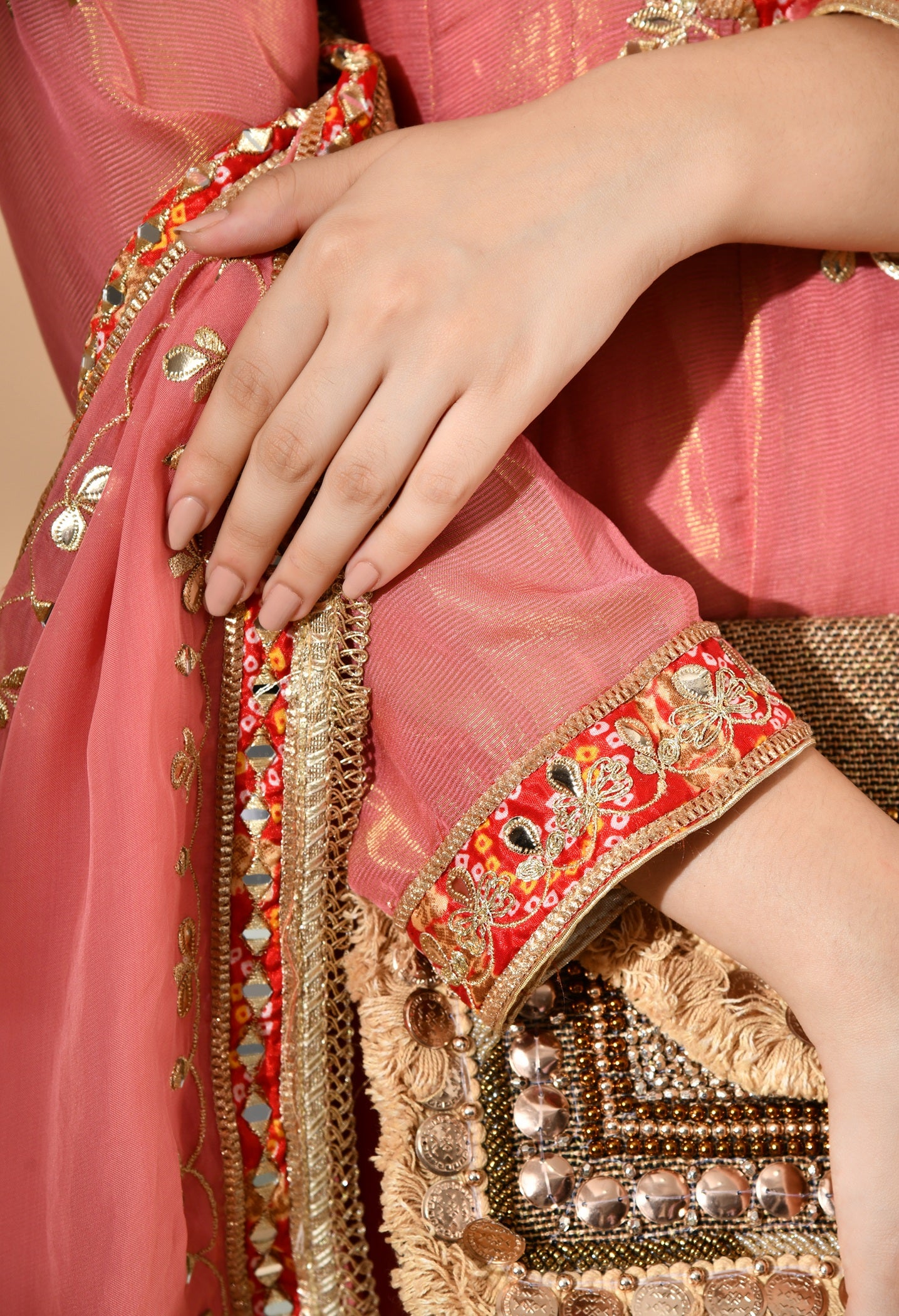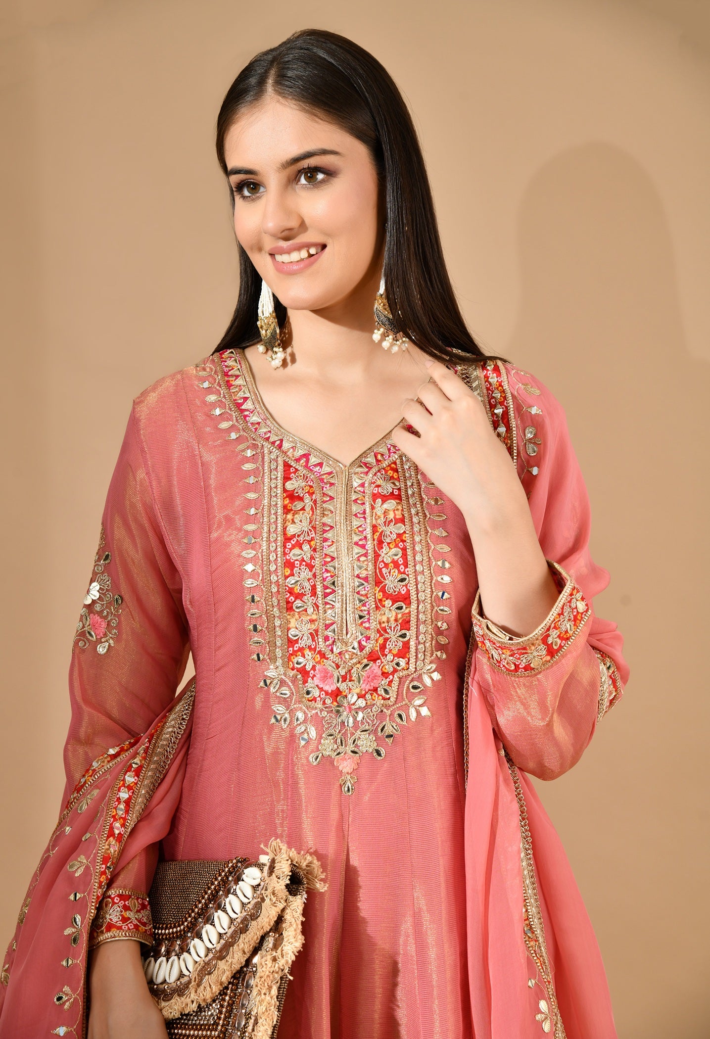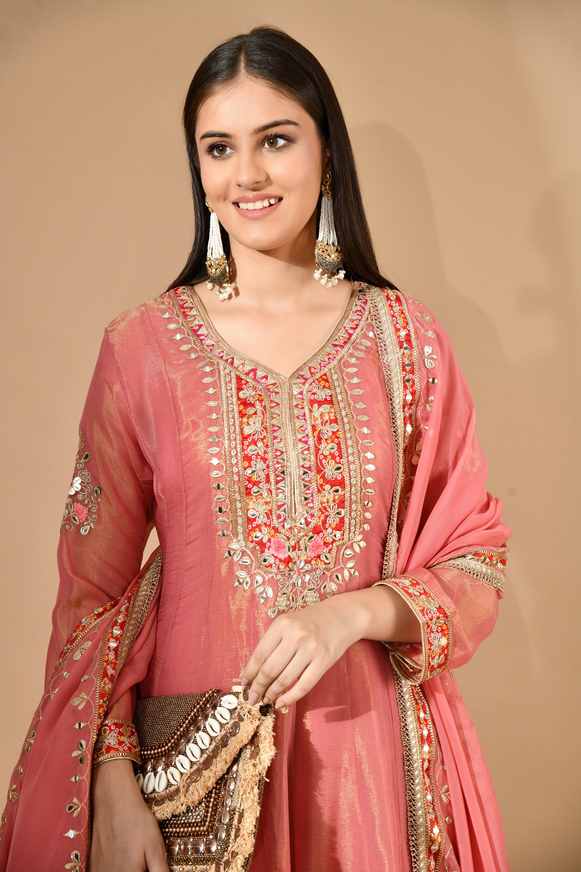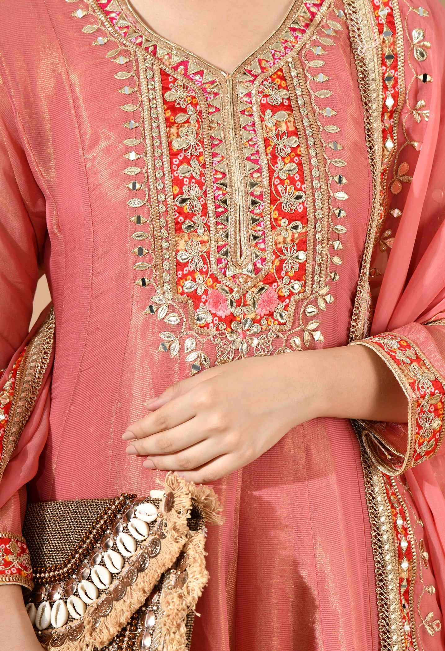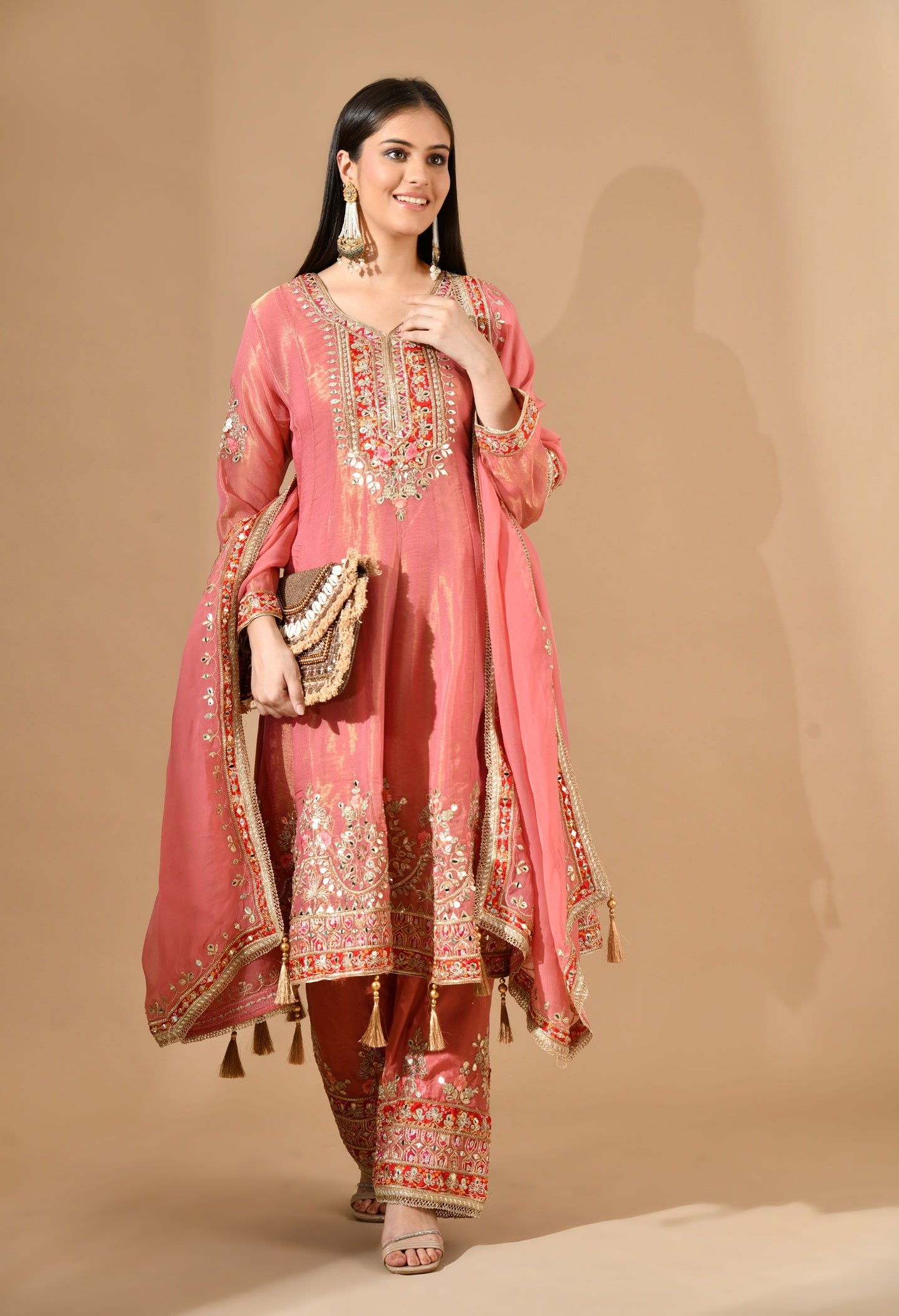 Carrot Pink Kurta Set with Gotta, Zari & Appliqué Work