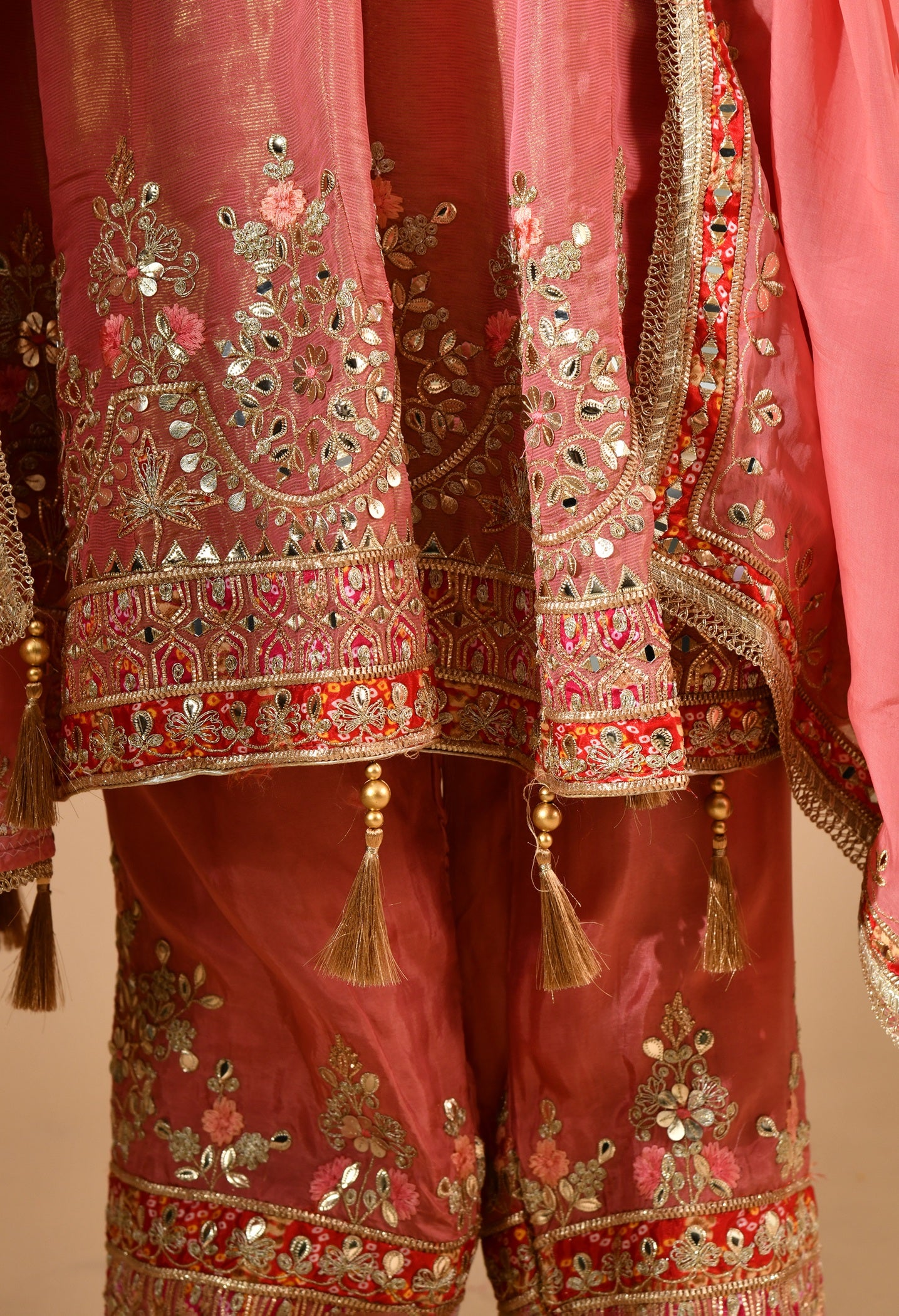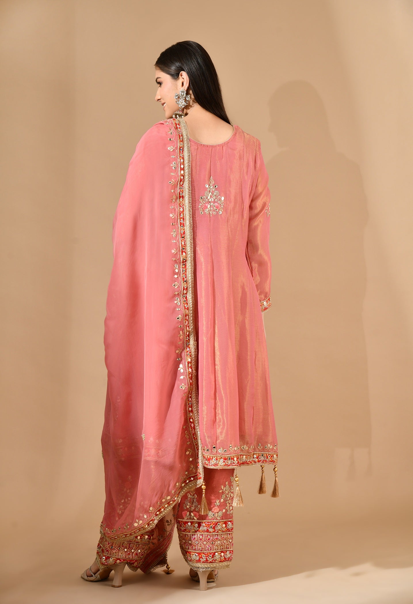 Grace meets tradition in this carrot pink kurta set with hand-done gotta, thread, and zari embroidery. Comes with organza dupatta and crepe plazo. Tailored fit. Customisable. Dry-clean only.