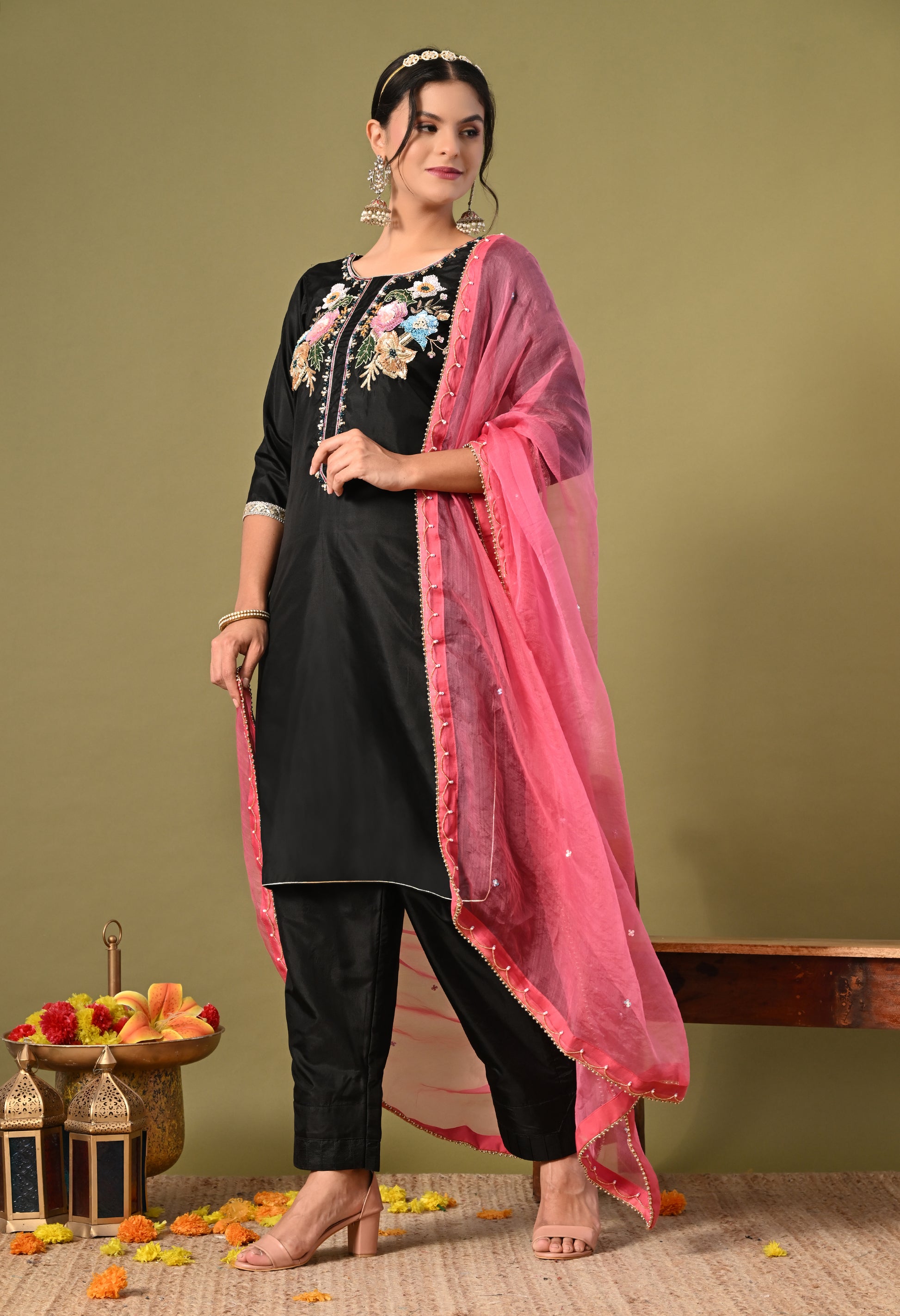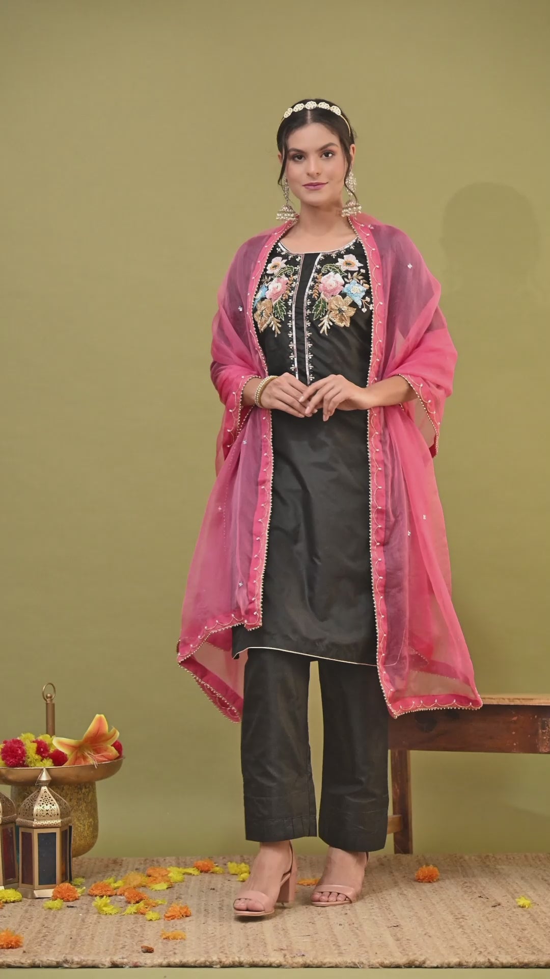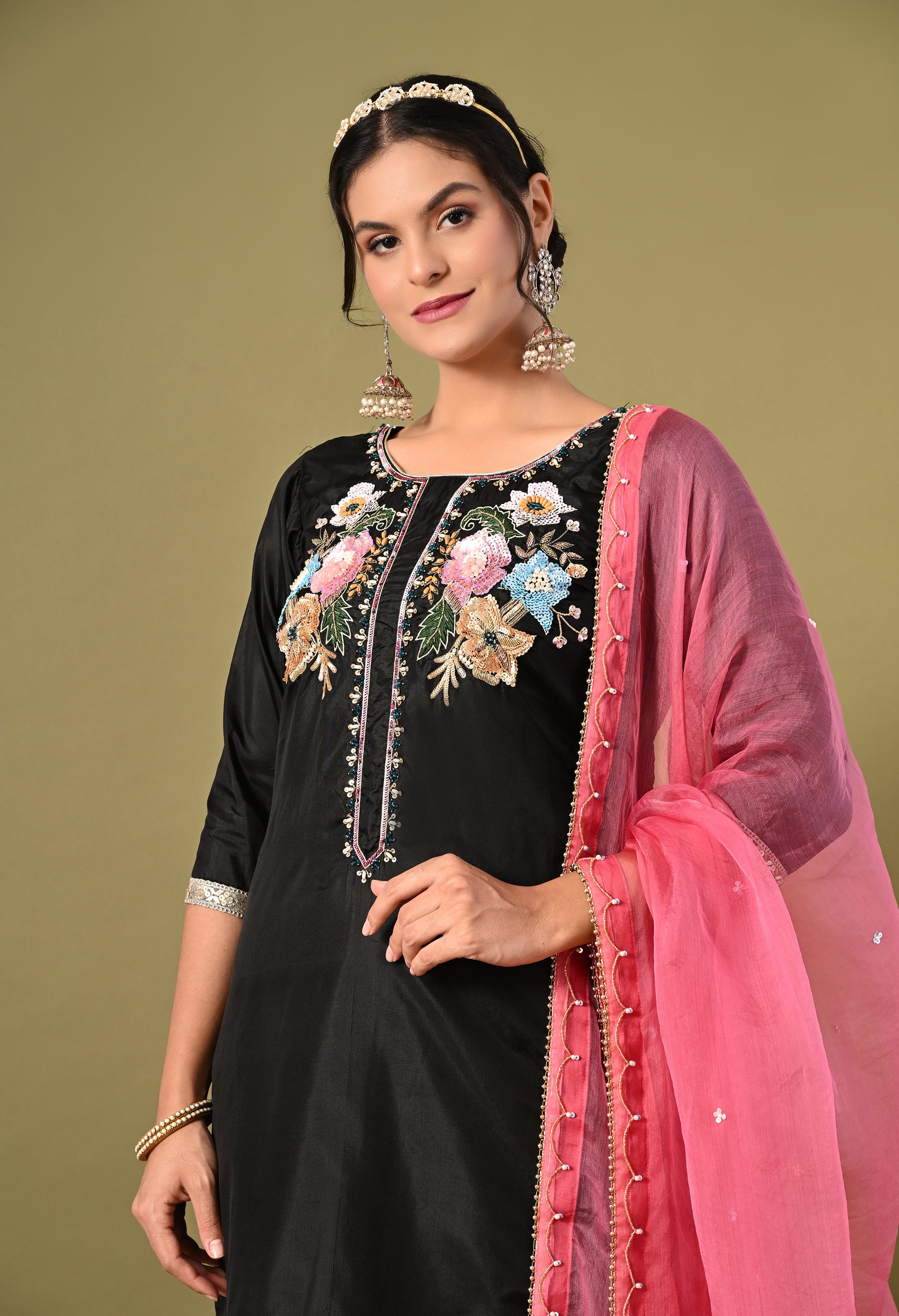 with our stunning black Kurta Set, paired with a soft, flowing organza dupatta, a beautifully detailed silk kurta, and a structured silk bottom. The shimmering embroidery of zardozi, sequin, sippi, and thread adds just the right amount of glamour. Shine on!